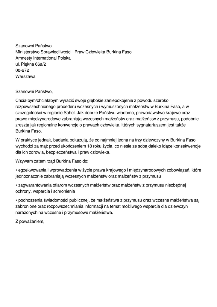 Szanowni Państwo Ministerstwo Sprawiedliwości i Praw Człowieka Burkina Faso Amnesty International Polska ul. Piękna 66a/2 00-672 Warszawa Szanowni Państwo, Chciałbym/chciałabym wyrazić swoje głębokie zaniepokojenie z powodu szeroko rozpowszechnionego procederu wczesnych i wymuszonych małżeństw w Burkina Faso, a w szczególności w regionie Sahel. Jak dobrze Państwu wiadomo, prawodawstwo krajowe oraz prawo międzynarodowe zabraniają wczesnych małżeństw oraz małżeństw z przymusu, podobnie zresztą jak regionalne konwencje o prawach człowieka, których sygnatariuszem jest także Burkina Faso. W praktyce jednak, badania pokazują, że co najmniej jedna na trzy dziewczyny w Burkina Faso wychodzi za mąż przed ukończeniem 18 roku życia, co niesie ze sobą daleko idące konsekwencje dla ich zdrowia, bezpieczeństwa i praw człowieka. Wzywam zatem rząd Burkina Faso do: • egzekwowania i wprowadzenia w życie prawa krajowego i międzynarodowych zobowiązań, które jednoznacznie zabraniają wczesnych małżeństw oraz małżeństw z przymusu • zagwarantowania ofiarom wczesnych małżeństw oraz małżeństw z przymusu niezbędnej ochrony, wsparcia i schronienia • podnoszenia świadomości publicznej, że małżeństwa z przymusu oraz wczesne małżeństwa są zabronione oraz rozpowszechniania informacji na temat możliwego wsparcia dla dziewczyn narażonych na wczesne i przymusowe małżeństwa. Z poważaniem, Szanowni Państwo Ministerstwo Sprawiedliwości i Praw Człowieka Burkina Faso Amnesty International Polska ul. Piękna 66a/2 00-672 Warszawa Dear Minister, I am deeply concerned about the widespread practice of early and forced marriage in Burkina Faso, and particularly the Sahel region. As you will know, early and forced marriage is banned under your country’s laws, as well as under international and regional human rights treaties to which Burkina Faso is party. But in practice, studies have shown that at least one third of girls in Burkina Faso are married before the age of 18, with far-reaching consequences for their health, safety and human rights. Minister, I urge your government to: • Enforce and ensure the application of national laws and international obligations banning forced and early marriage. • Guarantee protection as well as shelter and support services for victims of early and forced marriages. • Raise awareness in the population about the ban on forced and early marriage, and also about where girls can find assistance if they are at risk. Yours sincerely, Powered by TCPDF (www.tcpdf.org)