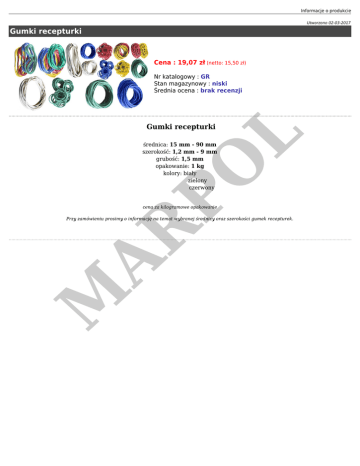 Informacje o produkcie Utworzono 02-03-2017 Gumki recepturki Cena : 19,07 zł (netto: 15,50 zł) Nr katalogowy : GR Stan magazynowy : niski Średnia ocena : brak recenzji PO L Gumki recepturki średnica: 15 mm - 90 mm szerokość: 1,2 mm - 9 mm grubość: 1,5 mm opakowanie: 1 kg kolory: biały zielony czerwony cena za kilogramowe opakowanie M AR Przy zamówieniu prosimy o informację na temat wybranej średnicy oraz szerokości gumek recepturek.