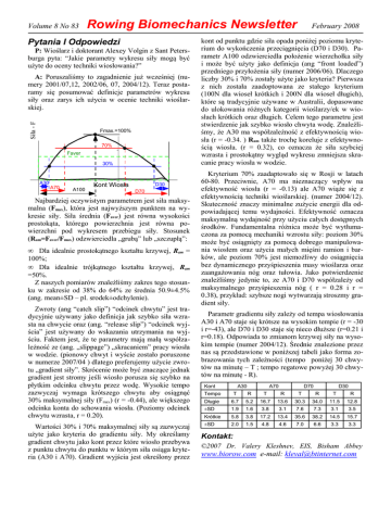 Volume 8 No 83 Rowing Biomechanics Newsletter Pytania I Odpowiedzi P: Wioślarz i doktorant Alexey Volgin z Sant Petersburga pyta: “Jakie parametry wykresu siły mogą być użyte do oceny techniki wiosłowania?” Siła - F A: Poruszaliśmy to zagadnienie już wcześniej (numery 2001/07,12, 2002/06, 07, 2004/12). Teraz postaramy się posumować definicje parametrów wykresu siły oraz zarys ich użycia w ocenie techniki wioślarskiej. Fmax.=100% 70% Faver 30% A30 A70 A100 D30 Kont Wiosła D70 Najbardziej oczywistym parametrem jest siła maksymalna (Fmax), która jest najwyższym punktem na wykresie siły. Siła średnia (Faver) jest równa wysokości prostokąta, którego powierzchnia jest równa powierzchni pod wykresem przebiegu siły. Stosunek (Ram=Faver/Fmax) odzwierciedla „grubą” lub „szczupłą”: • Dla idealnie prostokątnego kształtu krzywej, Ram = 100%; • Dla idealnie trójkątnego kształtu krzywej, Ram =50%. Z naszych pomiarów znaleźliśmy zakres tego stosunku w zakresie od 38% do 64% ze średnia 50.9±4.5% (ang. mean±SD – pl. srodek±odchylenie). Zwroty (ang “catch slip”) “odcinek chwytu” jest tradycyjnie używany jako definicja jak szybko siła wzrasta na chwycie oraz (ang. “release slip”) “odcinek wyjścia” jest używany do wskazania utrzymania na wyjściu. Faktem jest, że te parametry mają małą współzależność ze (ang. „slippage”) „skracaniem” pracy wiosła w wodzie. (pionowy chwyt i wyście zostało poruszone w numerze 2007/04 ) dlatego preferujemy użycie zwrotu „gradient siły”. Skrócenie może być znaczące jednak gradient jest stromy jeśli wiosło porusza się szybko na płytkim odcinku chwytu przez wodę. Wysokie tempo zazwyczaj wymaga krótszego chwytu aby osiągnąć 30% maksymalnej siły (Fmax) (r = -0.44), ale większego odcinka konta do schowania wiosła. (Poziomy odcinek chwytu wzrasta, r = 0.20). Wartości 30% i 70% maksymalnej siły są zazwyczaj użyte jako kryteria do gradientu siły. My określamy gradient chwytu jako kont przez które wiosło przebywa z punktu chwytu do punktu w którym siła osiąga kryteria (A30 i A70). Gradient wyjścia jest określony przez February 2008 kont od punktu gdzie siła opada poniżej poziomu kryterium do wykończenia przeciągnięcia (D70 i D30). Parametr A100 odzwierciedla położenie wierzchołka siły i może być użyty jako definicja (ang “front loaded”) przedniego przyłożenia siły (numer 2006/06). Dlaczego liczby 30% i 70% zostały użyte jako kryteria? Pierwsza z nich została zaadoptowana ze stałego kryterium (100N dla wioseł krótkich i 200N dla wioseł długich), które są tradycyjnie używane w Australii, dopasowane do ulokowania różnych kategorii wioślarzy/ek w wiosłach krótkich oraz długich. Celem tego parametru jest stwierdzenie jak szybko wiosło chwyta wodę. Znaleźliśmy, że A30 ma współzależność z efektywnością wiosła (r = -0.34. ) Ram także trochę koreluje z efektywnością wiosła. (r = 0.32), co oznacza że siła szybciej wzrasta i prostokątny wygląd wykresu zmniejsza skracanie pracy wiosła w wodzie. Kryterium 70% zaadaptowało się w Rosji w latach 60-80. Przeciwnie, A70 ma nieznaczący wpływ na efektywność wiosła (r = -0.13) ale A70 wiąże się z efektywnością techniki wioślarskiej. (numer 2004/12). Skuteczność znaczy minimalne zużycie energii dla odpowiadającej temu wydajności. Efektywność oznacza maksymalną wydajność przy użyciu całych dostępnych środków. Fundamentalna różnica może być wytłumaczona za pomocą mechaniki wzrostu siły: poziom 30% może być osiągnięty za pomocą dobrego manipulowania wiosłem oraz użycia małych mięśni ramion i barków, ale poziom 70% jest niemożliwy do osiągnięcia bez dynamicznego przyśpieszenia masy wioślarza oraz zaangażowania nóg oraz tułowia. Jako potwierdzenie znaleźliśmy jedynie to, ze A70 i D70 współzależy od maksymalnego przyśpieszenia nóg ( r = 0.28 i r = 0.38), przykład: szybsze nogi wytwarzają stroszmy gradient siły. Parametr gradientu siły zależy od tempa wiosłowania A30 i A70 staje się krótsze na wysokim tempie (r = -30 i r=-43), ale D70 i D30 staje się nieco dłuższe (r=0.21 i r=0.18). Odpowiada to zmianom krzywej siły na wysokim tempie (numer 2004/12). Średnie znalezione przez nas są przedstawione w poniższej tabeli jako forma zobrazowania tych zależności (tempo poniżej 30 chwytów na minutę – T ; tempo regatowe powyżej 30 chwytów na minutę - R). Kont A30 A70 D70 D30 Tempo T R T R T R T R Długie 6.7 5.2 16.7 13.6 30.3 34.0 11.5 12.8 ±SD 1.9 1.6 3.8 3.1 7.6 7.3 3.1 3.5 Krótkie 5.8 3.8 17.2 13.4 35.6 38.2 14.5 15.7 ±SD 2.0 1.5 4.8 4.6 7.0 6.6 3.3 3.3 Kontakt: ©2007 Dr. Valery Kleshnev, EIS, Bisham Abbey www.biorow.com e-mail: [email protected]