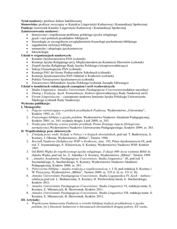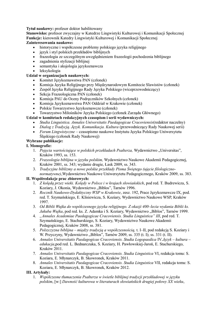 Tytuł naukowy: profesor doktor habilitowany Stanowisko: profesor zwyczajny w Katedrze Lingwistyki Kulturowej i Komunikacji Społecznej Funkcje: kierownik Katedry Lingwistyki Kulturowej i Komunikacji Społecznej Zainteresowania naukowe: historyczne i współczesne problemy polskiego języka religijnego język i styl polskich przekładów biblijnych frazeologia ze szczególnym uwzględnieniem frazeologii pochodzenia biblijnego zagadnienia stylizacji biblijnej semantyka i aksjologia językoznawcza leksykologia Udział w organizacjach naukowych: Komitet Językoznawstwa PAN (członek) Komisja Języka Religijnego przy Międzynarodowym Komitecie Slawistów (członek) Zespół Języka Religijnego Rady Języka Polskiego (wiceprzewodniczący) Sekcja Frazeologiczna PAN (członek) Komisja PAU do Oceny Podręczników Szkolnych (członek) Komisja Językoznawstwa PAN Oddział w Krakowie (członek) Polskie Towarzystwo Językoznawcze (członek) Towarzystwo Miłośników Języka Polskiego (członek Zarządu Głównego) Udział w komitetach redakcyjnych czasopism i serii wydawniczych: Studia Linguistica. Annales Universitatis Paedagogicae Cracoviensis(redaktor naczelny) Dialog z Tradycją. Język. Komunikacja. Kultura (przewodniczący Rady Naukowej serii) Forum Lingwistyczne – czasopismo naukowe Instytutu Języka Polskiego Uniwersytetu Śląskiego (członek Rady Naukowej) Wybrane publikacje: I. Monografie: 1. Pojęcia wartościujące w polskich przekładach Psałterza, Wydawnictwo „Universitas”, Kraków 1993, ss. 153. 2. Frazeologia biblijna w języku polskim, Wydawnictwo Naukowe Akademii Pedagogicznej, Kraków 2001, ss. 343; wydanie drugie, Łask 2009, ss. 343. 3. Tradycyjne biblizmy a nowe polskie przekłady Pisma Świętego (ujęcie filologicznonormatywne),Wydawnictwo Naukowe Uniwersytetu Pedagogicznego, Kraków 2009, ss. 383. II. Współredakcje prac zbiorowych: 1. Z kolędą przez wieki. Kolędy w Polsce i w krajach słowiańskich, pod red. T. Budrewicza, S. Koziary, J. Okonia, Wydawnictwo „Biblos”, Tarnów 1996. 2. Rocznik Naukowo-Dydaktyczny WSP w Krakowie, zesz. 192, Prace Językoznawcze IX, pod. red. T. Szymańskiego, E. Klisiewicza, S. Koziary, Wydawnictwo Naukowe WSP, Kraków 1997. 3. Od Biblii Wujka do współczesnego języka religijnego. Z okazji 400–lecia wydania Biblii ks. Jakuba Wujka, pod red. ks. Z. Adamka i S. Koziary, Wydawnictwo „Biblos”, Tarnów 1999. 4. „Annales Academiae Paedagogicae Cracoviensis. Studia Linguistica” III, pod red. T. Szymańskiego, E. Stachurskiego, S. Koziary, Wydawnictwo Naukowe Akademii Pedagogicznej, Kraków 2008, ss. 381. 5. Polszczyzna biblijna – między tradycją a współczesnością, t. I–II, pod redakcją S. Koziary i W. Przyczyny, Wydawnictwo „Biblos”, Tarnów 2009, ss. 335 (t. I); ss. 331 (t. II). 6. Annales Universitatis Paedagogicae Cracoviensis. Studia Logopaedica IV.Język – kultura – edukacja,pod red. L. Bednarczuka, S. Koziary, H. Pawłowskiej-Jaroń, E. Stachurskiego, Kraków 2011. 7. Annales Universitatis Paedagogicae Cracoviensis. Studia Linguistica VI, redakcja tomu: S. Koziara, E. Młynarczyk, B. Skowronek, Kraków 2011. 8. Annales Universitatis Paedagogicae Cracoviensis. Studia Linguistica VII, redakcja tomu: S. Koziara, E. Młynarczyk, B. Skowronek, Kraków 2012. III. Artykuły: 1. Współczesne tłumaczenia Psałterza w świetle biblijnej tradycji przekładowej w języku polskim, [w:] Dawność kulturowa w literaturach słowiańskich drugiej połowy XX wieku, 2. 3. 4. 5. 6. 7. 8. 9. 10. 11. 12. 13. 14. 15. 16. 17. 18. 19. 20. 21. 22. 23. Materiały konferencji naukowej, Opole 19–20 X 1993 r., pod red. M. Kaczmarka, Opole 1993, s. 5. Status i funkcja form adresatywnych w języku współczesnych kazań, [w:]Fenomen kazania, pod red. o. W. Przyczyny, Kraków 1994, s. 136–145. O Psałterzu z roku 1594 w przekładzie ks. Jakuba Wujka – uwagi jubileuszowe, „Język Polski”, LXXIV (1994), zesz. 3, s. 161–168. Wokół współczesnych problemów komunikacji międzyludzkiej i języka religijnego, [w:] Teologia – kultura – współczesność, Materiały z sympozjum w Instytucie Teologicznym w Tarnowie, 9 IV 1994, pod red. ks. Z. Adamka, Tarnów 1995, s. 63–75. Rodzime brzmienia Dawidowej Muzy. Z dziejów obecności Psałterza w języku polskim, „Znak” 1995, nr 12, s. 93–108. Świat zwierzęcy w kolędach, [w:] Z kolędą przez wieki. Kolędy w Polsce i w krajach słowiańskich, pod red. T. Budrewicza, S. Koziary, J. Okonia, Tarnów 1996, s. 233–245. Symbolika zwierzęca we frazeologii i przysłowiach języka polskiego, „Ojczyzna–Polszczyzna” 1996, nr 3, s. 55–61. O frazeologizmach w polskich przekładach biblijnych. Od Biblii Wujka do Biblii Tysiąclecia, „Język Polski” LXXVII (1997), zesz. 2–3, s. 89–96. „Widzieć źdźbło w oku brata…” Szkic z dziejów polskiego słownictwa i semantyki biblijnej, „Rocznik Naukowo-Dydaktyczny WSP w Krakowie”, zesz. 192, Prace Językoznawcze IX, Kraków 1997, s. 125–131. Z zagadnień współczesnego przekładu biblijnego – uwagi językoznawcze, [w:] Z problemów przekładu i stosunków międzyjęzykowych, pod. red. T. Żeberek i T. Boruckiego, Kraków 1998, s. 117–122. O szyku zaimkowej przydawki dzierżawczej w polskich przekładach Psałterza (na przykładzie psalmu Miserere), „Język Polski” LXXVIII (1998), zesz. 1–2, s. 62–69. „Miłować” i jego synonimy w polskich przekładach Psałterza, „Prace Filologiczne”, t. XLIII (1998), s. 265–271 (tom dedykowany Prof. Jadwidze Puzyninie). Uwagi o języku nowszych polskich przekładów Ewangelii. Materiały 21. konferencji językoznawczej zorganizowanej w Trzcinicy k. Jasła w dniach 27–29 maja 1998 roku, pod red. B. Grzeszczuk, Rzeszów, 1999, s. 105–112. Nazwy polskich Biblii, [w] Od Biblii Wujka do współczesnego języka religijnego. Z okazji 400lecia wydania Biblii ks. Jakuba Wujka, pod red. ks. Z. Adamka i S. Koziary, Tarnów 1999, s. 50–64. Polszczyzna 