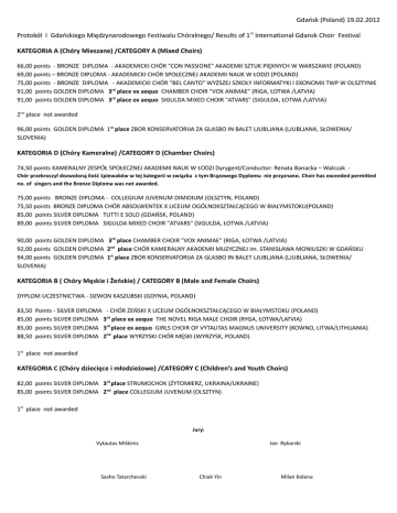 Gdańsk (Poland) 19.02.2012 Protokół I Gdańskiego Międzynarodowego Festiwalu Chóralnego/ Results of 1 st International Gdansk Choir Festival KATEGORIA A (Chóry Mieszane) /CATEGORY A (Mixed Choirs) 66,00 points - BRONZE DIPLOMA - AKADEMICKI CHÓR "CON PASSIONE" AKADEMII SZTUK PIĘKNYCH W WARSZAWIE (POLAND) 69,00 points – BRONZE DIPLOMA - AKADEMICKI CHÓR SPOŁECZNEJ AKADEMII NAUK W ŁODZI (POLAND) 75,00 points - BRONZE DIPLOMA - AKADEMICKI CHÓR "BEL CANTO" WYŻSZEJ SZKOŁY INFORMATYKI I EKONOMII TWP W OLSZTYNIE 91,00 points GOLDEN DIPLOMA 3rd place ex aequo CHAMBER CHOIR "VOX ANIMAE" (RIGA, ŁOTWA /LATVIA) 91,00 points GOLDEN DIPLOMA 3rd place ex aequo SIGULDA MIXED CHOIR "ATVARS" (SIGULDA, ŁOTWA /LATVIA) 2nd place not awarded 96,00 points GOLDEN DIPLOMA 1st place ZBOR KONSERVATORIJA ZA GLASBO IN BALET LJUBLJANA (LJUBLJANA, SŁOWENIA/ SLOVENIA) KATEGORIA D (Chóry Kameralne) /CATEGORY D (Chamber Choirs) 74,50 points KAMERALNY ZESPÓŁ SPOŁECZNEJ AKADEMII NAUK W ŁODZI Dyrygent/Conductor: Renata Banacka – Walczak Chór przekroczył dozwoloną ilość śpiewaków w tej kategorii w związku z tym Brązowego Dyplomu nie przyznano. Choir has exceeded permitted no. of singers and the Bronze Diploma was not awarded. 75,00 points BRONZE DIPLOMA - COLLEGIUM JUVENUM DIMIDIUM (OLSZTYN, POLAND) 75,50 points BRONZE DIPLOMA CHÓR ABSOLWENTEK X LICEUM OGÓLNOKSZTAŁCĄCEGO W BIAŁYMSTOKU(POLAND) 85,00 points SILVER DIPLOMA TUTTI E SOLO (GDAŃSK, POLAND) 89,00 points SILVER DIPLOMA SIGULDA MIXED CHOIR "ATVARS" (SIGULDA, ŁOTWA /LATVIA) 90,00 points GOLDEN DIPLOMA 3rd place CHAMBER CHOIR "VOX ANIMAE" (RIGA, ŁOTWA /LATVIA) 92,00 points GOLDEN DIPLOMA 2nd place CHÓR KAMERALNY AKADEMII MUZYCZNEJ im. STANISŁAWA MONIUSZKI W GDAŃSKU 94,00 points GOLDEN DIPLOMA 1st place ZBOR KONSERVATORIJA ZA GLASBO IN BALET LJUBLJANA (LJUBLJANA, SŁOWENIA/ SLOVENIA) KATEGORIA B ( Chóry Męskie i Żeńskie) / CATEGORY B (Male and Female Choirs) DYPLOM UCZESTNICTWA - DZWON KASZUBSKI (GDYNIA, POLAND) 83,50 85,00 85,00 88,50 Points - SILVER DIPLOMA - CHÓR ŻEŃSKI X LICEUM OGÓLNOKSZTAŁCĄCEGO W BIAŁYMSTOKU (POLAND) points SILVER DIPLOMA 3rd place ex aequo THE NOVEL RIGA MALE CHOIR (RYGA, ŁOTWA/LATVIA) points SILVER DIPLOMA 3rd place ex aequo GIRLS CHOIR OF VYTAUTAS MAGNUS UNIVERSITY (KOWNO, LITWA/LITHUANIA) points SILVER DIPLOMA 2nd place WYRZYSKI CHÓR MĘSKI (WYRZYSK, POLAND) 1st place not awarded KATEGORIA C (Chóry dziecięce i młodzieżowe) /CATEGORY C (Children’s and Youth Choirs) 82,00 points SILVER DIPLOMA 3rd place STRUMOCHOK (ŻYTOMIERZ, UKRAINA/UKRAINE) 85,00 points SILVER DIPLOMA 2nd place COLLEGIUM JUVENUM (OLSZTYN) 1st place not awarded Jury: Vytautas Miškinis Sasho Tatarchevski Jan Rybarski Chiak Yin Milan Kolena