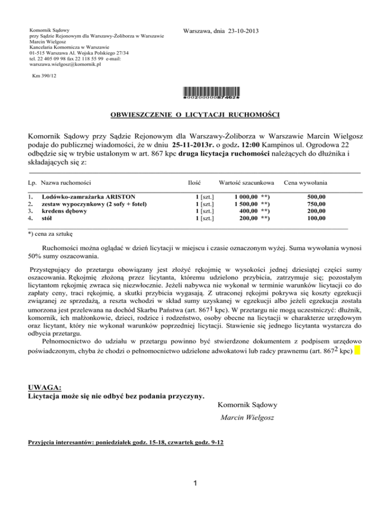 Komornik Sądowy przy Sądzie Rejonowym dla Warszawy-Żoliborza w Warszawie Marcin Wielgosz Kancelaria Komornicza w Warszawie 01-515 Warszawa Al. Wojska Polskiego 27/34 tel. 22 405 09 98 fax 22 118 55 99 e-mail: [email protected] Warszawa, dnia 23-10-2013 Km 390/12 *0020000087462* OBWIESZCZENIE O LICYTACJI RUCHOMOŚCI Komornik Sądowy przy Sądzie Rejonowym dla Warszawy-Żoliborza w Warszawie Marcin Wielgosz podaje do publicznej wiadomości, że w dniu 25-11-2013r. o godz. 12:00 Kampinos ul. Ogrodowa 22 odbędzie się w trybie ustalonym w art. 867 kpc druga licytacja ruchomości należących do dłużnika i składających się z: ____________________________________________________________________________________________________ Lp. Nazwa ruchomości Ilość Wartość szacunkowa Cena wywołania _____________________________________________________________________________________________________ 1. Lodówko-zamrażarka ARISTON 1 [szt.] 1 000,00 **) 500,00 2. zestaw wypoczynkowy (2 sofy + fotel) 1 [szt.] 1 500,00 **) 750,00 3. kredens dębowy 1 [szt.] 400,00 **) 200,00 4. stół 1 [szt.] 200,00 **) 100,00 _______________________________________________________________________________________________________________________ *) cena za sztukę Ruchomości można oglądać w dzień licytacji w miejscu i czasie oznaczonym wyżej. Suma wywołania wynosi 50% sumy oszacowania. Przystępujący do przetargu obowiązany jest złożyć rękojmię w wysokości jednej dziesiątej części sumy oszacowania. Rękojmię złożoną przez licytanta, któremu udzielono przybicia, zatrzymuje się; pozostałym licytantom rękojmię zwraca się niezwłocznie. Jeżeli nabywca nie wykonał w terminie warunków licytacji co do zapłaty ceny, traci rękojmię, a skutki przybicia wygasają. Z utraconej rękojmi pokrywa się koszty egzekucji związanej ze sprzedażą, a reszta wchodzi w skład sumy uzyskanej w egzekucji albo jeżeli egzekucja została umorzona jest przelewana na dochód Skarbu Państwa (art. 8671 kpc). W przetargu nie mogą uczestniczyć: dłużnik, komornik, ich małżonkowie, dzieci, rodzice i rodzeństwo, osoby obecne na licytacji w charakterze urzędowym oraz licytant, który nie wykonał warunków poprzedniej licytacji. Stawienie się jednego licytanta wystarcza do odbycia przetargu. Pełnomocnictwo do udziału w przetargu powinno być stwierdzone dokumentem z podpisem urzędowo poświadczonym, chyba że chodzi o pełnomocnictwo udzielone adwokatowi lub radcy prawnemu (art. 8672 kpc) UWAGA: Licytacja może się nie odbyć bez podania przyczyny. Komornik Sądowy Marcin Wielgosz Przyjęcia interesantów: poniedziałek godz. 15-18, czwartek godz. 9-12 1 Do wiadomości: 1. Dłużnik (2 adresy) 2. Wierzyciel 3. Uczestnik ( 2 adresy) 4. Sąd Rejonowy dla Warszawy Żoliborza 5. Sąd Rejonowy w Grodzisku Maz. 2