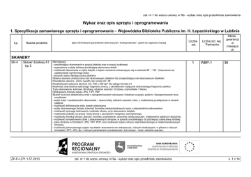 zał. nr 1 do wzoru umowy nr 9e - wykaz oraz opis przedmiotu zamówienia Wykaz oraz opis sprzętu i oprogramowania 1. Specyfikacja zamawianego sprzętu i oprogramowania – Wojewódzka Biblioteka Publiczna im. H. Łopacińskiego w Lublinie Lp. Nazwa produktu Opis minimalnych parametrów technicznych i funkcjonalności - jeżeli nie napisano inaczej Liczba szt. Liczba szt. wg Partnerów Okres gwarancji w miesiąca ch SKANERY SK-4 Skaner dziełowy A1 typ 2 ZP-P-I.271.1.57.2013 Stół roboczy: - umożliwiający skanowanie w pozycji płaskiej oraz w pozycji szalkowej - wyposażony w płytę szklaną dociskającą skanowany obiekt - możliwość skanowania w trybie kołyski, z kątem rozwarcia mieszczącym się w zakresie 90 ˚ -120 ˚ (dopuszcza się zaoferowanie wymiennego stołu) - przycisk nożny sterujący pracą skanera Głowica skanera umieszczona nad skanowanym obiektem lub przejeżdżająca nad skanowanym obiektem Oświetlenie skanera : zimne światło, bez emisji UV i IR Rozdzielczość optyczna skanera min. 400 x 400 dpi* dla całego formatu A1 Możliwość skanowania wybranego fragmentu strony, z oświetleniem wyłącznie skanowanego fragmentu obiektu Tryby skanowania: kolorowy 36 bitowy, odcienie szarości 12 bitowy, czarno/białe 1 bitowy Obsługiwane formaty zapisu JPG, TIFF, PDF Skaner musi być dostarczony wraz z oprogramowaniem sieciowym i lokalnym w języku polskim. Oprogramowanie musi umożliwiać: - wybór trybu i rozdzielczości skanowania – czarno-biały, odcienie szarości, kolor, z możliwością przełączania w ramach zadania, - możliwość definiowania wielu masek skanowania - wybór skanowanego formatu (również formatów niestandardowych) wraz z odpowiednim kadrowaniem, - możliwość ręcznego kadrowania i podziału obrazu, przy skanowaniu książek, - możliwość podziału na prawą i lewą stronę z usunięciem marginesu wewnętrznego, - możliwości korekcji obrazu: jasność, kontrast, prostowanie, usuwanie zanieczyszczeń, maskowanie zadanych obszarów, - możliwość kompletowania dzieł z zeskanowanych obrazów, w sposób umożliwiający ich późniejszą całościową obróbkę, - zapis obrazów w formatach: JPG, TIFF, PDF, oraz możliwość zapisu obrazu nieprzetworzonego w nieskompresowanym formacie, - możliwość jednoczesnego zapisu rezultatów skanowania we wskazanych, różnych lokalizacjach, w plikach o różnych formatach (TIFF, JPG, itp.) i różnych parametrach (rozdzielczość, tryb obrazu – kolor, odcienie szarości, zał. nr 1 do wzoru umowy nr 9e - wykaz oraz opis przedmiotu zamówienia 1 WBP-1 36 s. 1 z 14 SK-6 Skaner dziełowy automatyczny SK-7 Skaner szerokoformatowy ZP-P-I.271.1.57.2013 monochromatyczny), - możliwość dodawania metadanych do skanowanych obiektów, Wyposażenie dodatkowe: wzorzec koloru stosowany do kalibracji W zestawie ze skanerem komputer sterujący z monitorem – funkcjonalne wyposażenie skanera . Szybkość skanowania: min. 2200 stron/godz. Wyposażony w system automatycznego przewracania kartek oraz systemy bezpieczeństwa, w tym czujnik poboru podwójnych kartek lub braku podniesienia jakiejkolwiek, System oświetlenia ledowego, Kołyska z rozwarciem książki pod kątem mieszczącym się w zakresie od 60˚ do 110˚ Rozdzielczość optyczna skanera 400 x 400 dpi* z możliwością ustawienia niższych rozdzielczości Format książek min: 12 x 18 cm, max 25 x 32 cm. Tryby pracy skanera: automatyczny, półautomatyczny i manualny Tryby skanowania: kolorowy 24 bitowy, odcienie szarości 8 bitowy, czarno/białe 1 bitowy Skaner musi być dostarczony wraz z oprogramowaniem sieciowym i lokalnym. Oprogramowanie musi umożliwiać: a. wybór trybu i rozdzielczości skanowania – czarno-biały, odcienie szarości, kolor, z możliwością przełączania w ramach zadania, b. wybór skanowanego formatu (również formatów niestandardowych) wraz z odpowiednim kadrowaniem, c. zapis obrazów w formatach: JPG, TIFF, PDF, oraz możliwość zapisu obrazu nieprzetworzonego w nieskompresowanym formacie d. możliwość jednoczesnego zapisu rezultatów skanowania we wskazanych, różnych lokalizacjach, w plikach o różnych formatach (TIFF, JPG, itp.) i różnych parametrach (rozdzielczość, tryb obrazu – kolor, odcienie szarości, monochromatyczny), e. możliwość dodawania metadanych do skanowanych obiektów, Wyposażenie dodatkowe: wzorzec koloru stosowany do kalibracji W zestawie ze skanerem komputer sterujący z monitorem – funkcjonalne wyposażenie skanera . Obszar skanowania: Formaty standardowe od A5 do A1 Automatyczne rozpoznawanie formatów Maksymalna szerokość skanu: 36" (915 mm) Maksymalna szerokość dokumentu: 38" (965 mm) Grubość dokumentu do 2 mm Źródło światła: białe diody LED, bez emisji UV i IR Rozdzielczość optyczna – 1200 x 600 dpi* Prędkość skanowania (kolor 24 bit) co najmniej 6,0 m/min dla rozdzielczości 300 x 300 dpi* Tryby skanowania: kolorowy 36 bitowy, odcienie szarości 12 bitowy, czarno/białe 1 bitowy Formaty plików: JPG, TIFF (bez kompresji), Interfejs 1 GB Fast Ethernet Funkcje: Automatyczna korekcja poziomu czerni, automatyczny balans bieli W zestawie ze skanerem komputer sterujący z monitorem – funkcjonalne wyposażenie skanera zał. nr 1 do wzoru umowy nr 9e - wykaz oraz opis przedmiotu zamówienia 1 WBP-1 36 1 WBP-1 36 s. 2 z 14 SPRZĘT KOMPUTEROWY K-8 Zestaw komputerowy typ 1 ZP-P-I.271.1.57.2013 Obudowa: o rozmiarach nie przekraczających (wysokość x szerokość x długość cm przy ustawieniu pionowym) 50x20x50, fabrycznie przystosowana do pracy w pionie i w poziomie - nie dopuszcza się rozwiązań wyprowadzających powietrze poprzez górną pokrywę oraz innych uniemożliwiających stabilne ustawienie monitora na obudowie, przystosowana do kart PCI pełnej wysokości, złącza z przodu obudowy: - co najmniej 4 porty USB 2.0 lub wyższy - czytnik kart pamięci co najmniej SD, microSD, CompactFlash, MemoryStick - gniazdo słuchawkowe i mikrofonowe, złąc