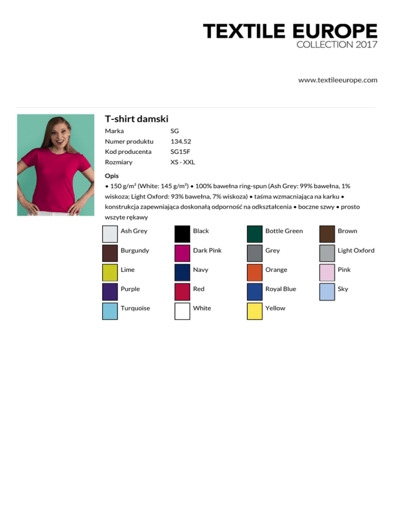 T-shirt damski Marka SG Numer produktu 134.52 Kod producenta SG15F Rozmiary XS - XXL Opis • 150 g/m² (White: 145 g/m²) • 100% bawełna ring-spun (Ash Grey: 99% bawełna, 1% wiskoza; Light Oxford: 93% bawełna, 7% wiskoza) • taśma wzmacniająca na karku • konstrukcja zapewniająca doskonałą odporność na odkształcenia • boczne szwy • prosto wszyte rękawy Ash Grey Black Bottle Green Brown Burgundy Dark Pink Grey Light Oxford Lime Navy Orange Pink Purple Red Royal Blue Sky Turquoise White Yellow