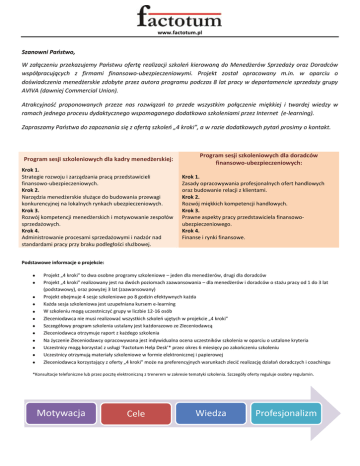 www.factotum.pl Szanowni Państwo, W załączeniu przekazujemy Paostwu ofertę realizacji szkoleo kierowaną do Menedżerów Sprzedaży oraz Doradców współpracujących z firmami finansowo-ubezpieczeniowymi. Projekt został opracowany m.in. w oparciu o doświadczenia menedżerskie zdobyte przez autora programu podczas 8 lat pracy w departamencie sprzedaży grupy AVIVA (dawniej Commercial Union). Atrakcyjnośd proponowanych przeze nas rozwiązao to przede wszystkim połączenie miękkiej i twardej wiedzy w ramach jednego procesu dydaktycznego wspomaganego dodatkowo szkoleniami przez Internet (e-learning). Zapraszamy Paostwa do zapoznania się z ofertą szkoleo „4 kroki”, a w razie dodatkowych pytao prosimy o kontakt. Program sesji szkoleniowych dla kadry menedżerskiej: Krok 1. Strategie rozwoju i zarządzania pracą przedstawicieli finansowo-ubezpieczeniowych. Krok 2. Narzędzia menedżerskie służące do budowania przewagi konkurencyjnej na lokalnych rynkach ubezpieczeniowych. Krok 3. Rozwój kompetencji menedżerskich i motywowanie zespołów sprzedażowych. Krok 4. Administrowanie procesami sprzedażowymi i nadzór nad standardami pracy przy braku podległości służbowej. Program sesji szkoleniowych dla doradców finansowo-ubezpieczeniowych: Krok 1. Zasady opracowywania profesjonalnych ofert handlowych oraz budowanie relacji z klientami. Krok 2. Rozwój miękkich kompetencji handlowych. Krok 3. Prawne aspekty pracy przedstawiciela finansowoubezpieczeniowego. Krok 4. Finanse i rynki finansowe. Podstawowe informacje o projekcie: Projekt „4 kroki” to dwa osobne programy szkoleniowe – jeden dla menedżerów, drugi dla doradców Projekt „4 kroki” realizowany jest na dwóch poziomach zaawansowania – dla menedżerów i doradców o stażu pracy od 1 do 3 lat (podstawowy), oraz powyżej 3 lat (zaawansowany) Projekt obejmuje 4 sesje szkoleniowe po 8 godzin efektywnych każda Każda sesja szkoleniowa jest uzupełniana kursem e-learning W szkoleniu mogą uczestniczyd grupy w liczbie 12-16 osób Zleceniodawca nie musi realizowad wszystkich szkoleo ujętych w projekcie „4 kroki” Szczegółowy program szkolenia ustalany jest każdorazowo ze Zleceniodawcą Zleceniodawca otrzymuje raport z każdego szkolenia Na życzenie Zleceniodawcy opracowywana jest indywidualna ocena uczestników szkolenia w oparciu o ustalone kryteria Uczestnicy mogą korzystad z usługi ‘Factotum Help Desk’* przez okres 6 miesięcy po zakooczeniu szkoleniu Uczestnicy otrzymują materiały szkoleniowe w formie elektronicznej i papierowej Zleceniodawca korzystający z oferty „4 kroki” może na preferencyjnych warunkach zlecid realizację działao doradczych i coachingu *Konsultacje telefoniczne lub przez pocztę elektroniczną z trenerem w zakresie tematyki szkolenia. Szczegóły oferty reguluje osobny regulamin. Motywacja Cele Wiedza Profesjonalizm www.factotum.pl Doradcy finansowo-ubezpieczeniowi Menedżerowie Wprowadzenie: Wprowadzenie: Głównym tematem pierwszej sesji szkoleniowej jest omówienie strategii rozwoju i zarządzania pracą przedstawicieli finansowo-ubezpieczeniowych. Głównymi tematami pierwszej sesji szkoleniowej są zasady opracowywania profesjonalnych ofert handlowych oraz budowanie relacji z klientami. Program szkolenia obejmuje tematykę zarządzania zespołami, indywidualnego motywowania, oraz naukę stosowania najważniejszych narzędzi menedżerskich. Program szkolenia obejmuje tematykę identyfikacji potrzeb klientów, skutecznej komunikacji w biznesie, a także metod nowoczesnej obsługi klienta. Cele dydaktyczne: Cele dydaktyczne: Budowanie zespołu (rekrutacja i selekcja) Zarządzanie zespołem (cele i planowanie działao) Indywidualna praca z członkami zespołu przedstawicieli finansowo-ubezpieczeniowych Narzędzia menedżerskie Cele ukryte: Motywacja do efektywnej pracy menedżerskiej Kształtowanie strategicznego myślenia o karierze menedżerskiej Wykształcenie odpowiedzialności menedżerskiej za wyniki pracy poszczególnych członków zespołu Zasady profesjonalnej obsługi klienta Komunikowanie się w biznesie Analiza potrzeb klientów Opracowywanie ofert handlowych Czynniki wpływające na zwiększenie satysfakcji i lojalności klientów Klient – podstawa własnego biznesu KROK 1 Efekt szkoleniowy: Cele ukryte: Motywacja do aktywnej działalności handlowej Kształtowanie strategicznego myślenia o własnym biznesie Eliminacja stereotypowego przekonania o zawodzie doradcy finansowoubezpieczeniowego Efekt szkoleniowy: Spodziewany efekt szkoleniowy to: Spodziewany efekt szkoleniowy to: Wzmocnienie postaw i motywacji uczestników do działania Ukierunkowanie uczestników na osiąganie ponadprzeciętnych wyników E-learning: E-learning: Materiał dostępny przez internet podsumowuje szkolenie, oraz wprowadza nowe treści i dodatkowe zadania dotyczące tematyki poruszonej podczas warsztatów. Motywacja © Factotum Wzmocnienie postaw i motywacji uczestników do działania Wskazanie uczestnikom kierunków profesjonalnego rozwoju umiejętności Cele Materiał dostępny przez internet dotyczy zasad opracowywania ofert handlowych i obejmuje kilkanaście zadao. Wiedza Profesjonalizm Drukujemy na papierze ekologicznym www.factotum.pl Menedżerowie Doradcy finansowo-ubezpieczeniowi Wprowadzenie: Wprowadzenie: Głównym celem drugiej sesji szkoleniowej jest profesjonalizacja procesu sprzedaży i budowanie przewagi konkurencyjnej na rynkach lokalnych. Druga sesja szkoleniowa poświęcona jest rozwojowi miękkich kompetencji handlowych. Podczas szkolenia wypracowywane są narzędzia menedżerskie służące do budowania przewagi konkurencyjnej na lokalnych rynkach ubezpieczeniowych. Program szkolenia obejmuje tematykę przygotowania do rozmów handlowych w zależności od typów rozmówców (segment klienta), zasad skutecznej komunikacji, autoprezentacji, oraz umiejętności zbijania obiekcji klientów. Cele dydaktyczne: Cele dydaktyczne: Analiza potencjału sprzedażoweg