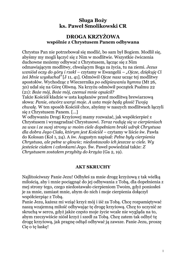 Sługa Boży ks. Paweł Smolikowski CR DROGA KRZYŻOWA wspólnie z Chrystusem Panem odbywana Chrystus Pan nie potrzebował się modlić, bo sam był Bogiem. Modlił się, abyśmy my mogli łączyć się z Nim w modlitwie. Wszystkie ćwiczenia duchowne możemy odbywać z Chrystusem, łącząc się z Nim odmawiającym modlitwy, chwalącym Boga za życia, tu na ziemi. Jezus wzniósł oczy do góry i rzekł – czytamy w Ewangelii – „Ojcze, dziękuję Ci żeś Mnie wysłuchał” [J 11, 41]. Odmówił Ojcze nasz ucząc tej modlitwy apostołów. Wychodząc z Wieczernika po odśpiewaniu hymnu (Mt 26, 30) udał się na Górę Oliwną. Na krzyżu odmówił początek Psalmu 22 (21): Boże mój, Boże mój, czemuś mnie opuścił? Także Kościół kładzie w usta kapłanów przed modlitwą brewiarzową słowa: Panie, otwórz wargi moje. A usta moje będą głosić Twoją chwałę. W ten sposób Kościół chce, abyśmy w naszych modlitwach łączyli się z Chrystusem Panem. [...] W odbywaniu Drogi Krzyżowej mamy rozważać, jak współcierpieć z Chrystusem i wynagradzać Chrystusowi. Teraz raduję się w cierpieniach za was i ze swej strony w moim ciele dopełniam braki udręk Chrystusa dla dobra Jego Ciała, którym jest Kościół – czytamy w liście św. Pawła do Kolosan (Kol 1, 24). A św. Augustyn napisał: Pełne były cierpienia Chrystusa, ale pełne w głowie; niedostawało ich jeszcze w ciele. Wy jesteście ciałem i członkami Jego. Św. Paweł powiedział także: Z Chrystusem zostałem przybity do krzyża (Ga 2, 19). AKT SKRUCHY Najlitościwszy Panie Jezu! Odbyłeś za mnie drogę krzyżową z tak wielką miłością, aby i mnie pociągnąć do jej odbywania z Tobą, dla dopełnienia z mej strony tego, czego niedostawało cierpieniom Twoim, gdyż poniosłeś je za mnie, zamiast mnie, abym do nich i moje cierpienia dołączył współcierpiąc z Tobą. Panie Jezu, każesz mi wziąć krzyż mój i iść za Tobą. Chcę rozpamiętywać naszą wzajemną miłość odbywając tę drogę krzyżową. Chcę to uczynić ze skruchą w sercu, gdyż jakże często moje życie wcale nie wygląda na to, abym rzeczywiście niósł krzyż i szedł za Tobą. Chcę zatem tak odbyć tę drogę krzyżową, jak pragnę odtąd odbywać ją zawsze. Panie Jezu, proszę Cię o tę łaskę! 1 STACJA I Pan Jezus skazany na śmierć - Kłaniamy Ci się, Panie Jezu Chryste i błogosławimy Tobie. - Żeś przez krzyż i mękę swoją świat odkupić raczył. Pierwsza stacja stawia nam przed oczy Chrystusa skazanego na śmierć. On, Bóg i Pan całego świata, On Baranek bez skazy jest osądzony przez ludzi i potępiony jako bluźnierca i burzyciel porządku publicznego! Panie Jezu, jako niewinny wycierpiałeś okrutną mękę i śmierć. Ta męka i śmierć była okrutna dlatego, że miała zadośćuczynić za grzechy wszystkich ludzi, a więc i za moje także. Ja też zatem powinienem cierpieć, abym zjednoczył się z Tobą. Ale ja będę cierpiał zasłużenie. Może mnie osądzają i potępiają inni na pozór niesłusznie, ale wobec Boga staję jako winowajca, jako godny osądzenia. Panie Jezu, chcę cierpieć w nadziei, że jednocząc się z Tobą dostąpię zbawienia, które wysłużyłeś dla mnie przez swoją mękę, śmierć i zmartwychwstanie. - Zmiłuj się nad nami Panie. Zmiłuj się nad nami. STACJA II Pan Jezus obarczony krzyżem - Kłaniamy Ci się, Panie Jezu Chryste i błogosławimy Tobie. - Żeś przez krzyż i mękę swoją świat odkupić raczył. Chrystus Pan nie wybrał dla siebie krzyża, ale przyjął go od Ojca. Doświadczał krzyża najboleśniejszego, poniżającego, a to dlatego, że były nim grzechy i zniewagi wszystkich ludzi. Tak, wszystkich. Panie Jezu, my sami chcemy sobie wybierać krzyż, sami chcemy decydować, co ewentualnie możemy wycierpieć. Może przyjęlibyśmy krzyż od Boga, ale od ludzi nie chcemy go przyjmować. A właśnie Ty Panie dajesz go nam najczęściej przez ludzi. Jak Twoja męka, dzieło złości ludzkiej, miała swą rację w grzechach, które wziąłeś na siebie, tak i nasze cierpienia, choćby przez innych zadawane, mają swoją rację w naszej skażonej grzechem naturze. Często cierpimy od innych, gdyż mamy dotkniętą, zranioną miłość własną i czym ona jest w nas większa, tym więcej cierpimy, tym bardziej ją odczuwamy. Panie Jezu, Twoja męka jest odkupieniem dla świata, spraw, aby nasze cierpienia – jakiekolwiek – uleczyły nas z miłości własnej. - Zmiłuj się nad nami Panie. - Zmiłuj się nad nami. 2 STACJA III Pan Jezus po raz pierwszy upada pod krzyżem - Kłaniamy Ci się, Panie Jezu Chryste i błogosławimy Tobie. Żeś przez krzyż i mękę swoją świat odkupić raczył. Pan Jezus chciał cierpieć w warunkach ludzkich, cierpiał jak człowiek. Nie pomagał sobie żadną mocą Bożą. Nie niósł krzyża wyniośle ponad ludzkim cierpieniem. Krzyż nie byłby krzyżem, gdyby nie ciążył i nie upokarzał. Chrystus też pod krzyżem upadał. A ja się dziwię, że upadam pod ciężarem krzyża, to znaczy pod ciężarem różnych doświadczeń, cierpień, niepowodzeń, pokus! Może nawet chciałbym cierpieć, ale jako ofiara niewinna, święta; chciałbym być wyższym nad cierpienia. A upadam ciągle, zniechęcam się, a to dlatego, że użalam się nad sobą i użalam się na innych, wciąż się skarżę, wszystkich staram się wokół zainteresować przede wszystkim sobą. Ty, Panie, za mnie upadałeś, więc i w tych, choć tak nędznie, niedostatecznie, słabo znoszonych cierpieniach, upadkach, narzekaniach, mogę łączyć się z Tobą. Zmiłuj się nad nami Panie. Zmiłuj się nad nami. STACJA IV Pan Jezus spotyka swoją Matkę Kłaniamy Ci się Panie Jezu Chryste i błogosławimy Tobie. Żeś przez krzyż i mekę swoją świat odkupić raczył. Czy to spotkanie Pana Jezusa z Matką było dla Niego powodem nowych cierpień? Bez wątpienia cierpiał patrząc na cierpienia Matki. Ta myśl, ten widok, że jest 