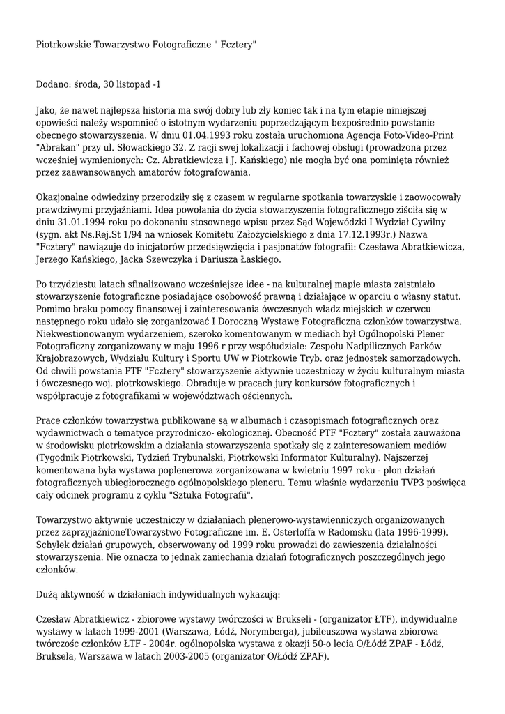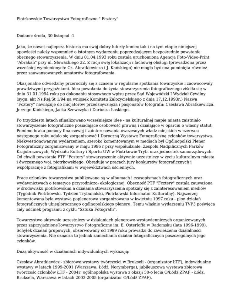 Piotrkowskie Towarzystwo Fotograficzne " Fcztery" Dodano: środa, 30 listopad -1 Jako, że nawet najlepsza historia ma swój dobry lub zły koniec tak i na tym etapie niniejszej opowieści należy wspomnieć o istotnym wydarzeniu poprzedzającym bezpośrednio powstanie obecnego stowarzyszenia. W dniu 01.04.1993 roku została uruchomiona Agencja Foto-Video-Print "Abrakan" przy ul. Słowackiego 32. Z racji swej lokalizacji i fachowej obsługi (prowadzona przez wcześniej wymienionych: Cz. Abratkiewicza i J. Kańskiego) nie mogła być ona pominięta również przez zaawansowanych amatorów fotografowania. Okazjonalne odwiedziny przerodziły się z czasem w regularne spotkania towarzyskie i zaowocowały prawdziwymi przyjaźniami. Idea powołania do życia stowarzyszenia fotograficznego ziściła się w dniu 31.01.1994 roku po dokonaniu stosownego wpisu przez Sąd Wojewódzki I Wydział Cywilny (sygn. akt Ns.Rej.St 1/94 na wniosek Komitetu Założycielskiego z dnia 17.12.1993r.) Nazwa "Fcztery" nawiązuje do inicjatorów przedsięwzięcia i pasjonatów fotografii: Czesława Abratkiewicza, Jerzego Kańskiego, Jacka Szewczyka i Dariusza Łaskiego. Po trzydziestu latach sfinalizowano wcześniejsze idee - na kulturalnej mapie miasta zaistniało stowarzyszenie fotograficzne posiadające osobowość prawną i działające w oparciu o własny statut. Pomimo braku pomocy finansowej i zainteresowania ówczesnych władz miejskich w czerwcu następnego roku udało się zorganizować I Doroczną Wystawę Fotograficzną członków towarzystwa. Niekwestionowanym wydarzeniem, szeroko komentowanym w mediach był Ogólnopolski Plener Fotograficzny zorganizowany w maju 1996 r przy współudziale: Zespołu Nadpilicznych Parków Krajobrazowych, Wydziału Kultury i Sportu UW w Piotrkowie Tryb. oraz jednostek samorządowych. Od chwili powstania PTF "Fcztery" stowarzyszenie aktywnie uczestniczy w życiu kulturalnym miasta i ówczesnego woj. piotrkowskiego. Obraduje w pracach jury konkursów fotograficznych i współpracuje z fotografikami w województwach ościennych. Prace członków towarzystwa publikowane są w albumach i czasopismach fotograficznych oraz wydawnictwach o tematyce przyrodniczo- ekologicznej. Obecność PTF "Fcztery" została zauważona w środowisku piotrkowskim a działania stowarzyszenia spotkały się z zainteresowaniem mediów (Tygodnik Piotrkowski, Tydzień Trybunalski, Piotrkowski Informator Kulturalny). Najszerzej komentowana była wystawa poplenerowa zorganizowana w kwietniu 1997 roku - plon działań fotograficznych ubiegłorocznego ogólnopolskiego pleneru. Temu właśnie wydarzeniu TVP3 poświęca cały odcinek programu z cyklu "Sztuka Fotografii". Towarzystwo aktywnie uczestniczy w działaniach plenerowo-wystawienniczych organizowanych przez zaprzyjaźnioneTowarzystwo Fotograficzne im. E. Osterloffa w Radomsku (lata 1996-1999). Schyłek działań grupowych, obserwowany od 1999 roku prowadzi do zawieszenia działalności stowarzyszenia. Nie oznacza to jednak zaniechania działań fotograficznych poszczególnych jego członków. Dużą aktywność w działaniach indywidualnych wykazują: Czesław Abratkiewicz - zbiorowe wystawy twórczości w Brukseli - (organizator ŁTF), indywidualne wystawy w latach 1999-2001 (Warszawa, Łódź, Norymberga), jubileuszowa wystawa zbiorowa twórczośc członków ŁTF - 2004r. ogólnopolska wystawa z okazji 50-o lecia O/Łódź ZPAF - Łódź, Bruksela, Warszawa w latach 2003-2005 (organizator O/Łódź ZPAF). Dariusz Łaski - zbiorowe wystawy twórczości w regionie łódzkim w latach 1999-2005 (organizator BTMFiF i Tow. Fotograf. w Radomsku), indywidualne wystawy w latach 2002-2005 w Łodzi i regionie oraz w Kielcach i regionie świętokrzyskim, zbiorowa prezentacja twórczości w Norymberdze -2002r. (organiz. BTMFiF) oraz Republice Czeskiej -2005r. (organiz. ŁTF), współorganizacja regionalnych plenerów i wystaw, publicystyka tematyczna. Mariusz Widawski - indywidualne działania fotograficzne, dokumentacje fotograficzno-krajoznawcze, wystawa indywidualna (Misteria pasyjne w fotografii) - 2001r. w Bełchatowie. Zbigniew Kołudzki, Marcin Wężyk - opracowania dokumentacyjne i wydawnicze ( w tym ogólnopolskie) dot. problematyki ekologiczno- środowiskowej, badania ornitologiczne, wspólna wystawa fotograficzna ( Pilica piękna i zagrożona )- 2000r. (organiz. Centrum Edukacji Ekologicznej), prelekcje i pokazy multimedialne, popularyzacja przyrody i środowiska naturalnego. Wzrost zainteresowania fotografią (wystawa fotograficzna z okazji jubileuszu 50-lecia O/Łódź ZPAF grudzień 2004r w Muzeum w Piotrkowie Tryb, wystawy indywidualne: Szymona Greszko "Zona" grudzień 2004 w dawnej Europie i Cezarego Chomicza: "Fotografie z Piotrkowa" - styczeń 2005r. w Galerii "U Panien"), kontakty osób fotografujących z członkami PTF "Fcztery" jak również upatrywanie szansy na kolejną możliwość integracji amatorskiego ruchu fotograficznego w mieście ostatecznie przypieczętowały reaktywację Towarzystwa. Zwyczajne Walne Zebranie Członków PTF " Fcztery" w marcu 2005 roku przyjęło priorytety działań w zakresie: przystosowania pozyskanego lokalu dla własnych potrzeb, dostosowania aktów wewnętrznych do obecnych uwarunkowań prawnych, przebudowa personalna oraz pozyskanie nowych, aktywnych członków, wybór nowych władz towarzystwa i powtórną rejestrację stowarzyszenia. Wielopłaszczyznowe działania organizacyjne i zaangażowanie wszystkich członków Towarzystwa przynoszą pierwsze efekty jubileuszową zbiorową wystawę członków PTF "Fcztery" (WDK- maj 2005r.- udane debiuty wystawiennicze nowych członków: Krystiana Ciążeli, Cezarego Chomicza, Krzysztofa Kucharczyka i Pauliny Pietrzak) oraz organizację regionalnego pleneru fotograficznego w Sulejowskim Parku Krajobrazowym (czerwiec 2005r.). W listopadzie 2005r. stowarzyszenie uzyskuje osobowość prawną (KRS 0000244719 z dnia 10.11.2005r. Sąd Rejonowy dla Łodzi - Śródmieści
