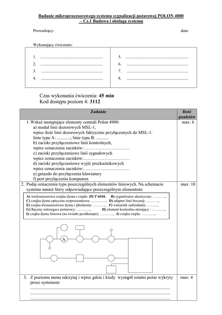 Badanie mikroprocesorowego systemu sygnalizacji pożarowej POLON 4000 – Cz.1 Budowa i obsługa systemu Prowadzący: data: Wykonujący ćwiczenie: 1. . ............................................................ 5. ............................................................. 2. . ............................................................ 6. ............................................................ 3. ............................................................ 7. ............................................................ 4. ............................................................ 8. ............................................................ Czas wykonania ćwiczenia: 45 min Kod dostępu poziom 4: 3112 Zadanie 1. Wskaż następujące elementy centrali Polon 4900: a) moduł linii dozorowych MSL-1, wpisz ilość linii dozorowych faktycznie przyłączonych do MSL-1: linie typu A: ............; linie typu B: ........... b) zaciski przyłączeniowe linii kontrolnych, wpisz oznaczenia zacisków:…………………………. c) zaciski przyłączeniowe linii sygnałowych wpisz oznaczenia zacisków:…………………………. d) zaciski przyłączeniowe wyjść przekaźnikowych wpisz oznaczenia zacisków:…………………………. e) gniazdo do przyłączenia klawiatury f) port przyłączenia komputera 2. Podaj oznaczenia typu poszczególnych elementów liniowych. Na schemacie systemu nanieś litery odpowiadające poszczególnym elementom: Ilość punktów max: 6 max: 10 A) wielosensorowa czujka dymu i ciepła: DUT 6046, B) sygnalizator akustyczny: ………., C) czujka dymu optyczna rozproszeniowa: ..……….., D) adapter linii bocznej: ………., E) czujka dwusensorowa dymu i płomienia: ………., F) wskaźnik zadziałania: ……..., G) Ręczny ostrzegacz pożarowy: ……….., H) element kontrolno-sterujący : ……….., I) czujka dymu liniowa (na światło pochłonięte): ……….., J) czujka ciepła: ……….., A 3. Z poziomu menu odczytaj i wpisz gdzie i kiedy wystąpił ostatni pożar wykryty przez systemem: ............................................................................................................................. ............................................................................................................................. ............................................................................................................................. max: 4 4. Wykonaj zwarcie w linii dozorowej między 3 i 4 elementem liniowym. Wypisz elementy liniowe, które nie działają w trakcie występowania zwarcia linii: ..................................................................................................................... 5. Przyporządkuj elementy detekcyjne do stref dozorowych zgodnie z tabelą poniżej. Przypisz strefom nazwę oraz wariant alarmowania. Nr strefy 1 Nazwa Elementy max: 4 max: 12 Wariant alarmowania Pokój (nazwisko studenta 1) 2 Pokój (nazwisko studenta 2) 3 Pokój (nazwisko studenta 3) 6. Z poziomu menu odczytaj i wpisz: czas na potwierdzenie alarmu T1: ............; czas na kasowanie alarmu T2: ................ 7. Wyświetl wykres zmian czynnika pożarowego czujki ciepła, obserwuj zmiany wykresu podczas działania na czujkę ciepłym powietrzem 8. Przeprowadź procedurę alarmowania dwustopniowego wzbudzając wybraną czujkę. Wyjaśnij jakie czynności, należy wykonać: w czasie T1 …………………………………………………………………….. …………………………………………………………………………………… w czasie T2 .…………………………………………………………………….. …………………………………………………………………………………… 9. Wyjaśnij jakie funkcje spełnia EKS 4001. Wpisz oznaczenia zacisków w EKS: monitorujące:................. , sterujące:....................., linia dozorowa: ………..…. 10. Z poziomu menu odczytaj i wpisz kryterium wysterowania EKS 4001: .................................................................................................................. 11. Wyjaśnij w jaki sposób można przywrócić fabryczne kody dostępu (bez wchodzenia do menu) 12. Wyjaśnij realizowane funkcje i sposób działania: a) wyjść przekaźnikowych, b) linii sygnałowych, podaj max obciążenie prądowe: …..................................... c) linii kontrolnych, podaj rezystancje charakterystyczne: ……………………… max: 2 max: 2 max: 6 max: 2 max: 2 max: 4 max: 8 Suma punktów: ......................... Punktacja: 0-30 ndst 33-38 dst 39-45 dst + 46-52 db 53-59 db+ 60-62 bdb Ocena: Sprawozdanie: 1. Wstęp. Cel i zakres ćwiczenia 2. Schemat stanowiska 3. Przebieg ćwiczenia 4. Podsumowanie i wnioski (ocena systemu, wady i zalety, propozycje ulepszeń)