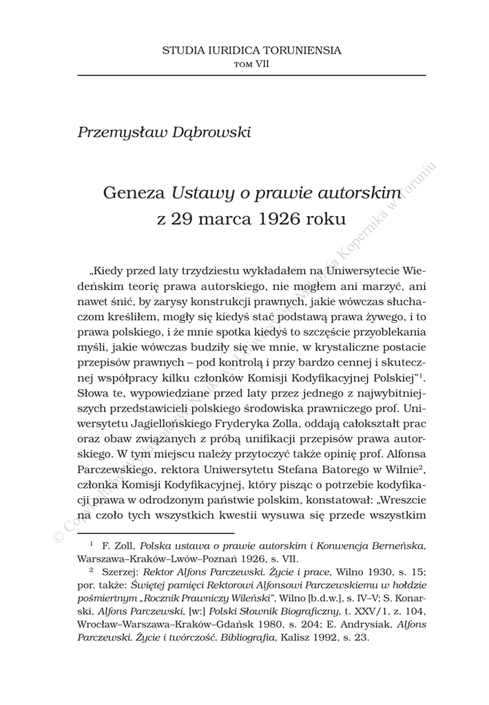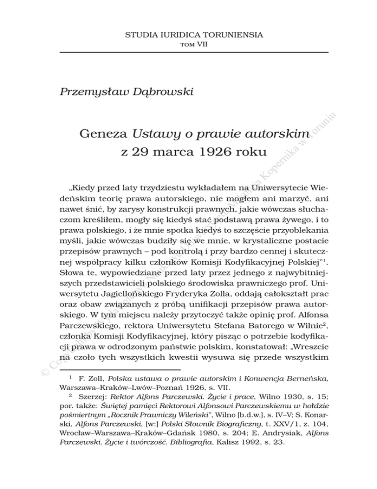 STUDIA IURIDICA TORUNIENSIA tom VII oł aj a K op er n ik aw To r Geneza Ustawy o prawie autorskim z 29 marca 1926 roku un iu Przemysław Dąbrowski © Co p yt ig ht by W yd aw ni ct w o N au k ow eU ni w er sy t et u M ik „Kiedy przed laty trzydziestu wykładałem na Uniwersytecie Wiedeńskim teorię prawa autorskiego, nie mogłem ani marzyć, ani nawet śnić, by zarysy konstrukcji prawnych, jakie wówczas słuchaczom kreśliłem, mogły się kiedyś stać podstawą prawa żywego, i to prawa polskiego, i że mnie spotka kiedyś to szczęście przyoblekania myśli, jakie wówczas budziły się we mnie, w krystaliczne postacie przepisów prawnych – pod kontrolą i przy bardzo cennej i skutecznej współpracy kilku członków Komisji Kodyfikacyjnej Polskiej”1. Słowa te, wypowiedziane przed laty przez jednego z najwybitniejszych przedstawicieli polskiego środowiska prawniczego prof. Uniwersytetu Jagiellońskiego Fryderyka Zolla, oddają całokształt prac oraz obaw związanych z próbą unifikacji przepisów prawa autorskiego. W tym miejscu należy przytoczyć także opinię prof. Alfonsa Parczewskiego, rektora Uniwersytetu Stefana Batorego w Wilnie2, członka Komisji Kodyfikacyjnej, który pisząc o potrzebie kodyfikacji prawa w odrodzonym państwie polskim, konstatował: „Wreszcie na czoło tych wszystkich kwestii wysuwa się przede wszystkim 1 F. Zoll, Polska ustawa o prawie autorskim i Konwencja Berneńska, Warszawa–Kraków–Lwów–Poznań 1926, s. VII. 2 Szerzej: Rektor Alfons Parczewski. Życie i prace, Wilno 1930, s. 15; por. także: Świętej pamięci Rektorowi Alfonsowi Parczewskiemu w hołdzie pośmiertnym „Rocznik Prawniczy Wileński”, Wilno [b.d.w.], s. IV–V; S. Konarski, Alfons Parczewski, [w:] Polski Słownik Biograficzny, t. XXV/1, z. 104, Wrocław–Warszawa–Kraków–Gdańsk 1980, s. 204; E. Andrysiak, Alfons Parczewski. Życie i twórczość. Bibliografia, Kalisz 1992, s. 23. 67 yd aw ni ct w o N au k ow eU ni w er sy t et u M ik oł aj a K op er n ik aw To r un i przed innymi jedno jeszcze zapytanie: czy mianowicie do pracy nad zjednoczeniem obowiązującego w różnych dzielnicach polskich prawodawstwa cywilnego znajdują się już dzisiaj dostatecznie zjednoczone w swym światopoglądzie prawniczym kadry nie tylko prawników Polaków, ale istotnie polskich prawników”3. Po odzyskaniu przez Polskę niepodległości pojawił się problem występujących partykularyzmów prawnych, tak w zakresie praw na dobrach materialnych, jak i niematerialnych (prawo autorskie)4. Na ziemiach polskich obowiązywały bowiem następujące akty prawne: austriacka Ustawa o prawie autorskim do utworów literatury, sztuki i fotografii z 26 grudnia 1895 roku; rosyjska Ustawa o prawie autorskim z 20 marca z 1911 roku niemieckie, w brzmieniu zmienionym ustawą z 22 maja 1910 roku: Ustawa z 19 czerwca 1901 roku o prawie autorskim do utworów literackich i muzycznych, Ustawa z 19 czerwca 1901 roku o prawie wydawniczym oraz Ustawa z 9 stycznia 1907 roku o prawie autorskim do utworów sztuk plastycznych i fotograficznych; a także węgierska, dla Spisza i Orawy: Węgierska ustawa o prawie autorskim z 26 kwietnia 1884 toku. To właśnie na różnorodność tego stanu prawnego, zwrócił uwagę m.in. prof. Zoll, który w trakcie jednego z wykładów wygłoszonych w Kole Słuchaczy Szkoły Nauk Politycznych w Krakowie stwierdził: „Na ziemiach polskich obowiązują po dziś dzień 3 różne prawa autorskie, które trzeba usunąć przez jednolitą na całą Polskę ustawę”5, w innym zaś miejscu podkreślił, że skodyfikowanie tej mate- iu Geneza Ustawy o prawie autorskim z 29 marca 1926 roku © Co p yt ig ht by W 3 A. Parczewski, Uwagi nad kodyfikacją prawa cywilnego w Polsce, odbitka z Rocznika Prawniczego Wileńskiego za rok 1925, Wilno 1925, s. 2. 4 Szerzej: E. Ferenc-Szydełko, Prawo autorskie na ziemiach polskich do 1926 roku, Kraków 2000, s. 73–238; W. Dbałowski, J.J. Litauer, Ustawodawstwo autorskie obowiązujące w Polsce, Warszawa 1922, s. 9–97; por. też: Prawo autorskie tymczasowo obowiązujące w b. Królestwie Kongresowym i na obszarze Ziem Wschodnich (Zbiór praw Cesarstwa Rosyjskigo, t. X, cz. 1, wyd. z 1914 r.), tłum. A. Moglinicki, Warszawa 1920, s. 3–19; J. Górski, Pojęcie prawa autorskiego w rozwoju historycznym, Ruch Prawniczy, Ekonomiczny i Socjologiczny – poświęcony nauce i życiu prawnemu i gospodarczemu Rzeczypospolitej Polskiej, z. 1, Poznań 1931, s. 45–62. 5 Własność literacka, artystyczna i przemysłowa. Według wykładów J.W. P. Prof. Dra Fryderyka Zolla. Zebrał p. Krajewski i Speizer, dat., Kra- 68 Przemysław Dąbrowski © Co p yt ig ht by W yd aw ni ct w o N au k ow eU ni w er sy t et u M ik oł aj a K op er n ik aw To r un iu rii „stało się sprawą bardzo pilną”6. Przywołując z kolei definicję praw autorskich, sądził, że: „Do tych praw należą: 1) własność literacka i artystyczna (prawo autorskie). Jest to prawo autora, twórcy lub jego następcy prawnego do wyłącznego wyzyskania siły zarobkowej, dochodowej jaka tkwi w nowym tworze myśli, wyrażonej w pewnej formie literackiej lub artystycznej. Podstawą i przedmiotem tych praw są dzieła nauki, literatury i wszystkich sztuk, a więc muzyki, malarstwa, rysownictwa, rzeźby i architektury. Ale myśl musi być ucieleśniona w pewnej formie, ustalona w jakiejś postaci bądź to słowem, pismem, sztuką graficzną lub plastyczną, dźwiękiem, mimiką, rytmiką i t. p. Wreszcie musi być czymś nowym w tym znaczeniu, że utwór nosi piętno osobiste twórcy”7. Na marginesie powyższych rozważań należy przytoczyć także niezwykle oryginalne ujęcie prawa autorskiego zaprezentowane przez Radcę Ministerialnego Departamentu Ustawodawczego Ministerstwa Sprawiedliwości w referacie prawa autorskiego polskiego i międzynarodowego w latach 1927–1932, od 1932 roku sędziego Sądu Apelacyjnego w Krakowie adwokata Gustawa Groegera, który uznał, ż