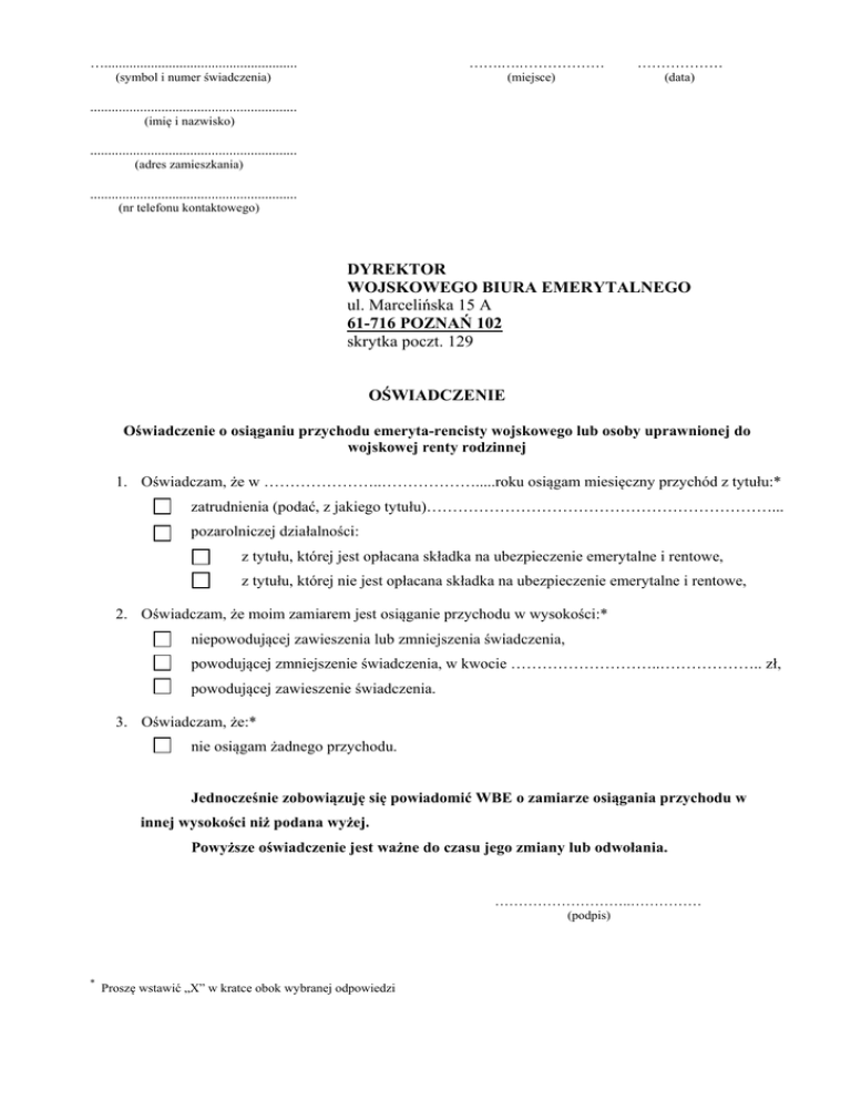 …...................................................... …….….……………… (symbol i numer świadczenia) (miejsce) ……………… (data) .......................................................... (imię i nazwisko) .......................................................... (adres zamieszkania) .......................................................... (nr telefonu kontaktowego) DYREKTOR WOJSKOWEGO BIURA EMERYTALNEGO ul. Marcelińska 15 A 61-716 POZNAŃ 102 skrytka poczt. 129 OŚWIADCZENIE Oświadczenie o osiąganiu przychodu emeryta-rencisty wojskowego lub osoby uprawnionej do wojskowej renty rodzinnej 1. Oświadczam, że w …………………..……………….....roku osiągam miesięczny przychód z tytułu:* zatrudnienia (podać, z jakiego tytułu)…………………………………………………………... pozarolniczej działalności: z tytułu, której jest opłacana składka na ubezpieczenie emerytalne i rentowe, z tytułu, której nie jest opłacana składka na ubezpieczenie emerytalne i rentowe, 2. Oświadczam, że moim zamiarem jest osiąganie przychodu w wysokości:* niepowodującej zawieszenia lub zmniejszenia świadczenia, powodującej zmniejszenie świadczenia, w kwocie ………………………..……………….. zł, powodującej zawieszenie świadczenia. 3. Oświadczam, że:* nie osiągam żadnego przychodu. Jednocześnie zobowiązuję się powiadomić WBE o zamiarze osiągania przychodu w innej wysokości niż podana wyżej. Powyższe oświadczenie jest ważne do czasu jego zmiany lub odwołania. ………………………..…………… (podpis) * Proszę wstawić „X” w kratce obok wybranej odpowiedzi INFORMACJA 1. 2. Na podstawie przepisów ustawy z dnia 10 grudnia 1993 o zaopatrzeniu emerytalnym żołnierzy zawodowych oraz ich rodzin (Dz. U. z 2016 roku poz. 1037 j.t.) oraz przepisów ustawy z dnia 17 grudnia 1998r. o emeryturach i rentach z Funduszu Ubezpieczeń Społecznych (Dz. U. z 2016 roku poz. 887 t.j.) emeryt lub rencista jest zobowiązany do powiadomienia WBE o podjęciu lub zaprzestaniu działalności polegającej obowiązkowi ubezpieczenia społecznego, z tytułu, której uzyskuje przychód. Za przychód powodujący zmniejszenie wypłaty emerytury lub renty uważa się uzyskany w roku kalendarzowym przychód stanowiący podstawę wymiaru składek na ubezpieczenie społeczne z tytułu pracy wykonywanej w ramach stosunku pracy, z tytułu umowy o pracę nakładczą, z tytułu umowy zlecenia lub umowy agencyjnej oraz współpracy przy wykonywaniu tych umów. Za przychód uważa się również kwoty pobranych zasiłków: - chorobowego, - macierzyńskiego i opiekuńczego oraz wynagrodzenia za czas niezdolności do pracy, kwoty świadczenia rehabilitacyjnego i wyrównawczego, zasiłku wyrównawczego i dodatku wyrównawczego. Za przychód emerytów i rencistów prowadzących pozarolniczą działalność gospodarczą stanowi zadeklarowana kwota, nie niższa jednak niż 60% prognozowanego przeciętnego wynagrodzenia miesięcznego przyjętego do ustalenia kwoty ograniczenia rocznej podstawy wymiaru składek na dany rok kalendarzowy. Składka w nowej wysokości obowiązuje od 1 stycznia do 31 grudnia danego roku. DOTYCZY TYLKO OŚWIADCZENIA OSOBY UPRAWNIONEJ DO RENTY RODZINNEJ: A) Nie powoduje zmniejszenia renty rodzinnej osiąganie przychodu w wysokości nieprzekraczającej 70% kwoty przeciętnego wynagrodzenia za kwartał kalendarzowy, ostatnio ogłoszonego przez Prezesa GUS. B) Osiąganie przychodu w wysokości przekraczającej 70% przeciętnego wynagrodzenia, nie wyżej niż 130% tej kwoty, powoduje zmniejszenie wysokości renty rodzinnej. C) Osiągnięcie przychodu przekraczającego 130% kwoty przeciętnego wynagrodzenia, powoduje zawieszenie wypłaty renty rodzinnej. D) Nie powoduje zawieszenia wypłaty ani zmniejszenia wysokości wojskowej renty rodzinnej osiąganie przychodu przez emerytów, którzy osiągnęli wiek emerytalny, o którym mowa w art. 24 ust. 1 a i 1 b lub w art. 27 ust 2 i 3 ustawy o emeryturach i rentach z FUS. E) Rozliczania wojskowej renty rodzinnej WBE dokonuje po upływie roku kalendarzowego na podstawie zawiadomienia o łącznej kwocie przychodu osiągniętego w minionym roku lub o kwocie przychodów osiąganych w poszczególnych miesiącach, które należy przesłać do WBE do końca lutego roku kalendarzowego za każdy rok poprzedni. F) W przypadku nie zachowania terminu określonego w pkt. E) oraz nie powiadomienia WBE o osiąganiu dodatkowych przychodów wojskowy organ emerytalny jest zobowiązany do naliczania odsetek w przypadku ustalenia, że świadczenia z tego tytułu były nienależne. DOTYCZY TYLKO OŚWIADCZENIA EMERYTA LUB RENCISTY: A) Nie powoduje zmniejszenia emerytury i renty osiąganie przychodu w wysokości nieprzekraczającej 70% kwoty przeciętnego wynagrodzenia za kwartał kalendarzowy, ostatnio ogłoszonego przez Prezesa GUS, posiadanie prawa do emerytury w wysokości 75% z tytułu wysługi emerytalnej oraz w przypadku pobierania renty inwalidzkiej z tytułu inwalidztwa powstałego w skutek wypadku powstałego w związku ze służbą lub wskutek choroby powstałej w związku ze szczególnymi właściwościami bądź warunkami służby, z tytułu których przysługują świadczenia odszkodowawcze B) W przypadku zbiegu prawa do pobierania dwóch świadczeń tj. emerytury bądź wojskowej renty inwalidzkiej z prawem do emerytury bądź wypadkowej renty inwalidzkiej przyznanej przez ZUS, bez względu na wysokość osiąganego przychodu prawo do świadczenia wypadkowego ulega zawieszeniu. C) Rozliczania emerytury WBE dokonuje po upływie roku kalendarzowego na podstawie zawiadomienia o łącznej kwocie przychodu osiągniętego w minionym roku lub o kwocie przychodów osiąganych w poszczególnych miesiącach, które należy przesłać do WBE do końca pierwszego kwartału roku kalendarzowego za każdy rok poprzedni. D) W przypadku nie zachowania terminu określonego w pkt. C) oraz