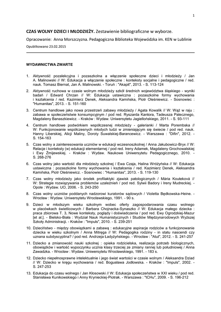CZAS WOLNY DZIECI I MŁODZIEŻY. Zestawienie bibliograficzne w