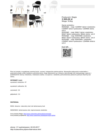 http://cubeonline.pl PINA fotel (skóra) kategoria: Kategorie > KRZESŁA > Z podłokietnikami Producent: Magis 3 069,00 zł Waga: 9.6kg Opcje produktu: RODZAJE: : nogi: CZARNY lakier+siedzisko: CZARNY lakier+poduszka: CZARNA skóra szt.0 RODZAJE: : nogi: BIAŁY lakier+siedzisko: BIAŁY lakier+poduszka: BIAŁA skóra szt.0 RODZAJE: : nogi: BUKOWE+siedzisko: BIAŁY lakier+poduszka: BIAŁA skóra szt.0 RODZAJE: : nogi: BUKOWE+ siedzisko: CZARNY lakier+poduszka: CZARNA skóera szt.0 Kod QR: Pina to krzesło o wyjątkowo zwartej bryle, surowe i eleganckie jednocześnie. Niezwykłe połączenie materiałów z pewnością doda uroku każdemu pomieszczeniu. Nogi wykonane są z drewna naturalnego lub malowanego; oparcie i podłokietniki tworzy metalowa, malowana siatka; na oparciu i siedzisku poliuretanowa poducha pokryta tkaniną lub skórą. WYMIARY (cm): wysokość siedziska- 47 wysokość całkowita- 81 szerokość- 53 głębokość- 53 MATERIAŁ: NOGI: drewno -naturalny buk lub lakierowany buk SIEDZISKO: lakierowana stal, tapicerowane siedzisko Inne produkty Magis: http://www.cubeonline.pl/manufacturer/magis Inne produkty projektanta: http://www.cubeonline.pl/designer/hayon-jaime strona: 1/1 wydrukowano: 02-03-2017 http://cubeonline.pl/pina-fotel-skora.html