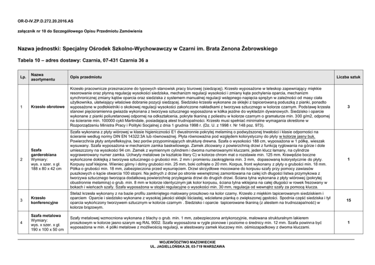 OR-D-IV.ZP.D.272.20.2016.AS załącznik nr 10 do Szczegółowego Opisu Przedmiotu Zamówienia Nazwa jednostki: Specjalny Ośrodek Szkolno-Wychowawczy w Czarni im. Brata Zenona Żebrowskiego Tabela 10 – adres dostawy: Czarnia, 07-431 Czarnia 36 a Nazwa asortymentu Opis przedmiotu Krzesło obrotowe Krzesło pracownicze przeznaczone do typowych stanowisk pracy biurowej (siedzącej). Krzesło wyposażone w teleskop zapewniający miękkie resorowanie oraz płynną regulację wysokości siedziska, mechanizm regulacji wysokości i zmiany kąta pochylenia oparcia, mechanizm synchronicznej zmiany kątów oparcia oraz siedziska z systemem manualnej regulacji wstępnego napięcia sprężyn w zależności od masy ciała użytkownika, ułatwiający właściwe dobranie pozycji siedzącej. Siedzisko krzesła wykonane ze sklejki z tapicerowaną poduszką z pianki, ponadto wyposażone w podłokietniki o skokowej regulacji wysokości zakończone nakładkami z tworzywa sztucznego w kolorze czarnym. Podstawę krzesła stanowi pięcioramienna gwiazda wykonana z tworzywa sztucznego wyposażona w kółka jezdne do wykładzin dywanowych. Siedzisko i oparcie wykonane z pianki poliuretanowej odpornej na odkształcenia, pokryte tkaniną z poliestru w kolorze czarnym o gramaturze min. 300 g/m2, odpornej na ścieranie min. 100000 cykli Martindale, posiadającą atest trudnopalności. Krzesło musi spełniać minimalne wymagania określone w Rozporządzeniu Ministra Pracy i Polityki Socjalnej z dnia 1 grudnia 1998 r. (Dz. U. z 1998 r. Nr 148 poz. 973). 3 2 Szafa garderobiana Wymiary: wys. x szer. x gł. 188 x 80 x 42 cm Szafa wykonana z płyty wiórowej w klasie higieniczności E1 dwustronnie pokrytej melaminą o podwyższonej trwałości i klasie odporności na ścieranie według normy DIN EN 14322:3A lub równoważnej. Płyta równoważna pod względem kolorystyczny do płyty w kolorze jasny buk. Powierzchnia płyty antyrefleksyjna, bez porów przypominających strukturę drewna. Szafa o wysokości 188 cm, wyposażona w 1 półkę, wieszak wysuwany. Szafa wyposażona w mechanizm zamka baskwilowego. Zamek zlicowany z powierzchnią drzwi z funkcją ryglowania na górze i dole umieszczony na wysokości 94 cm. Zamek z wymiennym cylindrem i dwoma numerowanymi kluczami, jeden klucz łamany, na cylindrze wygrawerowany numer zamka. Uchwyty metalowe (w kształcie litery C) w kolorze chrom mat o rozstawie min. 125 mm. Krawędzie boczne wykończone doklejką z tworzywa sztucznego o grubości min. 2 mm i promieniu zaokrąglenia min. 3 mm, dopasowaną kolorystycznie do płyty. Korpusy szaf klejone. Wieniec górny i dolny grubości min. 25 mm, boki cofnięte o 20 mm. Korpus, front wykonany z płyty o grubości min. 18 mm. Półka o grubości min. 18 mm, zabezpieczona przed wysunięciem. Drzwi skrzydłowe mocowane do korpusu szafy przy pomocy zawiasów puszkowych o kącie otwarcia 100 stopni. Na jednych z drzwi po stronie wewnętrznej zamontowana na całej ich długości listwa przymykowa z tworzywa sztucznego tworząca dodatkową powierzchnię przylegania drzwi do drugich drzwi. Ściana tylna wykonana z płyty wiórowej (pokrytej obustronnie melaminą) o grub. min. 8 mm w kolorze identycznym jak kolor korpusu, ściana tylna wklejana na całej długości w rowek frezowany w bokach i wieńcach szafy. Szafa wyposażona w stopki regulacyjne o wysokości min. 30 mm, regulacja od wewnątrz szafy za pomocą klucza. 1 3 Krzesło konferencyjne Stelaż krzesła wykonany z na bazie profilu zamkniętego malowany proszkowo na kolor czarny. Krzesło z miękkim tapicerowanym siedziskiem i oparciem Oparcie i siedzisko wykonane z wysokiej jakości sklejki liściastej, wściełane pianką o zwiększonej gęstości. Spodnia część siedziska i tył oparcia wykończony tworzywem sztucznym w kolorze czarnym . Siedzisko i oparcie tapicerowane tkaniną (z atestem na trudnozapalność) w kolorze brązowym. 15 4 Szafa metalowa Wymiary: wys. x szer. x gł. 190 x 100 x 50 cm Szafy metalowej wzmocniona wykonana z blachy o grub. min. 1 mm, zabezpieczona antykorozyjnie, malowana strukturalnym lakierem proszkowym w kolorze jasno szarym wg RAL 9002. Szafa wyposażona w rygle pionowe i poziome o średnicy min. 12 mm. Szafa powinna być wyposażona w min. 4 półki metalowe z możliwością regulacji, w atestowany zamek kluczowy min. ośmiozapadkowy z dwoma kluczami. 1 Lp. 1 Liczba sztuk __________________________________________________________________________________________________________________________________________________________________________ WOJEWÓDZTWO MAZOWIECKIE UL. JAGIELLOŃSKA 26, 03-719 WARSZAWA OR-D-IV.ZP.D.272.20.2016.AS załącznik nr 10 do Szczegółowego opisu przedmiotu zamówienia Nazwa asortymentu Opis przedmiotu Szafa garderobiana Wymiary: wys. x szer. x gł. 188 x 80 x 42 cm Szafa wykonana z płyty wiórowej w klasie higieniczności E1 dwustronnie pokrytej melaminą o podwyższonej trwałości i klasie odporności na ścieranie według normy DIN EN 14322:3A lub równoważnej. Płyta równoważna pod względem kolorystycznym i usłojenia do płyty w kolorze orzech francuski . Powierzchnia płyty antyrefleksyjna, bez porów przypominających strukturę drewna. Szafa o wysokości 188 cm: 1 półka, wieszak wysuwany. Szafa wyposażona w mechanizm zamka baskwilowego. Zamek zlicowany z powierzchnią drzwi z funkcją ryglowania na górze i dole umieszczony na wysokości 94 cm. Zamek z wymiennym cylindrem i dwoma numerowanymi kluczami, jeden klucz łamany, na cylindrze wygrawerowany numer zamka. Uchwyty metalowe (w kształcie litery C) w kolorze chrom mat o rozstawie min. 125 mm Krawędzie boczne wykończone doklejką z tworzywa sztucznego o grubości min. 2 mm i promieniu zaokrąglenia min. 3 mm. dopasowanym kolorystycznie do płyty. Korpusy szaf klejone. Wieniec górny i dolny grubości min. 25 mm, boki cofnięte o 20 mm. Korpus, front wykonany z płyty o grubości min. 18 mm z możliwością regulacji wysokości półek, co 32 mm. P