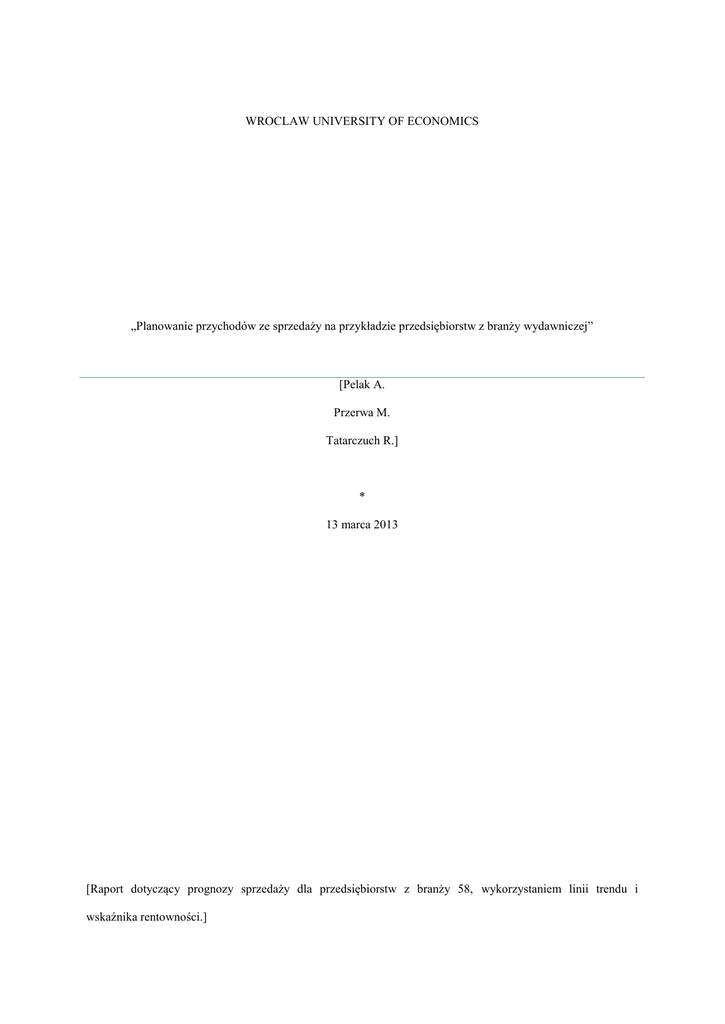 WROCLAW UNIVERSITY OF ECONOMICS „Planowanie przychodów ze sprzedaży na przykładzie przedsiębiorstw z branży wydawniczej” [Pelak A. Przerwa M. Tatarczuch R.] * 13 marca 2013 [Raport dotyczący prognozy sprzedaży dla przedsiębiorstw z branży 58, wykorzystaniem linii trendu i wskaźnika rentowności.] Spis Treści Wstęp ...................................................................................................................................................................... 3 Opis teoretyczny metody......................................................................................................................................... 3 Praktyczny przykład zastosowania z wykorzystaniem danych rzeczywistych ....................................................... 4 Zakończenie ............................................................................................................................................................ 9 Bibliografia: .......................................................................................................................................................... 10 Wstęp Celem niniejszej pracy jest zaproponowanie i uzasadnienie przyszłorocznej sprzedaży dla wybranych przedsiębiorstw z branży wydawniczej (PKD 58). Możliwe jest to dzięki podstawowej funkcji zarządzania, którą jest planowanie- za jej pomocą możliwe jest każde kolejne podjęcie działań. Podstawą owego planowania jest prognozowanie to znaczy ekstrapolacja wyników, zdarzeń czy trendów w przyszłości. Zarząd przedsiębiorstwa chcąc podjąć decyzje dotyczącą rozwoju czy też swoich przyszłych zysków musi skupić się na długoi krótkoterminowym planowaniu. W skład tych elementów wchodzi właśnie planowanie takiej kategorii ekonomicznej jaką są przychody ze sprzedaży. Z punktu widzenia osiągania celów zarządzania finansami jednostki gospodarczej, fundamentem decyzyjnym są przepływy pieniężne. Pozwalają na pełniejszą ocenę sytuacji jednostki i określenie jaki wpływ miała na nią zastosowana strategia. Dodatkowo rachunek przepływów pieniężnych uwzględnia fakt wydatkowania środków pieniężnych jak też ich wpływu, co umożliwia ujęcie w danym okresie operacji nie uwzględnionych w rachunku zysków i strat. 1 Praca składa się z dwóch podstawowych części. Pierwszą z nich jest opis teoretyczny stosowanej metody czyli linii trendu, drugą zaś praktyczne zastosowanie wybranych metod na przykładzie trzech przedsiębiorstw. Opis teoretyczny metody By móc zaplanować przyszłoroczną sprzedaż dla wybranych przedsiębiorstw konieczne było ustalenie na podstawie danych historycznych pochodzących z Monitora Polskiego B oraz KRS, linii trendów przychodów ze sprzedaży w latach 2010 i 2011. Do wyznaczenia przyszłorocznej sprzedaży wykorzystano arkusze kalkulacyjne programu Excel. Branż wydawnicza charakteryzuje się następującymi cechami: Produkcja na zapas, Kapitałochłonność, Podążanie za modą i rozpoznawanie gustów klientów, Dostosowywanie się do nowych rozwiązań multimedialnych, np. e-booki. Analiza tych cech i branży stanowiła fundament do badania i określenia w jaki sposób będzie kształtowała się sprzedaż w przyszłości. 1 J. M. Gryko, M. Kluzek,. J. Kubiak, T. Nowaczyk Planowanie finansowe, wyd. Uniwersytetu Ekonomicznego w Poznaniu, Poznań 2011r. Trend definiujemy, jako tendencje utrzymywania się jednej wielkości w stosunku do zmian w danym kierunku przez pewien ustalony czas. Obrazem trendu jest tzw. linia trendu, która może przybrać trzy rodzaje: linię trendu wzrostowego - gdy wykresem jest linia prosta rosnąca, linię trendu spadającego - gdy wykresem jest linia prosta malejąca, linię trendu horyzontalnego. Do analizy sprzedaży został wykorzystany również wskaźnik rentowności sprzedaży. Przedstawia on zmianę wyniku ze sprzedaży w zależności od przychodów netto ze sprzedaży. Na podstawie otrzymanego wyniku można stwierdzić jak prezentuje się przedsiębiorstwo na tle całej branży wydawniczej 58. Wzór nr 1 dotyczący rentowności sprzedaży. Źródło: M. Pietraszewski, E. Strzyżewska, J. Szwajor Finanse cz.1, wyd. eMPi2, Poznań 2003 Ponadto do prognoz niezbędne jest ustalenie procenta o jaki będzie zmieniać się wielkość przychodów ze sprzedaży. Jest on całkowicie zależny od zmieniającej się sytuacji w gospodarce. Praktyczny przykład zastosowania z wykorzystaniem danych rzeczywistych Dla pierwszej omawianej firmy linia trendów przedstawia się następująco: Wykres 1 Linia trendów pierwszego przedsiębiorstwa 16500000 16000000 15500000 15000000 14500000 14000000 2010 2011 Źródło: Opracowanie na podstawie danych pochodzących ze sprawozdania finansowego Jak wynika z powyższego wykresu, w pierwszym z omawianych przedsiębiorstw nastąpił wzrost przychodów ze sprzedaży w roku 2011 w porównaniu do roku poprzedniego w wysokości 3,35 %. Przedsiębiorstwo osiągnęło tak dobry wynik, ponieważ oprócz wydawania książek i czasopism inwestuje także w rynki mediów elektronicznych – produkuje m.in. programy telewizyjne, filmy, gry komputerowe. Rezultat osiągnięty przez jednostkę gospodarczą w 2011r pozwoli jej na umocnienie swojej pozycji na rynku i wzrost udziału w nim, a co za tym idzie, także powiększanie przychodów w kolejnych latach. Rysunek 1 Rachunek przepływów pieniężnych oraz rachunek wyników pierwszego przedsiębiorstwa 2011 - - G 2012 CR 115381443,96 119246722,33 CE 78935823,80 81580173,90 NCE 566341,60 585314,04 EBIT 35879278,56 37081234,39 NOPAD 29062215,63 30035799,86 NCE 566341,60 585314,04 -3991211,03 NWC CAPEX 32873156,69 EBT 34007939,07 2013 122442534,50 1418422,71 746611,58 FCF g 734361,26 3,35% 28468329,93 2,68% 34363407,73 ZN 27546430,65 27834360,26 Źródło: Opracowanie na podstawie danych pochodzących ze sprawozdania finansowego Rysunek 2 Bilans pierwszego omawianego przedsiębiorstwa Aktywa Rok ba