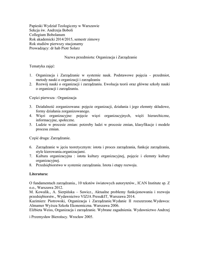 Papieski Wydział Teologiczny w Warszawie Sekcja św. Andrzeja Boboli Collegium Bobolanum Rok akademicki 2014/2015, semestr zimowy Rok studiów pierwszy stacjonarny Prowadzący: dr hab Piotr Solarz Nazwa przedmiotu: Organizacja i Zarządzanie Tematyka zajęć: 1. Organizacja i Zarządzanie w systemie nauk. Podstawowe pojęcia - przedmiot, metody nauki o organizacji i zarządzaniu 2. Rozwój nauki o organizacji i zarządzaniu. Ewolucja teorii oraz główne szkoły nauki o organizacji i zarządzaniu. Części pierwsza : Organizacja 3. Działalność zorganizowana: pojęcie organizacji, działania i jego elemnty składowe, formy działania zorganizowanego. 4. Więzi organizacyjne: pojęcie więzi organizacyjnych, więźi hierarchiczne, informacyjne, społeczne. 5. Ludzie w procesie zmian: potzreby ludzi w procesie zmian, klasyfikacje i modele procesu zmian. Część druga: Zarządzanie. 6. Zarządzanie w jęciu teoretycznym: istota i proces zarządzania, funkcje zarządzania, style kierowania.organizacjami. 7. Kultura organizacyjna : istota kultury organizacyjnej, pojęcie i elemnty kultury organizacyjnej. 8. Przedsiębiorstwo w systemie zarządzania. Istota i etapy rozwoju. Literatura: O fundamentach zarządzania., 10 tekstów światowych autorytetów., ICAN Institute sp. Z o.o., Warszawa 2012. M. Kowalik., A. Sierpińska – Sawicz., Aktualne problemy funkcjonowania i rozwoju przedsiębiorstw., Wydawnictwo VIZJA Press&IT, Warszawa 2014. Kazimierz Piotrowski, Organizacja i Zarządzanie.Wydanie II rozszerzone.Wydawca: Almamer Wyższa Szkoła Ekonomiczna. Warszawa 2006. Elżbieta Weiss, Organizacja i zarządzanie. Wybrane zagadnienia. Wydawnictwo Andrzej i Przemysław Bierońscy. Wrocław 2005. Papieski Wydział Teologiczny w Warszawie Sekcja św. Andrzeja Boboli Collegium Bobolanum Rok akademicki 2014/2015, semestr letni Rok studiów pierwszy stacjonarny Prowadzący: dr hab. Piotr Solarz Nazwa przedmiotu: Polityka społeczna i gospodarcza. Tematyka zajęć: Wprowadzenie 1. Polityka społeczna i gospodarcza w systemie nauk. Podstawowe pojęcia przedmiot, metody nauki o gospodarce. 2. Rozwój nauki o gospodarce. Ewolucja teorii oraz główne doktryny polityki społecznej i gospodarczej. Części pierwsza : Polityka gospodarcza 3. Podstawowe cele polityki gospodarczej: standardy polityki gospodarczej, stopa bezrobocia, inflacja, PKB. 4. Polityka pieniężna: funkcje oraz formy pieniądza, instrumenty wpływające na podaż pieniądza. 5. Polityka fiskalna: zakres i funkcje, budżet państwa oraz problemy kształtowania funkcjonowania systemów podatkowych. Część druga: Polityka społeczna. 6. Rynek pracy w teorii: według ekonomii neoklasycznej, keynesowskiej 7. Bezrobocie: przyczyny oraz relacje z rynkiem pracy. 8. Wpływ czynników ekonomicznych na politykę społeczną w państwie. Literatura: 1. Acocella N., Zasady polityki gospodarczej, PWN, Warszawa 2002, 2. Mirosław Geise., Wprowadzenie do polityki gospodarczej. Wybrane zagadnienia. Wydawnictwo Adam Marszałek, Toruń 2008. 3. Kaja J., Polityka gospodarcza, Wydawnictwo SGH, Warszawa 2006 4.Irena Pietrzyk – Polityka regionalna Unii Europejskiej i regiony w państwach członkowskich”., Wydawnictwo Naukowe PWN, Warszawa 2000r. 5.Winiarski B. (red.), Polityka gospodarcza, PWN, Warszawa 2006, http://www.cor.eu.int/ http://www.ces.eu.int/ Papieski Wydział Teologiczny w Warszawie Sekcja św. Andrzeja Boboli Collegium Bobolanum Rok akademicki 2014/2015, semestr letni Rok studiów pierwszy stacjonarny Prowadzący: dr hab Piotr Solarz Nazwa przedmiotu: Nauka o polityce - ćwiczenia Treści kształcenia: Pierwsza część – Polityka we współczesnym państwie 1. Zajęcia organizacyjne. Wprowadzenie: pojęcie polityki i metody badawcze nauk politycznych. 2. Nauka o polityce w systemie dyscyplin naukowych. Część druga – Struktury polityczne współczesnego państwa. 3. Zachowania, działania i zasoby polityczne 4. Pojęcie władzy politycznej 5. System polityczny państwa. 6. Organy współczesnego państwa 7. Współczesne procesy polityczne: reforma, rewolucja i transformacja. 8. Definicja oraz cechy i formy rządzenia. 9. Podmioty, procesy, działania i decyzje polityczne 10. Globalizacja i europeizacja. Literatura: Frank Bealey., Dictionary of Political Science., Blackwell Publishers., Oxford 2000. K. von Beyme., Współczesne teorie polityczne, Warszawa 2005 Chmaj M., Żmigrodzki M., Wprowadzenie do teorii polityki, Lublin 1998r. V. van Dyke, Wprowadzenie do polityki, Poznań 2000r. Dubel L., Korybski A., Markwart Z., Wprowadzenie do nauki o państwie i polityce, Zakamycze 2002. Grochalski S.M., Nauka o polityce, Opole 1990. A.Heywood, Politologia, PWN Warszawa 2006r. - Klucz do politologii, Wydawnictwo Naukowe PWN, Warszawa 2008r. Mols, Lauth, Wagner – Politikwissenschaft: Eine Einführung., 3 Auflage, Schöningh 2001. Ryszka F., Nauka o polityce. Rozważania metodologiczne, Warszawa 1994r. Tansey S., Nauki polityczne., Zyska – S-ka, Poznań 1995r. Zieliński E., Nauka o państwie i polityce, Warszawa 1999r. Wojtaszczyk K., Kompendium wiedzy o państwie współczesnym., Liber., Warszawa1999r. Papieski Wydział Teologiczny w Warszawie Sekcja św. Andrzeja Boboli Collegium Bobolanum Rok akademicki 2014/2015, semestr zimowy Rok studiów trzeci stacjonarny Prowadzący: dr hab. Piotr Solarz Nazwa przedmiotu: Bezpieczeństwo w Unii Europejskiej Tematyka zajęć: 1. Bezpieczeństwo w systemie nauk. Podstawowe pojęcia - przedmiot, metody nauki o bezpieczeństwie. 2. Rozwój nauki o bezpieczeństwie. Ewolucja teorii oraz główne szkoły nauki o bezpieczeństwie. 3. Zagrożenia dla współczesnej Europy. Źródła zagrożeń. Kategoria zagrożeń (konfliktów) asymetrycznych. 4. Rozwój integracji europejskiej w zakresie bezpieczeństwa. Integracja europejska jako projekt polityczny realizowany środkami ekonomicznymi . Rozszerzanie i pogłębianie integracji. Etapy pogłębiania integracji europejskiej 5. Wspólna polityka zagran
