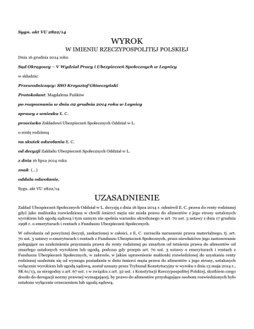 Sygn. akt VU 2822/14 WYROK W IMIENIU RZECZYPOSPOLITEJ POLSKIEJ Dnia 16 grudnia 2014 roku Sąd Okręgowy – V Wydział Pracy i Ubezpieczeń Społecznych w Legnicy w składzie: Przewodniczący: SSO Krzysztof Główczyński Protokolant: Magdalena Pańków po rozpoznaniu w dniu 02 grudnia 2014 roku w Legnicy sprawy z wniosku E. C. przeciwko Zakładowi Ubezpieczeń Społecznych Oddział w L. o rentę rodzinną na skutek odwołania E. C. od decyzji Zakładu Ubezpieczeń Społecznych Oddział w L. z dnia 16 lipca 2014 roku znak (...) oddala odwołanie. Sygn. akt VU 2822/14 UZASADNIENIE Zakład Ubezpieczeń Społecznych Oddział w L. decyzją z dnia 16 lipca 2014 r. odmówił E. C. prawa do renty rodzinnej gdyż jako małżonka rozwiedziona w chwili śmierci męża nie miała prawa do alimentów z jego strony ustalonych wyrokiem lub ugodą sądową i tym samym nie spełnia warunku określonego w art. 70 ust. 3 ustawy z dnia 17 grudnia 1998 r. o emeryturach i rentach z Funduszu Ubezpieczeń Społecznych. W odwołaniu od powyższej decyzji, zaskarżonej w całości, z E. C. zarzuciła naruszenie prawa materialnego, tj. art. 70 ust. 3 ustawy o emeryturach i rentach z Funduszu Ubezpieczeń Społecznych, przez niewłaściwe jego zastosowanie polegające na uzależnieniu przyznania prawa do renty rodzinnej po zmarłym od istnienia prawa do alimentów od zmarłego ustalonych wyrokiem lub ugodą, podczas gdy przepis art. 70 ust. 3 ustawy o emeryturach i rentach z Funduszu Ubezpieczeń Społecznych, w zakresie, w jakim uprawnienie małżonki rozwiedzionej do uzyskania renty rodzinnej uzależnia się od wymogu posiadania w dniu śmierci męża prawa do alimentów z jego strony, ustalonych wyłącznie wyrokiem lub ugodą sądową, został uznany przez Trybunał Konstytucyjny w wyroku z dnia 13 maja 2014 r., SK 61/13, za niezgodny z art. 67 ust. 1 w związku z art. 32 ust. 1 Konstytucji Rzeczypospolitej Polskiej, skutkiem czego doszło do derogacji normy prawnej wymagającej, by prawo do alimentów przysługujące osobom rozwiedzionych było ustalone wyłącznie orzeczeniem lub ugodą sądową. Wskazując na powyższe, wnioskodawczyni wniosła o zmianę zaskarżonej decyzji i orzeczenie co do istoty sprawy poprzez przyznanie jej renty rodzinnej po zmarłym J. C. oraz zasądzenie kosztów postępowania, w tym kosztów zastępstwa adwokackiego, według norm przepisanych. W uzasadnieniu E. C. wskazała, że jej małżeństwo zostało rozwiązane w 2009 r. albowiem J. C. nadużywał alkoholu i zaciągał kredyty. Mimo orzeczonego rozwodu małżonkowie nie zaprzestali wspólnego pożycia i do śmierci J. C. mieszkali wspólnie i prowadzili wspólne gospodarstwo dowodowe. Mimo orzeczonego rozwodu E. C. i J. C. żyli jak małżeństwo. J. C. zarabiał ok. 4.000 zł miesięcznie, a wnioskodawczyni zarabiała około 1.456,84 zł miesięcznie. Ze względu na wyraźną dysproporcję zarobków, J. C. dobrowolnie, stale i regularnie, w każdym miesiącu przyczyniał się do utrzymania E. C. przekazując jej co miesiąc kwotę ok. 1.000 zł oraz finansując opłaty i zakupy. J. C. finansował także większe zakupy wnioskodawczyni, m.in. zakup słuchawek o wartości około 3.200 zł. E. i J. C. już po rozwodzie wspólnie spłacali kredyt. Zakład Ubezpieczeń Społecznych Oddział w L. wniósł o oddalenie odwołania i w uzasadnieniu odpowiedzi na odwołanie wskazał na okoliczności faktyczne wynikające z ustaleń zaskarżonej decyzji. Sąd ustalił następujący stan faktyczny. Prawomocnym wyrokiem z dnia 06 kwietnia 2009 r. Sąd Okręgowy w Legnicy I Wydział Cywilny rozwiązał małżeństwo powódki E. C. z pozwanym J. C. zawarte w dniu (...)- przez rozwód bez orzekania o winie. Mający ostatnie miejsce zamieszkania w G., ul. (...) J. C. zmarł (...) w G.. J. C. pozostawał w stosunku pracy w okresach: - od 02 lipca 1979 r. do 15 lipca 1990 r., (w tym zasadnicza służba wojskowa od 28 kwietnia 1980 r. do 02 kwietnia 1982 r.), - od 01 czerwca 1995 r. do 31 grudnia 2003 r., - od 01 stycznia 2004 r. do 04 czerwca 2014 r. Poza tym, w okresach: - od 04 sierpnia 1992 r. do 03 sierpnia 1993 r., - od 19 kwietnia 1994 r. do 14 października 1994 r. - od 19 kwietnia 1995 r. do 31 maja 1995 r. J. C. pobierał również zasiłki z tytułu pozostawania bez pracy. Łącznie posiadał 31 lat, 6 miesięcy i 19 dni okresów składkowych. J. C. zarabiał ostatnio około 4.000 zł brutto miesięcznie. E. C. pobiera od 30 listopada 2009 r. rentę z tytułu częściowej niezdolności do pracy, ostatnio w kwocie po 690 zł brutto (603,59 zł netto) miesięcznie a ponadto z tytułu pozostawania w stosunku pracy i wykonywania pracy porządkowej osiągała przychód, ostatnio w wysokości 1.608 zł brutto miesięcznie. Wnioskodawczyni otrzymuje ponadto zasiłek pielęgnacyjny w kwocie 153 zł. Jej częściowa niezdolność do pracy była orzekana wyłącznie z powodu uszkodzenia narządu słuchu. W orzeczeniu z 05 sierpnia 2014 r. komisja lekarska ZUS stwierdziła dalszą progresję ubytku słuchu, głuchotę ucha prawego oraz deficyt słuchu w uchu lewym, sięgającym 90-100 dB, z cechami społecznej niewydolności słuchu. Wnioskodawczyni złożyła pozew o rozwód w nadziei, że tym sposobem spowoduje, że jej mąż przestanie nadużywać alkoholu. Mimo orzeczonego rozwodu małżonkowie nie zaprzestali wspólnego pożycia i do śmierci J. C. mieszkali wspólnie i prowadzili wspólne gospodarstwo dowodowe. J. C. dobrowolnie w każdym miesiącu przekazywał wnioskodawczyni co miesiąc kwotę ok. 1.000 zł oraz finansował opłaty i zakupy. J. C. finansował także większe zakupy wnioskodawczyni, m.in. zakup słuchawek o wartości około 3.200 zł. E. i J. C. już po rozwodzie wspólnie spłacali kredyt. (n i e s p o r n e) Sąd zważył co następuje: Odwołanie nie zasługuje na uwzględnienie. Zgodnie z art. 65 ust. 1 ustawy z dnia 17 grudnia 1998 r. o emeryturach i rentach z Funduszu Ubezpieczeń Społecznych (Dz. U. z 2009 r., Nr