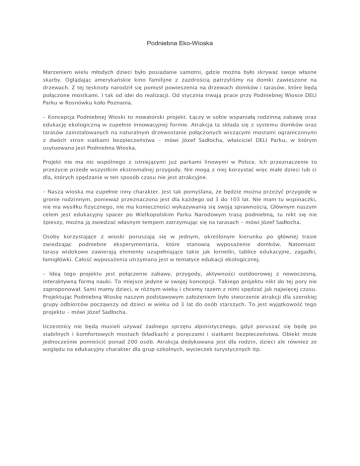 Podniebna Eko-Wioska Marzeniem wielu młodych dzieci było posiadanie samotni, gdzie można było skrywać swoje własne skarby. Oglądając amerykańskie kino familijne z zazdrością patrzyliśmy na domki zawieszone na drzewach. Z tej tęsknoty narodził się pomysł powieszenia na drzewach domków i tarasów, które będą połączone mostkami. I tak od idei do realizacji. Od stycznia trwają prace przy Podniebnej Wiosce DELI Parku w Rosnówku koło Poznania. – Koncepcja Podniebnej Wioski to nowatorski projekt. Łączy w sobie wspaniałą rodzinną zabawę oraz edukację ekologiczną w zupełnie innowacyjnej formie. Atrakcja ta składa się z systemu domków oraz tarasów zainstalowanych na naturalnym drzewostanie połączonych wiszącymi mostami ograniczonymi z dwóch stron siatkami bezpieczeństwa – mówi Józef Sadłocha, właściciel DELI Parku, w którym usytuowana jest Podniebna Wioska. Projekt nie ma nic wspólnego z istniejącymi już parkami linowymi w Polsce. Ich przeznaczenie to przeżycie przede wszystkim ekstremalnej przygody. Nie mogą z niej korzystać więc małe dzieci lub ci dla, których spędzanie w ten sposób czasu nie jest atrakcyjne. – Nasza wioska ma zupełnie inny charakter. Jest tak pomyślana, że będzie można przeżyć przygodę w gronie rodzinnym, ponieważ przeznaczona jest dla każdego od 3 do 103 lat. Nie mam tu wspinaczki, nie ma wysiłku fizycznego, nie ma konieczności wykazywania się swoją sprawnością. Głównym naszym celem jest edukacyjny spacer po Wielkopolskim Parku Narodowym trasą podniebną, tu nikt się nie śpieszy, można ją zwiedzać własnym tempem zatrzymując się na tarasach – mówi Józef Sadłocha. Osoby korzystające z wioski poruszają się w jednym, określonym kierunku po głównej trasie zwiedzając podniebne eksperymentaria, które stanowią wyposażenie domków. Natomiast tarasy widokowe zawierają elementy uzupełniające takie jak lornetki, tablice edukacyjne, zagadki, łamigłówki. Całość wyposażenia utrzymana jest w tematyce edukacji ekologicznej. – Ideą tego projektu jest połączenie zabawy, przygody, aktywności outdoorowej z nowoczesną, interaktywną formą nauki. To miejsce jedyne w swojej koncepcji. Takiego projektu nikt do tej pory nie zaproponował. Sami mamy dzieci, w różnym wieku i chcemy razem z nimi spędzać jak najwięcej czasu. Projektując Podniebną Wioskę naszym podstawowym założeniem było stworzenie atrakcji dla szerokiej grupy odbiorców począwszy od dzieci w wieku od 3 lat do osób starszych. To jest wyjątkowość tego projektu – mówi Józef Sadłocha. Uczestnicy nie będą musieli używać żadnego sprzętu alpinistycznego, gdyż poruszać się będę po stabilnych i komfortowych mostach (kładkach) z poręczami i siatkami bezpieczeństwa. Obiekt może jednocześnie pomieścić ponad 200 osób. Atrakcja dedykowana jest dla rodzin, dzieci ale również ze względu na edukacyjny charakter dla grup szkolnych, wycieczek turystycznych itp.