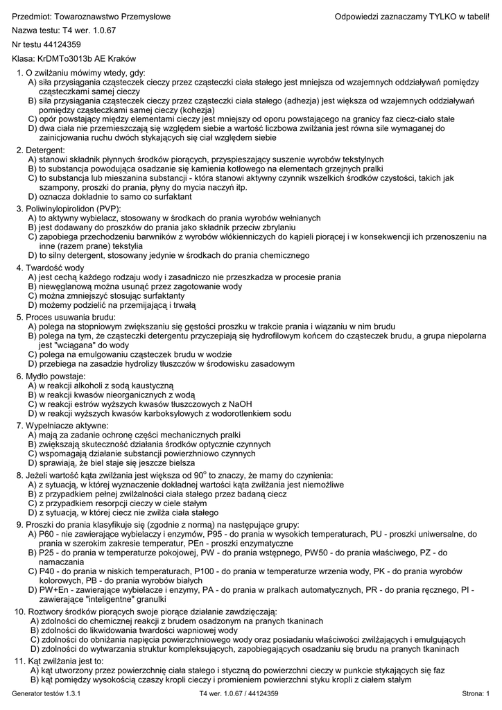 Przedmiot: Towaroznawstwo Przemysłowe Odpowiedzi zaznaczamy TYLKO w tabeli! Nazwa testu: T4 wer. 1.0.67 Nr testu 44124359 Klasa: KrDMTo3013b AE Kraków 1. O zwilŜaniu mówimy wtedy, gdy: A) siła przysiągania cząsteczek cieczy przez cząsteczki ciała stałego jest mniejsza od wzajemnych oddziaływań pomiędzy cząsteczkami samej cieczy B) siła przysiągania cząsteczek cieczy przez cząsteczki ciała stałego (adhezja) jest większa od wzajemnych oddziaływań pomiędzy cząsteczkami samej cieczy (kohezja) C) opór powstający między elementami cieczy jest mniejszy od oporu powstającego na granicy faz ciecz-ciało stałe D) dwa ciała nie przemieszczają się względem siebie a wartość liczbowa zwilŜania jest równa sile wymaganej do zainicjowania ruchu dwóch stykających się ciał względem siebie 2. Detergent: A) stanowi składnik płynnych środków piorących, przyspieszający suszenie wyrobów tekstylnych B) to substancja powodująca osadzanie się kamienia kotłowego na elementach grzejnych pralki C) to substancja lub mieszanina substancji - która stanowi aktywny czynnik wszelkich środków czystości, takich jak szampony, proszki do prania, płyny do mycia naczyń itp. D) oznacza dokładnie to samo co surfaktant 3. Poliwinylopirolidon (PVP): A) to aktywny wybielacz, stosowany w środkach do prania wyrobów wełnianych B) jest dodawany do proszków do prania jako składnik przeciw zbrylaniu C) zapobiega przechodzeniu barwników z wyrobów włókienniczych do kąpieli piorącej i w konsekwencji ich przenoszeniu na inne (razem prane) tekstylia D) to silny detergent, stosowany jedynie w środkach do prania chemicznego 4. Twardość wody A) jest cechą kaŜdego rodzaju wody i zasadniczo nie przeszkadza w procesie prania B) niewęglanową moŜna usunąć przez zagotowanie wody C) moŜna zmniejszyć stosując surfaktanty D) moŜemy podzielić na przemijającą i trwałą 5. Proces usuwania brudu: A) polega na stopniowym zwiększaniu się gęstości proszku w trakcie prania i wiązaniu w nim brudu B) polega na tym, Ŝe cząsteczki detergentu przyczepiają się hydrofilowym końcem do cząsteczek brudu, a grupa niepolarna jest "wciągana" do wody C) polega na emulgowaniu cząsteczek brudu w wodzie D) przebiega na zasadzie hydrolizy tłuszczów w środowisku zasadowym 6. Mydło powstaje: A) w reakcji alkoholi z sodą kaustyczną B) w reakcji kwasów nieorganicznych z wodą C) w reakcji estrów wyŜszych kwasów tłuszczowych z NaOH D) w reakcji wyŜszych kwasów karboksylowych z wodorotlenkiem sodu 7. Wypełniacze aktywne: A) mają za zadanie ochronę części mechanicznych pralki B) zwiększają skuteczność działania środków optycznie czynnych C) wspomagają działanie substancji powierzhniowo czynnych D) sprawiają, Ŝe biel staje się jeszcze bielsza 8. JeŜeli wartość kąta zwilŜania jest większa od 90o to znaczy, Ŝe mamy do czynienia: A) z sytuacją, w której wyznaczenie dokładnej wartości kąta zwilŜania jest niemoŜliwe B) z przypadkiem pełnej zwilŜalności ciała stałego przez badaną ciecz C) z przypadkiem resorpcji cieczy w ciele stałym D) z sytuacją, w której ciecz nie zwilŜa ciała stałego 9. Proszki do prania klasyfikuje się (zgodnie z normą) na następujące grupy: A) P60 - nie zawierające wybielaczy i enzymów, P95 - do prania w wysokich temperaturach, PU - proszki uniwersalne, do prania w szerokim zakresie temperatur, PEn - proszki enzymatyczne B) P25 - do prania w temperaturze pokojowej, PW - do prania wstępnego, PW50 - do prania właściwego, PZ - do namaczania C) P40 - do prania w niskich temperaturach, P100 - do prania w temperaturze wrzenia wody, PK - do prania wyrobów kolorowych, PB - do prania wyrobów białych D) PW+En - zawierające wybielacze i enzymy, PA - do prania w pralkach automatycznych, PR - do prania ręcznego, PI zawierające "inteligentne" granulki 10. Roztwory środków piorących swoje piorące działanie zawdzięczają: A) zdolności do chemicznej reakcji z brudem osadzonym na pranych tkaninach B) zdolności do likwidowania twardości wapniowej wody C) zdolności do obniŜania napięcia powierzchniowego wody oraz posiadaniu właściwości zwilŜających i emulgujących D) zdolności do wytwarzania struktur kompleksujących, zapobiegających osadzaniu się brudu na pranych tkaninach 11. Kąt zwilŜania jest to: A) kąt utworzony przez powierzchnię ciała stałego i styczną do powierzchni cieczy w punkcie stykających się faz B) kąt pomiędzy wysokością czaszy kropli cieczy i promieniem powierzchni styku kropli z ciałem stałym Generator testów 1.3.1 T4 wer. 1.0.67 / 44124359 Strona: 1 C) kąt utworzony przez powierzchnię ciała stałego i styczną do powierzchni kropli cieczy w jej najwyŜszym punkcie D) wielkość wyznaczana doświadczalnie przy uŜyciu surfaktometru [mPas] 12. Produktami ogrzewania tłuszczów ze stęŜonym roztworem NaOH są: A) mydło sodowe i glikol etylenowy B) mydło sodowe i gliceryna C) kwas tłuszczowy i gliceryna D) estry i woda 13. TAED to: A) tetraacetyloetylenodiamina, składnik środków piorących, odznaczających się zdolnością rozkładu utlenialnych zaplamień juŜ w temp. 40–60°C B) alkilofenoloetoksylany, grupa surfaktantów niejonowych C) kwas etylenodiaminotetraoctowy, ułatwia czyszczenie przez wiązanie (kompleksowanie) brudu i śladów metali cięŜkich D) liniowe sulfoniany alkilobenzenowe, anionowe środki powierzchniowo czynne 14. Surfaktant: A) to kaŜdy związek chemiczny, który posiada zdolność do obniŜania napięcia powierzchniowego cieczy, ułatwiając tym samym zdolność zwilŜania powierzchni ciał stałych przez te ciecze B) to związek chemiczny powodujący zahamowanie bądź spowolnienie chemicznych reakcji usuwania brudu, co pozwala na lepszą kontrolę procesu prania C) naleŜy do grupy związków o działaniu ochronnym dla kolorów, inaczej: inhibitor zaszarzania D) jest to ogólna nazwa wszystkich związków zawierających kwasy tłus