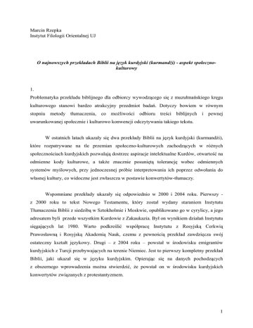 Marcin Rzepka Instytut Filologii Orientalnej UJ O najnowszych przekładach Biblii na język kurdyjski (kurmandżi) - aspekt społecznokulturowy 1. Problematyka przekładu biblijnego dla odbiorcy wywodzącego się z muzułmańskiego kręgu kulturowego stanowi bardzo atrakcyjny przedmiot badań. Dotyczy bowiem w równym stopniu metody tłumaczenia, co możliwości odbioru treści biblijnych i pewnej uwarunkowanej społecznie i kulturowo konwencji odczytywania takiego tekstu. W ostatnich latach ukazały się dwa przekłady Biblii na język kurdyjski (kurmandżi), które rozpatrywane na tle przemian społeczno-kulturowych zachodzących w różnych społecznościach kurdyjskich pozwalają dostrzec aspiracje intelektualne Kurdów, otwartość na odmienne kody kulturowe, a także znacznie posuniętą tolerancję wobec odmiennych systemów myślowych, przy jednoczesnej próbie interpretowania ich poprzez odwołania do własnej kultury, co widoczne jest zwłaszcza w postawie konwertytów-tłumaczy. Wspomniane przekłady ukazały się odpowiednio w 2000 i 2004 roku. Pierwszy z 2000 roku to tekst Nowego Testamentu, który został wydany staraniem Instytutu Tłumaczenia Biblii z siedzibą w Sztokholmie i Moskwie, opublikowano go w cyrylicy, a jego adresatem byli przede wszystkim Kurdowie z Zakaukazia. Był on wynikiem działań Instytutu sięgających lat 1980. Warto podkreślić współpracę Instytutu z Rosyjską Cerkwią Prawosławną i Rosyjską Akademią Nauk, czemu z pewnością przekład zawdzięcza swój ostateczny kształt językowy. Drugi – z 2004 roku – powstał w środowisku emigrantów kurdyjskich z Turcji przebywających na terenie Niemiec. Jest to pierwszy kompletny przekład Biblii, jaki ukazał się w języku kurdyjskim. Opierając się na danych pochodzących z obszernego wprowadzenia można stwierdzić, że powstał on w środowisku kurdyjskich konwertytów związanych z protestantyzmem. 1 Wspomniane przekłady ukazują złożoność relacji pomiędzy kulturą a przekładem począwszy od roli przekładów w rozwoju języków i kultur, w tym roli i miejsca przekładu biblijnego w kulturze kurdyjskiej po osobę tłumacza – pośrednika między językami i kulturami. 2. Niewątpliwie przekład jest jednym ze sposobów wzbogacania kultury. Niebagatelną rolę w tym procesie odgrywają również przekładane teksty. Bezwzględnie najczęściej tłumaczonym tekstem w historii była (i wciąż jest) Biblia. Antoni Furdal mówiąc o roli przekładów w kształtowaniu języków literackich europejskiego kręgu kulturowego przytacza opinię Pawła Šafarika, popularną w XIX wieku, iż „narody to są te zbiorowości, które mają Biblię we własnym języku”1. W takim ujęciu Biblia i jej tłumaczenie nie jest jedynie tekstem religijnym ale przede wszystkim kulturowym poświadczającym wysoki poziom rozwoju danej społeczności. Abstrahując od aspektów religijnych związanych z tłumaczeniem Biblii poruszony tu problem – narodowy, społeczny i w końcu kulturowy wydaje się dość istotny również w przypadku społeczności kurdyjskiej. Przyjrzyjmy się jednak najpierw roli przekładów literackich w historii języka kurdyjskiego. Złożona sytuacja polityczna narodu kurdyjskiego podzielonego pomiędzy różne państwa nie ułatwiała powstawania jednolitych wzorów literackich wśród Kurdów. Literatura, jaka rozwijała się na tym obszarze podlegała wpływom oficjalnych języków tych państw, w obrębie których znajdowała się dana część Kurdystanu. Za pośrednictwem tych języków docierała do nich literatura światowa, i jak się wydaje początkowo z tych językówpośredników była tłumaczona. Dotyczy to zwłaszcza tych państw, które zezwalały Kurdom na pewną autonomię i oferowały możliwość rozwoju kulturalnego. Pierwsze tłumaczenia z literatury światowej na język kurdyjski pojawiają się stosunkowo późno. To również związane jest z faktem, iż był on przez długi czas głównie środkiem komunikacji ustnej. Sytuacja ta zaczęła się zmieniać pod koniec XIX wieku, co ma związek z publikacją pierwszej gazety po kurdyjsku Kurdistan w 1898 roku w Kairze. Oczywiście problem potęguje kwestia alfabetu, jaki miałby być używany przez Kurdów w różnych państwach i ma on bardzo praktyczne przełożenie na powstawanie (lub nie) 1 A. Furdal, Językoznawstwo otwarte, Wrocław-Warszawa-Kraków 2000, 184. 2 translacji biblijnych. Powszechna jest też opinia, że w porównaniu z innymi językami używanymi na Bliskim Wschodzie literatura tłumaczeniowa w języku kurdyjskim pojawiła się stosunkowo późno2. Ruch translatorski nie wynika jedynie ze zmieniającej się sytuacji narodu kurdyjskiego w krajach Bliskiego Wschodu, ale przede wszystkim ze wzmożonej działalności emigrantów. Większość pisarzy kurdyjskich przebywających na emigracji zajmuje się równocześnie tłumaczeniem. Nie ulega wątpliwości, że literatura przekładowa w znacznym stopniu wpływa na rozwój i ewolucję języka kurdyjskiego, chociaż jest ona efektem działań ostatnich kilku dziesięcioleci, na co zwraca uwagę kurdyjski badacz Hashem Ahmadzadeh podając listę tłumaczonych autorów: Beckett, Dostojewski, Camus, Joyce i Marquez3. Warto zwrócić uwagę na aktywność samych Kurdów w propagowaniu wiedzy na temat własnego języka. Do nich należą zwłaszcza Dżeladet Bedyr-chan (Celadet Elî Bedirxan) autor gramatyki języka kurdyjskiego, napisanej po francusku ale również fragmentów tłumaczeń Ewangelii wspólnie z francuskim dominikaninem Thomasem Bois. Biorąc pod uwagę trudności polityczne, jakie dotykają naród kurdyjski, zwłaszcza w Turcji i Syrii, można zastanawiać się nad funkcją społeczną tłumacza w takim środowisku. Z interesującego raportu, który opublikował N. Malmisanij w ramach projektu fundacji Next Page, wynika, iż praca w zakresie tłumaczenia na język kurdyjski (w Turcji) nie jest traktowana jako zawód, co przyczynia 