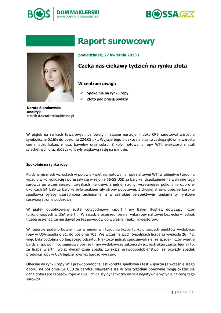 Raport surowcowy poniedziałek, 27 kwietnia 2015 r. Czeka nas ciekawy tydzień na rynku złota W centrum uwagi: • • Spokojnie na rynku ropy Złoto pod presją podaży Dorota Sierakowska Analityk e-mail: [email protected] W piątek na rynkach towarowych panowały mieszane nastroje. Indeks CRB zanotował wzrost o symboliczne 0,16% do poziomu 224,05 pkt. Wyjście tego indeksu na plus to zasługa głównie wzrostu cen miedzi, kakao, mięsa, bawełny oraz cukru. Z kolei notowania ropy WTI, większości metali szlachetnych oraz zbóż zakończyły piątkową sesję na minusie. Spokojnie na rynku ropy Po dynamicznych wzrostach w połowie kwietnia, notowania ropy naftowej WTI w ubiegłym tygodniu wpadły w konsolidację i poruszały się w rejonie 56-58 USD za baryłkę. Uspokojenie na wykresie tego surowca po wcześniejszych zwyżkach nie dziwi. Z jednej strony, wcześniejsze pokonanie oporu w okolicach 54 USD za baryłkę było znakiem siły strony popytowej. Z drugiej strony, obecnie korekta spadkowa byłaby uzasadniona technicznie, a w szerokiej perspektywie fundamenty rynkowe sprzyjają stronie podażowej. W piątek opublikowany został cotygodniowy raport firmy Baker Hughes, dotyczący liczby funkcjonujących w USA wiertni. W zasadzie przeszedł on na rynku ropy naftowej bez echa – jednak trzeba przyznać, że nie dawał on też powodów do wyraźnej reakcji inwestorów. W raporcie podano bowiem, że w minionym tygodniu liczba funkcjonujących punktów wydobycia ropy w USA spadła o 31, do poziomu 703. We wcześniejszych tygodniach liczba ta wyniosła 26 i 42, więc była podobna do bieżącego odczytu. Niektórzy jednak spodziewali się, że spadek liczby wiertni bardziej spowolni, co sugerowałoby, że firmy wydobywcze zakończyły już restrukturyzację. Jednak to, że liczba wiertni wciąż dynamicznie spada, zwiększa prawdopodobieństwo, że przyszły spadek produkcji ropy w USA będzie również bardzo wyraźny. Obecnie na rynku ropy WTI prawdopodobna jest korekta spadkowa i test wsparcia (a wcześniejszego oporu) na poziomie 54 USD za baryłkę. Najważniejsze w tym tygodniu ponownie mogą okazać się dane dotyczące zapasów ropy w USA. Ich dalszy dynamiczny wzrost negatywnie wpłynie na cenę tego surowca. 1|Strona Wykres 1. Notowania ropy naftowej WTI – dane dzienne. Złoto pod presją podaży Tymczasem na rynku złota pierwsze skrzypce gra strona podażowa. Po czwartkowej zwyżce na niskim wolumenie, w piątek cena złota spadła o 1,2%, schodząc na koniec dnia do okolic 1177 USD za uncję. Dzisiaj rano notowania złota poruszają się w rejonie piątkowego zamknięcia. Mimo sprzyjającej wzrostom cen złota słabości dolara w ostatnich dniach, cena złota znajduje się pod presją podaży, wynikającą z innych czynników, m.in. siły rynku akcji (jako alternatywy dla inwestowania na rynku złota) oraz słabego popytu na złoto w formie fizycznej. W tym tygodniu na rynku żółtego kruszcu będzie ciekawie, bowiem inwestorzy wypatrują środowego komunikatu po posiedzeniu FOMC, który może wyraźniej nakreślić plany Fed w zakresie ewentualnych podwyżek stóp procentowych. Ostatnie rozczarowujące dane makro z USA wzbudziły spekulacje, że podwyżka nie nastąpi zbyt prędko – to zaś nieco osłabiło amerykańską walutę. Relatywnie ważne dla cen złota mogą się okazać wydarzenia w Europie, a dokładniej – zamieszanie wokół Grecji. W weekend niemiecki minister finansów zasugerował, że Niemcy przygotowują się na scenariusz ewentualnego greckiego bankructwa – to budzi większą niepewność co do przyszłości Grecji w strefie euro. Jeśli zwiększyłoby się prawdopodobieństwo takiego scenariusza, to mogłoby to wywindować notowania złota w górę, ponieważ surowiec ten jest traktowany jako „bezpieczna przystań”. Jednak na razie, w krótkim terminie, dalsze spadki są wciąż bardziej prawdopodobne. 2|Strona Wykres 2. Notowania złota – dane dzienne. ---Prezentowany raport został przygotowany w Wydziale Doradztwa i Analiz Rynkowych Domu Maklerskiego Banku Ochrony Środowiska S.A. z siedzibą w Warszawie tylko i wyłącznie w celach informacyjnych i nie stanowi analizy inwestycyjnej, ani analizy finansowej ani rekomendacji w rozumieniu przepisów Rozporządzenia Ministra Finansów z dnia 19 października 2005r. (Dz.U. 2005, poz. 206 nr 1715) oraz Ustawy z dnia 29 lipca 2005r. (Dz.U. 2005, Nr 183, poz. 1538 z późn. zm.). Przedstawiony raport jest wyłącznie wyrazem wiedzy i poglądów autora według stanu na dzień sporządzenia i w żadnym wypadku nie może być podstawą działań inwestycyjnych Klienta. Przy sporządzaniu raportu DM BOŚ SA działał z należytą starannością oraz rzetelnością. DM BOŚ SA i jego pracownicy nie ponoszą jednak odpowiedzialności za działania lub zaniechania Klienta podjęte na podstawie niniejszego raportu ani za szkody poniesione w wyniku tych decyzji inwestycyjnych. Niniejszy raport adresowany jest do nieograniczonego kręgu odbiorców. Został sporządzony na potrzeby klientów DM BOŚ S.A. oraz innych osób zainteresowanych. Nadzór nad DM BOŚ SA sprawuje Komisja Nadzoru Finansowego. Regulamin doradztwa inwestycyjnego i sporządzania analiz inwestycyjnych, analiz finansowych oraz innych rekomendacji o charakterze ogólnym dotyczących transakcji w zakresie instrumentów finansowych oraz instrumentów bazowych instrumentów pochodnych znajduje się na stronie internetowej bossa.pl w dziale Dokumenty. 3|Strona