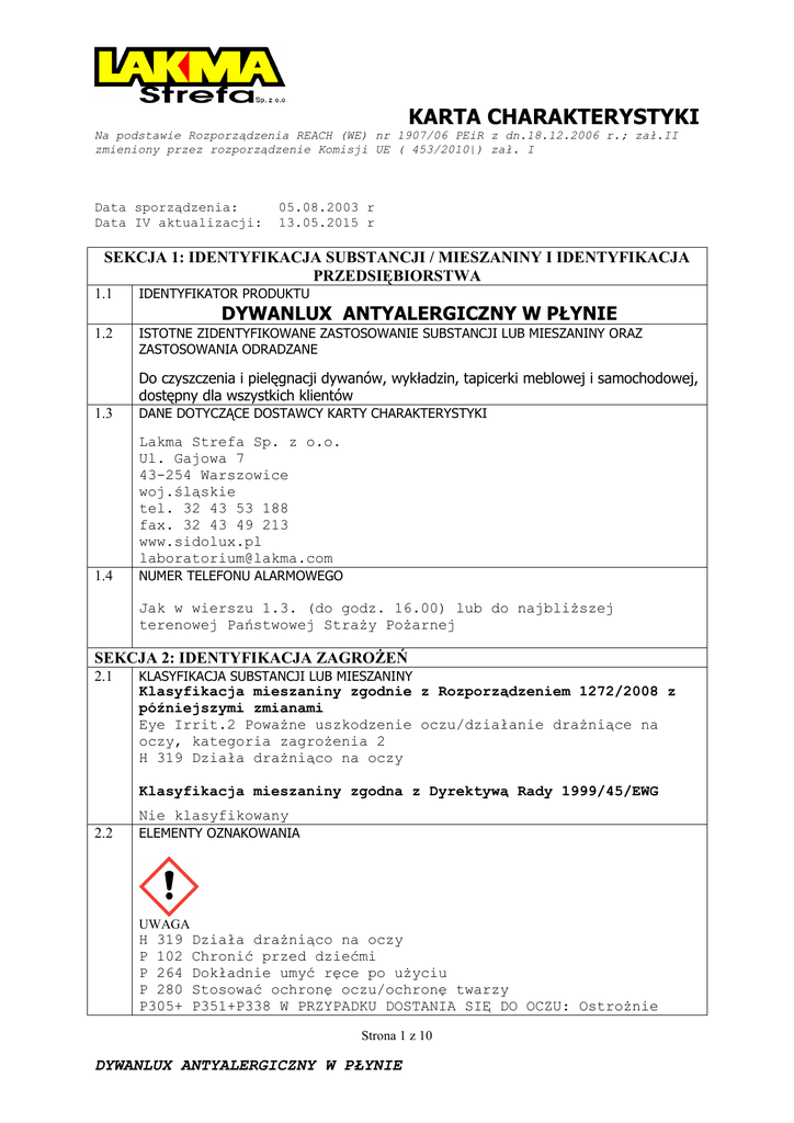 KARTA CHARAKTERYSTYKI Na podstawie Rozporządzenia REACH (WE) nr 1907/06 PEiR z dn.18.12.2006 r.; zał.II zmieniony przez rozporządzenie Komisji UE ( 453/2010|) zał. I Data sporządzenia: Data IV aktualizacji: 05.08.2003 r 13.05.2015 r SEKCJA 1: IDENTYFIKACJA SUBSTANCJI / MIESZANINY I IDENTYFIKACJA PRZEDSIĘBIORSTWA 1.1 IDENTYFIKATOR PRODUKTU 1.2 ISTOTNE ZIDENTYFIKOWANE ZASTOSOWANIE SUBSTANCJI LUB MIESZANINY ORAZ ZASTOSOWANIA ODRADZANE DYWANLUX ANTYALERGICZNY W PŁYNIE Do czyszczenia i pielęgnacji dywanów, wykładzin, tapicerki meblowej i samochodowej, dostępny dla wszystkich klientów 1.3 DANE DOTYCZĄCE DOSTAWCY KARTY CHARAKTERYSTYKI Lakma Strefa Sp. z o.o. Ul. Gajowa 7 43-254 Warszowice woj.śląskie tel. 32 43 53 188 fax. 32 43 49 213 www.sidolux.pl [email protected] 1.4 NUMER TELEFONU ALARMOWEGO Jak w wierszu 1.3. (do godz. 16.00) lub do najbliŜszej terenowej Państwowej StraŜy PoŜarnej SEKCJA 2: IDENTYFIKACJA ZAGROśEŃ 2.1 KLASYFIKACJA SUBSTANCJI LUB MIESZANINY Klasyfikacja mieszaniny zgodnie z Rozporządzeniem 1272/2008 z późniejszymi zmianami Eye Irrit.2 PowaŜne uszkodzenie oczu/działanie draŜniące na oczy, kategoria zagroŜenia 2 H 319 Działa draŜniąco na oczy Klasyfikacja mieszaniny zgodna z Dyrektywą Rady 1999/45/EWG Nie klasyfikowany 2.2 ELEMENTY OZNAKOWANIA UWAGA H 319 P 102 P 264 P 280 P305+ Działa draŜniąco na oczy Chronić przed dziećmi Dokładnie umyć ręce po uŜyciu Stosować ochronę oczu/ochronę twarzy P351+P338 W PRZYPADKU DOSTANIA SIĘ DO OCZU: OstroŜnie Strona 1 z 10 DYWANLUX ANTYALERGICZNY W PŁYNIE KARTA CHARAKTERYSTYKI Na podstawie Rozporządzenia REACH (WE) nr 1907/06 PEiR z dn.18.12.2006 r.; zał.II zmieniony przez rozporządzenie Komisji UE ( 453/2010|) zał. I płukać wodą przez kilka minut. Wyjąć soczewki kontaktowe, jeŜeli są i moŜna je łatwo usunąć. Nadal płukać. P337+P313 W przypadku utrzymywania się działania draŜniącego na oczy, zasięgnąć porady/ zgłosić się pod opiekę lekarza Składniki: Dywanlux antyalergiczny kwiatowy : <5% anionowe środki powierzchniowo czynne< 15 %, kompozycja zapachowa, < 5% związki wybielające na bazie tlenu Dywanlux antyalergiczny morski: <5% anionowe środki powierzchniowo czynne< 15 %, kompozycja zapachowa ( Benzyl Salicylate ), < 5% związki wybielające na bazie tlenu Dywanlux antyalergiczny zapach mydła marsylskiego: <5% anionowe środki powierzchniowo czynne< 15 %, kompozycja zapachowa (Benzyl Salicylate, Citronellol, Coumarin, Geraniol, Hexyl Cinnamal,Linalool),< 5% związki wybielające na bazie tlenu 2.3 INNE ZAGROśENIA NIE ZNANE SEKCJA 3:SKŁAD/ INFORMACJA O SKŁADNIKACH 3.1 3.2 SUBSTANCJE Nie dotyczy MIESZANINY NIEBEZPIECZNE SKŁADNIKI MIESZANINY (WE) 1272/2008 Nazwa Chemiczna/ Nazwa INCI Alkohol etylowy całkowicie skaŜony Nadtlenek wodoru 35 % roztwór Kwas siarkowy, mono-C12-C14 estry alkilowe, sole sodowe / Sodium Lauryl Sulfate Sól sodowa eteru kwasu sulfo-,2-[kokoamino]etylo]butanodiowego Nr CAS Nr WE Nr indeksowy Nr rejestracji Klasyfikacja ( Dyrektywa 67/548/EEC) Klasyfikacja (Rozporządzenie (EC) nr 1272/2008 StęŜenie [%] 64-17-5 200-578-6 603-002-00-5 01-2119457610-43-xxxx 7722-84-1 231-765-0 008-003-00-9 85586-07-8 287-809-4 --01-2119489463-28-0004 68784-08-7 272-219-1 F+ R11 Flam Liq. 2 H 225 1-6 Xn R22 Xi R37/38, R41 Xn R22 Xi R38, R41 Skin Irrit 2 H315 Eye Dam 1 H 318 STOT SE 3H 335 Acute tox4 H 302 Skin Irrit 2 H 315 Eye Dam 1 H 318 1-5 Xi R36/38 Eye Irrit 2 H 319 Skin Irrit 2 H 315 1-3 1-3 SEKCJA 4: ŚRODKI PIERWSZEJ POMOCY 4.1 Opis środków pierwszej pomocy W przypadku wystąpienia jakichkolwiek niepokojących objawów natychmiast lekarza lub odwieźć poszkodowanego do szpitala, kartę charakterystyki, opakowanie produktu lub etykietę. Inhalacja W warunkach normalnych zagroŜenie praktycznie nie istnieje. warunkach awaryjnych wyprowadzić lub wynieść poszkodowanego świeŜe powietrze. Kontakt z oczami Przepłukać obficie wodą, jeŜeli podraŜnienie oczu utrzymuje skonsultować się ze specjalistą. Kontakt ze skórą Strona 2 z 10 DYWANLUX ANTYALERGICZNY W PŁYNIE wezwać pokazać W na się, KARTA CHARAKTERYSTYKI Na podstawie Rozporządzenia REACH (WE) nr 1907/06 PEiR z dn.18.12.2006 r.; zał.II zmieniony przez rozporządzenie Komisji UE ( 453/2010|) zał. I Zapobiegawczo umyć wodą z mydłem. W przypadku podraŜnienia skóry skonsultować się z lekarzem. Połknięcie: Wypić 1-2 szklanki wody. W razie potrzeb skontaktować się z lekarzem, pokazać kartę charakterystyki, opakowanie produktu lub etykietę. Nieprzytomnej osobie nigdy nie podawać nic doustnie. 4.2 NAJWAśNIEJSZE OSTRE I OPÓŹNIONE OBJAWY ORAZ SKUTKI NARAśENIA Patrz pkt 11. 4.3 WSKAZANIA DOTYCZĄCE WSZELKIEJ NATYCHMIASTOWEJ POMOCY LEKARSKIEJ I SZCZEGÓLNEGO POSTĘPOWANIA Z POSZKODOWANYM Brak danych SEKCJA 5: POSTĘPOWANIE W PRZYPADKU POśARU 5.1 ŚRODKI GAŚNICZE dwutlenek węgla, proszki gaśnicze, gaśnica pianowa, prądy wodne rozproszone. 5.2 SZCZEGÓLNE ZAGROśENIE ZWIĄZANE Z SUBSTANCJĄ LUB MIESZANINĄ podczas poŜaru powstają niebezpieczne dla zdrowia pary i dymy, które mogą zawierać tlenki węgla, siarki oraz związki organiczne i nieorganiczne. Nie wdychać dymów. 5.3 INFORMACJE DLA STRAśY POśARNEJ: odzieŜ gazoszczelna i aparaty izolujące drogi oddechowe niezaleŜne od otaczającego powietrza. SEKCJA 6: POSTĘPOWANIE W PRZYPADKU NIEZAMIERZONEGO UWOLNIENIA DO ŚRODOWISKA 6.1 INDYWIDUALNE ŚRODKI OCHRONY, WYPOSAśENIE OCHRONNE I PROCEDURY W SYTUACJACH AWARAYJNYCH Nie dopuszczać osób postronnych i nieupowaŜnionych. Unikać bezpośredniego kontaktu z produktem, zapewnić wentylację, stosować odpowiednie środki ochrony indywidualnej, patrz pkt.8. 6.2 ŚRODKI OSTROśNOŚCI W ZAKRESIE OCHRONY ŚRODOWISKA Zapobiegać zanieczyszczeniu gleby i wody oraz przedostaniu się do kanalizacji, rowów lub rzek. 6.3 6.4 METODY I MATERIAŁY ZAPOBIEGAJĄCE ROZPRZESTRZENIANIU SIĘ SKAśENIA I SŁUśĄCE DO USUWANIA SKAśENIA Niewielkie ilości uwolnionego materia