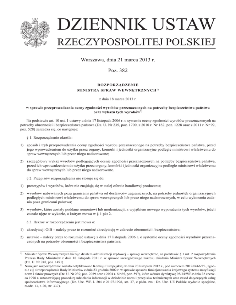 DZIENNIK USTAW RZECZYPOSPOLITEJ POLSKIEJ Warszawa, dnia 21 marca 2013 r. Poz. 382 ROZPORZĄDZENIE MINISTRA SPRAW WEWNĘTRZNYCH 1) z dnia 18 marca 2013 r. w sprawie przeprowadzania oceny zgodności wyrobów przeznaczonych na potrzeby bezpieczeństwa państwa oraz wykazu tych wyrobów2) Na podstawie art. 10 ust. 1 ustawy z dnia 17 listopada 2006 r. o systemie oceny zgodności wyrobów przeznaczonych na potrzeby obronności i bezpieczeństwa państwa (Dz. U. Nr 235, poz. 1700, z 2010 r. Nr 182, poz. 1228 oraz z 2011 r. Nr 92, poz. 528) zarządza się, co następuje: § 1. Rozporządzenie określa: 1)sposób i tryb przeprowadzania oceny zgodności wyrobu przeznaczonego na potrzeby bezpieczeństwa państwa, przed jego wprowadzeniem do użytku przez organy, komórki i jednostki organizacyjne podległe ministrowi właściwemu do spraw wewnętrznych lub przez niego nadzorowane; 2)szczegółowy wykaz wyrobów podlegających ocenie zgodności przeznaczonych na potrzeby bezpieczeństwa państwa, przed ich wprowadzeniem do użytku przez organy, komórki i jednostki organizacyjne podległe ministrowi właściwemu do spraw wewnętrznych lub przez niego nadzorowane. § 2. Przepisów rozporządzenia nie stosuje się do: 1)prototypów i wyrobów, które nie znajdują się w stałej ofercie handlowej producenta; 2)wyrobów nabywanych poza granicami państwa od dostawców zagranicznych, na potrzeby jednostek organizacyjnych podległych ministrowi właściwemu do spraw wewnętrznych lub przez niego nadzorowanych, w celu wykonania zadania poza granicami państwa; 3)wyrobów, które zostały poddane remontowi lub modernizacji, z wyjątkiem nowego wyposażenia tych wyrobów, jeżeli zostało ujęte w wykazie, o którym mowa w § 1 pkt 2. § 3. Ilekroć w rozporządzeniu jest mowa o: 1)akredytacji OiB – należy przez to rozumieć akredytację w zakresie obronności i bezpieczeństwa; 2)ustawie – należy przez to rozumieć ustawę z dnia 17 listopada 2006 r. o systemie oceny zgodności wyrobów przeznaczonych na potrzeby obronności i bezpieczeństwa państwa; Minister Spraw Wewnętrznych kieruje działem administracji rządowej – sprawy wewnętrzne, na podstawie § 1 ust. 2 rozporządzenia Prezesa Rady Ministrów z dnia 18 listopada 2011 r. w sprawie szczegółowego zakresu działania Ministra Spraw Wewnętrznych (Dz. U. Nr 248, poz. 1491). 2) Niniejsze rozporządzenie zostało notyfikowane Komisji Europejskiej w dniu 28 listopada 2012 r., pod numerem 2012/0666/PL, zgodnie z § 4 rozporządzenia Rady Ministrów z dnia 23 grudnia 2002 r. w sprawie sposobu funkcjonowania krajowego systemu notyfikacji norm i aktów prawnych (Dz. U. Nr 239, poz. 2039 oraz z 2004 r. Nr 65, poz. 597), które wdraża dyrektywę 98/34/WE z dnia 22 czerwca 1998 r. ustanawiającą procedurę udzielania informacji w dziedzinie norm i przepisów technicznych oraz zasad dotyczących usług społeczeństwa informacyjnego (Dz. Urz. WE L 204 z 21.07.1998, str. 37, z późn. zm.; Dz. Urz. UE Polskie wydanie specjalne, rozdz. 13, t. 20, str. 337). 1) Dziennik Ustaw –2– Poz. 382 3)trybie I – należy przez to rozumieć czynności, o których mowa w art. 6 ust. 1 pkt 1 ustawy; 4)trybie II – należy przez to rozumieć czynności, o których mowa w art. 6 ust. 1 pkt 2 ustawy; 5)trybie III – należy przez to rozumieć czynności, o których mowa w art. 6 ust. 1 pkt 3 ustawy. § 4. Specyfikację techniczną wyrobu dołącza się jako załącznik do umowy na dostawę wyrobu lub do innego dokumentu zawierającego warunki zamówienia. § 5. W przypadku prowadzenia oceny zgodności w trybie I, dostawca, który nie jest producentem wyrobu, może potwierdzić dokonanie czynności, o których mowa w art. 6 ust. 1 pkt 1 ustawy, wykorzystując właściwe dokumenty udostępnione przez producenta wyrobu. § 6. W przypadku prowadzenia oceny zgodności w trybie II, dostawca, zlecając wykonanie czynności, o których mowa w art. 6 ust. 1 pkt 2 ustawy, ustala, czy jednostka badawcza posiada akredytację OiB w zakresie obejmującym wymagania specyfikacji technicznej. § 7. W przypadku prowadzenia oceny zgodności w trybie III, dostawca, zlecając wykonanie czynności, o których mowa w art. 6 ust. 1 pkt 3 ustawy, ustala, czy jednostka certyfikująca posiada akredytację OiB w zakresie obejmującym wymagania specyfikacji technicznej. § 8. Dostawca, odpowiednio do trybu oceny zgodności, jest zobowiązany posiadać: 1)dokumenty potwierdzające przeprowadzenie czynności, o których mowa w art. 6 ust. 1 pkt 1 ustawy; 2)świadectwo lub świadectwa z badań wyrobu, o którym mowa w art. 8 ust. 11 ustawy; 3)certyfikat zgodności wyrobu, o którym mowa w art. 9 ust. 10 ustawy. § 9. 1. Jednostka badawcza powinna posiadać dokumenty potwierdzające wyniki badań, o których mowa w art. 8 ust. 1 ustawy. 2. Jednostka certyfikująca powinna posiadać dokumenty potwierdzające wykonanie czynności, o których mowa w art. 9 ust. 5 ustawy. § 10. 1. W przypadku braku jednostki badawczej lub jednostki certyfikującej, która w zakresie akredytacji OiB posiada wyrób będący przedmiotem oceny zgodności, ocenę zgodności można przeprowadzać w trybie I. 2. W przypadku braku jednostki badawczej lub jednostki certyfikującej posiadającej akredytację OiB w zakresie umożliwiającym ocenę zgodności wszystkich wymagań specyfikacji technicznej, jednostki badawcze lub jednostki certyfikujące przeprowadzają ocenę zgodności tej części wymagań, dla której posiadają akredytację OiB, w trybie wynikającym z rozporządzenia, a ocena zgodności pozostałej części wymagań przeprowadzana jest z uwzględnieniem art. 8 ust. 8 lub art. 9 ust. 7 ustawy. 3. W przypadku realizacji procedury oceny zgodności wyrobu, o której mowa w ust. 1, procedura może być kontynuowana do czasu jej zakończenia, pomimo uzyskania przez jednostkę badawczą lub certyfikującą akredytacji OiB. § 11. Szczegółowy wykaz wyrobów podlegających ocenie zgodności, w podziale na grupy