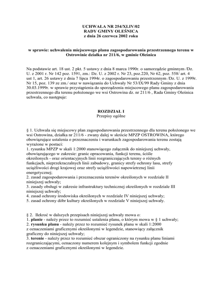 UCHWAŁA NR 254/XLIV/02 RADY GMINY OLEŚNICA z dnia 26 czerwca 2002 roku w sprawie: uchwalenia miejscowego planu zagospodarowania przestrzennego terenu w Ostrowinie działka nr 211/6, w gminie Oleśnica Na podstawie art. 18 ust. 2 pkt. 5 ustawy z dnia 8 marca 1990r. o samorządzie gminnym /Dz. U. z 2001 r. Nr 142 poz. 1591, zm.: Dz. U. z 2002 r. Nr 23, poz.220, Nr 62, poz. 558/ art. 4 ust 1, art. 26 ustawy z dnia 7 lipca 1994r. o zagospodarowaniu przestrzennym /Dz. U. z 1999r. Nr 15, poz. 139 ze zm./ oraz w nawiązaniu do Uchwały Nr 53/IX/99 Rady Gminy z dnia 30.03.1999r. w sprawie przystąpienia do sporządzenia miejscowego planu zagospodarowania przestrzennego dla terenu położonego we wsi Ostrowina dz. nr 211/6 , Rada Gminy Oleśnica uchwala, co następuje: ROZDZIAŁ I Przepisy ogólne § 1. Uchwala się miejscowy plan zagospodarowania przestrzennego dla terenu położonego we wsi Ostrowina, działka nr 211/6 - zwany dalej w skrócie MPZP OSTROWINA, którego obowiązujące ustalenia o przeznaczeniu i warunkach zagospodarowania terenu zostają wyrażone w postaci: 1. rysunku MPZP w skali 1:2000 stanowiącego załącznik do niniejszej uchwały, obowiązującego w zakresie: granic opracowania, funkcji terenu, ściśle określonych - oraz orientacyjnych linii rozgraniczających tereny o różnych funkcjach, nieprzekraczalnych linii zabudowy, granicy strefy ochrony lasu, strefy uciążliwości drogi krajowej oraz strefy uciążliwości napowietrznej linii energetycznej; 2. zasad zagospodarowania i przeznaczenia terenów określonych w rozdziale II niniejszej uchwały; 3. zasady obsługi w zakresie infrastruktury technicznej określonych w rozdziale III niniejszej uchwały; 4. zasad ochrony środowiska określonych w rozdziale IV niniejszej uchwały; 5. zasad ochrony dóbr kultury określonych w rozdziale V niniejszej uchwały. § 2. Ilekroć w dalszych przepisach niniejszej uchwały mowa o: 1. planie - należy przez to rozumieć ustalenia planu, o którym mowa w § 1 uchwały; 2. rysunku planu - należy przez to rozumieć rysunek planu w skali 1:2000 z oznaczeniami graficznymi określonymi w legendzie, stanowiący załącznik graficzny do niniejszej uchwały; 3. terenie - należy przez to rozumieć obszar ograniczony na rysunku planu liniami rozgraniczającymi, oznaczony numerem kolejnym i symbolem funkcji zgodnie z oznaczeniami graficznymi określonymi w legendzie. ROZDZIAŁ II ZASADY ZAGOSPODAROWANIA I PRZEZNACZENIE TERENÓW § 3. Ogólne zasady zagospodarowania terenów Obszar objęty planem podzielono na tereny o różnym sposobie zagospodarowania i ograniczono na rysunku planu liniami rozgraniczającymi oraz oznaczono symbolami i numerami. W terenach tych inwestowanie odbywa się według następujących zasad: 1. Inwestowanie na terenie objętym MPZP będzie poprzedzone: - kompleksowym wytyczeniem układu komunikacyjnego, - realizacją podstawowych sieci uzbrojenia, 2. Wskazane w planie funkcje terenu są obowiązujące, funkcje te można uzupełnić o dodatkowe pod warunkiem, że nie będą kolidowały z podstawową funkcją terenu; 3. Za zgodne z MPZP uważa się przekształcenie dowolnej funkcji w tereny zieleni i wód otwartych. 4. W terenach mieszkaniowych wyklucza się możliwość wprowadzenia funkcji mogących mieć negatywny wpływ na środowisko; 5. Do czasu realizacji pełnego programu mieszkaniowego proponuje się tereny zieleni nieurządzonej; 6. Oznaczone linie zabudowy stanowią jednocześnie granicę strefy wyłączonej z działalności budowlanej. § 4. Ustalenia szczegółowe dla terenów zainwestowania Przeznaczenie terenów oraz lokalne warunki, zasady i standardy kształtowania zabudowy oraz urządzania terenu 1 KS, 2 KS - TERENY URZĄDZEŃ OBSŁUGI KOMUNIKACJI Teren przeznaczony pod stację paliw wraz z obiektami obsługi podróżnych w tym parking dla tirów i samochodów osobowych 1. Dopuszcza się podział na mniejsze działki i realizację poszczególnych inwestycji osobno. 2. Inwestor zapewni własny system oczyszczania ścieków - oczyszczalnia ekologiczna, zbiornik szczelny wybieralny lub przesył do oczyszczalni wiejskiej. Rozwiązania indywidualne w uzgodnieniu z Powiatowym Inspektorem Sanitarnym 3. Możliwa korekta granic terenu i korekta przebiegu drogi wewnętrznej obsługującej teren (poza wjazdem) 4. Obiekty: stacji paliw, gastronomii, motelu, zajazdu, parkingu dla samochodów osobowych i ciężarowych, miejsc wypoczynku dla podróżnych, miejsc noclegowych dla kierowców samochodów ciężarowych. 5. Wskazana maksymalna ilość zieleni wysokiej, wprowadzenia oczka wodnego 6. Istniejący rów pozostawić otwarty, dopuszcza się zarurowanie za zgodą właściciela 7. Nieprzekraczalna linia zabudowy dla obiektów budowlanych 25 m. od krawędzi jezdni 8. Nieprzekraczalna linia zabudowy dla budynków przeznaczonych na stały pobyt ludzi 50 m. od krawędzi jezdni 3 US/Z/MN , 4 US/Z/MN - USŁUGI SPORTU I REKREACJI W ZIELENI WYSOKIEJ Z DOPUSZCZENIEM FUNKCJI MIESZKANIOWEJ Tereny przeznaczone pod usługami sportu i rekreacji wraz z zielenią wysoką możliwość mieszkania dla właścicieli lub obsługi 1. Lokalizacja usług : urządzenia sportów hippicznych, strzelnice, boiska, pływalnie, minigolf, krykiet, pole gokartowe itp. 2. Zaleca się zadrzewienia większej części działki - min 60% 3. Wyklucza się zainwestowanie usługowe pozbawione zaplecza postojowego dla niezbędnej ilości pojazdów własnych inwestora i klientów; 4. Nie dopuszcza się lokalizacji jakichkolwiek usług mogących pogorszyć stan środowiska; 5. Dopuszcza się funkcję mieszkaniową jako funkcję towarzyszącą; 6. Budynki nie wyższe niż 1,5 kondygnacje (parter i poddasze użytkowe); 7. Dopuszcza się w uzasadnionych wypadkach podział na mniejsze posesje o powierzchni nie mniejszej niż 3000 m2 8. Dopuszcza się rezygnację z ciągu pieszego KP lub korektę jego przebiegu w razie zagospodarowania terenów 3US/Z/MN i 4US/Z/MN przez jednego inwestora 9. Możliwa korekta g