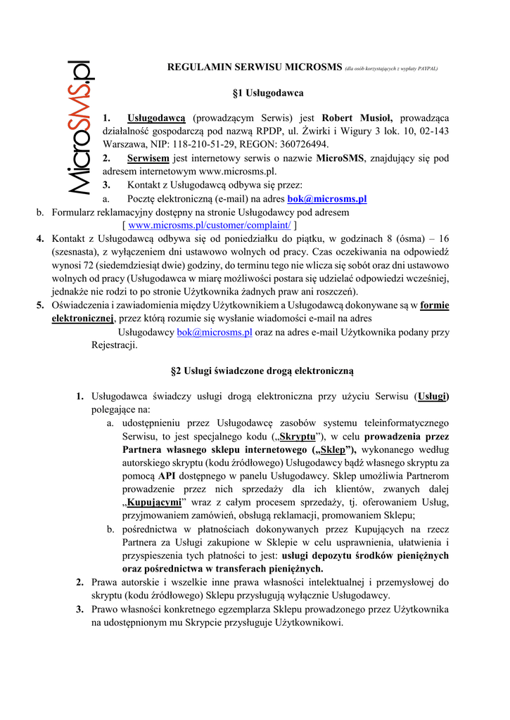 REGULAMIN SERWISU MICROSMS (dla osób korzystających z wypłaty PAYPAL) §1 Usługodawca 1. Usługodawcą (prowadzącym Serwis) jest Robert Musioł, prowadząca działalność gospodarczą pod nazwą RPDP, ul. Żwirki i Wigury 3 lok. 10, 02-143 Warszawa, NIP: 118-210-51-29, REGON: 360726494. 2. Serwisem jest internetowy serwis o nazwie MicroSMS, znajdujący się pod adresem internetowym www.microsms.pl. 3. Kontakt z Usługodawcą odbywa się przez: a. Pocztę elektroniczną (e-mail) na adres [email protected] b. Formularz reklamacyjny dostępny na stronie Usługodawcy pod adresem [ www.microsms.pl/customer/complaint/ ] 4. Kontakt z Usługodawcą odbywa się od poniedziałku do piątku, w godzinach 8 (ósma) – 16 (szesnasta), z wyłączeniem dni ustawowo wolnych od pracy. Czas oczekiwania na odpowiedź wynosi 72 (siedemdziesiąt dwie) godziny, do terminu tego nie wlicza się sobót oraz dni ustawowo wolnych od pracy (Usługodawca w miarę możliwości postara się udzielać odpowiedzi wcześniej, jednakże nie rodzi to po stronie Użytkownika żadnych praw ani roszczeń). 5. Oświadczenia i zawiadomienia między Użytkownikiem a Usługodawcą dokonywane są w formie elektronicznej, przez którą rozumie się wysłanie wiadomości e-mail na adres Usługodawcy [email protected] oraz na adres e-mail Użytkownika podany przy Rejestracji. §2 Usługi świadczone drogą elektroniczną 1. Usługodawca świadczy usługi drogą elektroniczna przy użyciu Serwisu (Usługi) polegające na: a. udostępnieniu przez Usługodawcę zasobów systemu teleinformatycznego Serwisu, to jest specjalnego kodu („Skryptu”), w celu prowadzenia przez Partnera własnego sklepu internetowego („Sklep”), wykonanego według autorskiego skryptu (kodu źródłowego) Usługodawcy bądź własnego skryptu za pomocą API dostępnego w panelu Usługodawcy. Sklep umożliwia Partnerom prowadzenie przez nich sprzedaży dla ich klientów, zwanych dalej „Kupującymi” wraz z całym procesem sprzedaży, tj. oferowaniem Usług, przyjmowaniem zamówień, obsługą reklamacji, promowaniem Sklepu; b. pośrednictwa w płatnościach dokonywanych przez Kupujących na rzecz Partnera za Usługi zakupione w Sklepie w celu usprawnienia, ułatwienia i przyspieszenia tych płatności to jest: usługi depozytu środków pieniężnych oraz pośrednictwa w transferach pieniężnych. 2. Prawa autorskie i wszelkie inne prawa własności intelektualnej i przemysłowej do skryptu (kodu źródłowego) Sklepu przysługują wyłącznie Usługodawcy. 3. Prawo własności konkretnego egzemplarza Sklepu prowadzonego przez Użytkownika na udostępnionym mu Skrypcie przysługuje Użytkownikowi. 4. W ramach Umowy Usługodawca upoważnia Partnera do niewyłącznego korzystania ze skryptu (kodu źródłowego) przez okres obowiązywania Umowy z Partnerem, bez ograniczeń terytorialnych, na polu eksploatacji: prowadzenie Sklepu (licencja niewyłączna). 5. Usługodawca może także udostępnić zasoby systemu teleinformatycznego Serwisu w celu zamieszczania i przechowywania przez inne podmioty treści o charakterze reklamowym (które nie muszą być związane z Usługami). Wszelkie wpływy z tytułu zamieszczania i przechowywania w Serwisie treści reklamowych przysługują wyłącznie Usługodawcy. Szczegółowe warunki zamieszczenia i przechowywania treści o charakterze reklamowym jak i zasady odpłatności ustala każdorazowo Usługodawca z podmiotem zainteresowanym zamieszczeniem i przechowywaniem takich treści. 6. Korzystanie z Serwisu odbywa się na podstawie umowy o świadczenie usług drogą elektroniczną zawartej pomiędzy Partnerem a Usługodawcą („Umowa”). Do zawarcia umowy o świadczenie usług drogą elektroniczną wymagana jest a. Rejestracja oraz b. Zamówienie Konta SMS Premium §3 Partner 1. Osoba korzystająca z Usług jest Partnerem (Usługobiorcą). 2. Usługodawca nie uczestniczy w żaden sposób w kontaktach i transakcjach między Partnerem a Kupujacymi, udostępnia jedynie zasoby systemu teleinformatycznego Serwisu w celach, o których mowa w §2 ust. 1. Usługodawca udostępnia jedynie Użytkownikom narzędzie (platformę) prowadzenia Sklepu w celu dokonywania sprzedaży oraz zapewnia pośrednictwo w płatnościach. 3. Użytkownik jest zobowiązany przed rozpoczęciem korzystania z Usług do zapoznania się z Regulaminem i jego akceptacji. Treść Regulaminu jest udostępniona nieodpłatnie wszystkim Użytkownikom na stronie internetowej Usługodawcy pod adresem [ www.microsms.pl/partner/documents/ ] w taki sposób, aby Użytkownik mógł przed rozpoczęciem korzystania z Usług pozyskać, odtworzyć, utrwalić oraz przechowywać (w tym w zwykłym toku czynności) treść Regulaminu, za pomocą systemu teleinformatycznego, którym się posługuje. W przypadku wątpliwości co do interpretacji przepisów Regulaminu Partner powinien zwrócić się o wyjaśnienie do Usługodawcy. 4. Partnerem może być osoba fizyczna mająca pełną zdolność do czynności prawnych, osoba prawna lub jednostka organizacyjna nieposiadająca osobowości prawnej, ale mogąca we własnym imieniu nabywać prawa i zaciągać zobowiązania. 5. Zakazane jest dostarczanie przez Użytkownika jakichkolwiek danych („Treści”) o charakterze bezprawnym, w szczególności zamieszczanie w Sklepie Usług, przedmiotów bądź wirtualnych przedmiotów naruszających cudze prawa. 6. Partner może wyrazić zgodę na otrzymywanie od Usługodawcy, w rozumieniu art. 10 ust. 2 ustawy z 18 lipca 2002 r. o świadczeniu usług drogą elektroniczną (Dz. U. Nr 144, poz. 1204), informacji handlowej (w szczególności elektronicznego Biuletynu (Newslettera), informacji o promocjach, towarach lub usługach oferowanych przez Usługodawcę lub podmioty z nim współpracujące, innych portalach/serwisach internetowych prowadzonych przez Usługodawcę lub podmioty z nim współpracujące), na podany przez Partnera (przy ewentualnej rejestracji) adres e-mail lub na Konto
