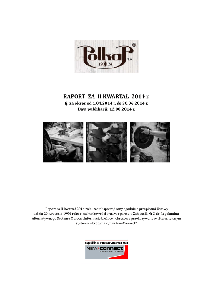 RAPORT ZA II KWARTAŁ 2014 r. tj. za okres od 1.04.2014 r. do 30.06.2014 r. Data publikacji: 12.08.2014 r. Raport za II kwartał 2014 roku został sporządzony zgodnie z przepisami Ustawy z dnia 29 września 1994 roku o rachunkowości oraz w oparciu o Załącznik Nr 3 do Regulaminu Alternatywnego Systemu Obrotu „Informacje bieżące i okresowe przekazywane w alternatywnym systemie obrotu na rynku NewConnect" Raport okresowy za II kwartał 2014 r. Spis treści I. II. III. IV. V. PODSTAWOWE INFORMACJE O EMITENCIE, W TYM OPIS AKCJONARIATU OŚWIADCZENIE ZARZĄDU INFORMACJE O ZASADACH PRZYJĘTYCH PRZY SPORZĄDZANIU RAPORTU SKRÓCONE SPRAWOZDANIE FINANSOWE CHARAKTERYSTYKA DOKONAŃ I NIEPOWODZEŃ WRAZ Z OPISEM CZYNNIKÓW I ZDARZEŃ MAJĄCYCH WPŁYW NA OSIĄGNIĘTE WYNIKI VI. PROGNOZY FINANSOWE – STANOWISKO VII. OPIS ORGANIZACJI GRUPY KAPITAŁOWEJ I KONSOLIDACJA –ODNIESIENIE VIII. INFORMACJE NA TEMAT AKTYWNOŚCI W OBSZARZE ROZWIĄZAŃ INNOWACYJNYCH WPROWADZANYCH W PRZEDSIĘBIORSTWIE IX. INFORMACJA DOTYCZĄCA LICZBY OSÓB ZATRUDNIONYCH PRZEZ EMITENTA, W PRZELICZENIU NA PEŁNE ETATY X. OPIS STANU REALIZACJI DZIAŁAŃ I INWESTYCJI EMITENTA ORAZ HARMONOGRAMU ICH REALIZACJI –ODNIESIENIE. Raport okresowy za II kwartał 2014 r. 1. Podstawowe informacje o Emitencie, zawierające m.in. informację o strukturze akcjonariatu Emitenta, ze wskazaniem akcjonariuszy posiadających, na dzień przekazania raportu, co najmniej 5% głosów na walnym zgromadzeniu. Adres: ul. Powstańców Śląskich 1, 43-430 Skoczów. NIP: 548-26-33-372 REGON: 2417195000 KRS: 0000372055 Sąd rejestrowy: Sąd Rejonowy w Bielsku-Białej, VIII Wydział Gospodarczy KRS Kapitał podstawowy: 2.275.000,00 zł. Skoczowska Fabryka Kapeluszy Polkap Spółka Akcyjna zajmuje się produkcją i dystrybucją kapeluszy i półproduktów z wełny oraz włosa króliczego. Emitent swoją działalność koncentruje na rozwijaniu procesu produkcyjnego, jak również na pozyskaniu nowych klientów oraz rynków zbytu. Cały proces, począwszy od fazy projektowej, poprzez przygotowanie technologiczne, produkcję, aż do przygotowania towaru do wysyłki odbywa się w zakładzie w Skoczowie. Dzięki temu każdy produkt spełnia konkretne wymagania klienta, gwarantując satysfakcję z towaru najwyższej jakości. 1.1. Zarząd: W skład Zarządu Skoczowskiej Fabryki Kapeluszy Polkap S.A. w II kwartale 2014 roku wchodzili: Paweł Kaliciak Tomasz Bednarski 1.2. – Prezes Zarządu, – Członek Zarządu. Rada Nadzorcza: W skład Rady Nadzorczej Skoczowskiej Fabryki Kapeluszy Polkap S.A. w II kwartale 2014 roku wchodzili: Sławomir Jarosz Michał Simek Adam Kościsz Bogdan Pukowiec Marcin Gąsiorek 1.3. – Przewodniczący Rady Nadzorczej – Członek Rady Nadzorczej, - Członek Rady Nadzorczej, - Członek Rady Nadzorczej, - Członek Rady Nadzorczej. Akcjonariat Na dzień przekazania niniejszego raportu kapitał zakładowy emitenta wynosi 2.275.000 zł i dzieli się na 4.550.000 akcji zwykłych na okaziciela o wartości nominalnej 0,50 zł, w tym: a. 1.000.000 akcji serii A, b. 350.000 akcji serii B, c. 3.200.000 akcji serii C. Raport okresowy za II kwartał 2014 r. Według najlepszej wiedzy Emitenta, z uwzględnieniem m.in. zawiadomień akcjonariuszy i stanu akcjonariatu na ostatnim Walnym Zgromadzeniu Akcjonariuszy Spółki, stan akcjonariatu powyżej 5% na dzień przekazania raportu jest następujący: AKCJONARIUSZ ILOŚĆ AKCJI ILOŚĆ GŁOSÓW UDZIAŁ W GŁOSACH 250.000 UDZIAŁ W KAPITALE ZAKŁADO WYM 5,49 % 250.000 5,49 % Udział % w kapitale i głosach (po wyłączeniu akcji własnych) 5,50% Maria Herzyk Ewa Kaliciak 251.610 5,53% 251.610 5,53% 5,53 % Maria Herzyk Nataliya Bednarska Wacław Mówiński Polkap Sp. z o.o. 250.000 250.000 250.000 3.200.000 5,49% 5,49% 5,49% 70,33 % 250.000 250.000 250.000 3.200.000 5,49% 5,49% 5,49% 70,33 % 5,50% 5,50 % 5,50% 70,41% Tabela 1: Struktura akcjonariatu na dzień przekazania raportu. Źródło: Spółka Na podstawie uchwały nr 9 Nadzwyczajnego Walnego Zgromadzenia Akcjonariuszy Emitenta z dn. 22 stycznia 2013 r. w sprawie upoważnienia Zarządu Spółki do nabycia akcji własnych Emitenta, w II kwartale dokonano zakupu akcji własnych. Szczegółowe informacje o transakcjach znajdują się w stosownych raportach bieżących. Na dzień przekazania niniejszego raportu, Emitent posiada 5666 akcji własnych, stanowiących 0,12 % w kapitale zakładowym i ogólnej liczbie głosów na Walnym Zgromadzeniu Akcjonariuszy Spółki. 2. Oświadczenie Zarządu. Zarząd Spółki Skoczowska Fabryka Kapeluszy Polkap S.A. przedstawia raport za II kwartał, na który składają się m.in.: • poszczególne dane finansowe • komentarz Zarządu na temat czynników i zdarzeń, które miały wpływ na osiągnięte wyniki finansowe, • informacja Zarządu na temat aktywności w obszarze rozwoju prowadzonej działalności w okresie objętym raportem. Ponadto Zarząd Spółki Skoczowska Fabryka Kapeluszy Polkap S.A. z siedzibą w Skoczowie oświadcza, że wedle swojej najlepszej wiedzy informacje prezentowane w niniejszym raporcie okresowym zostały sporządzone zgodnie z obowiązującymi zasadami rachunkowości i odzwierciedlają w sposób rzetelny, prawdziwy i jasny sytuację majątkową, finansową i ekonomiczną Spółki oraz jej wyniki finansowe. Jednocześnie Zarząd oświadcza, że sprawozdanie z działalności Skoczowskiej Fabryki Kapeluszy Polkap S.A. zawiera prawdziwy obraz rozwoju, osiągnięć oraz sytuacji w Spółce. Paweł Kaliciak – Prezes Zarządu Tomasz Bednarski – Członek Zarządu Raport okresowy za II kwartał 2014 r. 3. Zasady sporządzania sprawozdania finansowego. W Spółce Skoczowska Fabryka Kapeluszy Polkap S.A. księgi rachunkowe prowadzone są zgodnie z przepisami Ustawy o rachunkowości z dnia 29 września 1994r. z późniejszymi zmianami (Dz.U. Nr 76 z 2002r., poz. 694) w sposób zapewniający wyodrębnienie wszystkich informacji istotnych dla oceny sytuacji majątkowej i finansowej, wyniku fi
