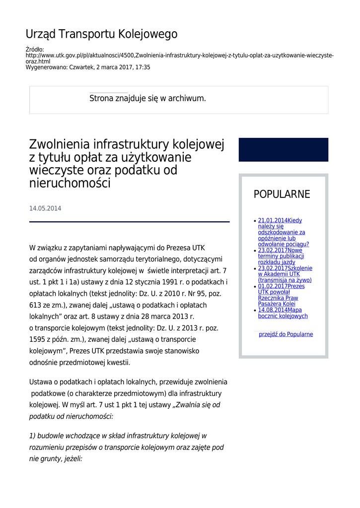 Urząd Transportu Kolejowego Źródło: http://www.utk.gov.pl/pl/aktualnosci/4500,Zwolnienia-infrastruktury-kolejowej-z-tytulu-oplat-za-uzytkowanie-wieczysteoraz.html Wygenerowano: Czwartek, 2 marca 2017, 17:35 Strona znajduje się w archiwum. Zwolnienia infrastruktury kolejowej z tytułu opłat za użytkowanie wieczyste oraz podatku od nieruchomości POPULARNE 14.05.2014 ● W związku z zapytaniami napływającymi do Prezesa UTK ● od organów jednostek samorządu terytorialnego, dotyczącymi zarządców infrastruktury kolejowej w świetle interpretacji art. 7 ust. 1 pkt 1 i 1a) ustawy z dnia 12 stycznia 1991 r. o podatkach i ● ● opłatach lokalnych (tekst jednolity: Dz. U. z 2010 r. Nr 95, poz. 613 ze zm.), zwanej dalej „ustawą o podatkach i opłatach lokalnych” oraz art. 8 ustawy z dnia 28 marca 2013 r. o transporcie kolejowym (tekst jednolity: Dz. U. z 2013 r. poz. 1595 z późn. zm.), zwanej dalej „ustawą o transporcie kolejowym”, Prezes UTK przedstawia swoje stanowisko odnośnie przedmiotowej kwestii. Ustawa o podatkach i opłatach lokalnych, przewiduje zwolnienia podatkowe (o charakterze przedmiotowym) dla infrastruktury kolejowej. W myśl art. 7 ust 1 pkt 1 tej ustawy „Zwalnia się od podatku od nieruchomości: 1) budowle wchodzące w skład infrastruktury kolejowej w rozumieniu przepisów o transporcie kolejowym oraz zajęte pod nie grunty, jeżeli: ● 21.01.2014Kiedy należy się odszkodowanie za opóźnienie lub odwołanie pociągu? 23.02.2017Nowe terminy publikacji rozkładu jazdy 23.02.2017Szkolenie w Akademii UTK (transmisja na żywo) 01.02.2017Prezes UTK powołał Rzecznika Praw Pasażera Kolei 14.08.2014Mapa bocznic kolejowych przejdź do Popularne a) zarządca infrastruktury jest obowiązany do jej udostępniania licencjonowanym przewoźnikom kolejowym lub b) są przeznaczone wyłącznie do przewozu osób, wykonywanego przez przewoźnika kolejowego który równocześnie zrządza tą infrastrukturą bez udostępniania jej innym przewoźnikom, lub c) tworzą linie kolejowe o szerokości torów większej niż 1 435 mm; Tak więc podatnicy tego podatku, tj. osoby fizyczne i prawne oraz jednostki organizacyjne będące właścicielem, posiadaczem samoistnym nieruchomości lub obiektów budowlanych, użytkownikiem wieczystym gruntów lub posiadaczem gruntów, budynków lub budowli, wchodzących w skład infrastruktury kolejowej w rozumieniu art. 4 pkt 1 ustawy o transporcie kolejowym, nie płacą podatku od nieruchomości od tej infrastruktury oraz zajętych pod nią gruntów w przypadku zaistnienia jednej z wyżej wymienionych przesłanek. Pierwsza przesłanka, o której mowa w art. 7 ust. 1 pkt 1 lit. a) ustawy o podatkach i opłatach lokalnych, zostaje spełniona, w sytuacji gdy zarządca danej infrastruktury kolejowej faktycznie zarządza budowlami wchodzącymi w skład infrastruktury kolejowej oraz zajętymi pod nie gruntami, a wobec tego ciąży na nim obowiązek ich udostępniania licencjonowanym przewoźnikom kolejowym. Przy czym przepisy ustawy o podatkach i opłatach lokalnych, jak i przepisy z zakresu kolejnictwa nie wskazują, że zarządca infrastruktury ma być jej właścicielem lub ma nią władać na podstawie innego tytułu prawnego. Nie ma zatem znaczenia, czy właścicielem infrastruktury, tj. budowli oraz zajętych pod nie gruntów, jest przewoźnik, zarządca, czy jakikolwiek inny podmiot. Istotą zwolnienia podatkowego w zakresie pierwszej przesłanki jest bowiem ustawowy obowiązek udostępniania infrastruktury kolejowej przez zarządcę. Może się więc zdarzyć, że zarządca infrastruktury będzie jej właścicielem, przy czym nie jest to wymóg konieczny. Zarządca infrastruktury może być także dzierżawcą bądź najemcą elementów infrastruktury kolejowej. Zgodnie z art. 4 pkt 7 ustawy o transporcie kolejowym, zarządcą infrastruktury, jest podmiot wykonujący działalność polegającą na zarządzaniu infrastrukturą kolejową, na zasadach określonych w ustawie; funkcje zarządcy infrastruktury kolejowej lub jej części mogą wykonywać różne podmioty. Infrastrukturą kolejową są natomiast, zgodnie z art. 4 pkt 1 ustawy o transporcie kolejowym, „linie kolejowe oraz inne budowle, budynki i urządzenia wraz z zajętymi pod nie gruntami, usytuowane na obszarze kolejowym, przeznaczone do zarządzania, obsługi przewozu osób i rzeczy, a także utrzymania niezbędnego w tym celu majątku zarządcy infrastruktury”. Linia kolejowa została natomiast zdefiniowana w art. 4 pkt 2 ww. ustawy jako „droga kolejowa mająca początek i koniec wraz z przyległym pasem gruntu, na którą składają się odcinki linii, a także budynki, budowle i urządzenia przeznaczone do prowadzenia ruchu kolejowego wraz z zajętymi pod nie gruntami”. Na infrastrukturę kolejową składają się zatem linie kolejowe (wraz z budynkami, budowlami i urządzeniami przeznaczonymi do prowadzenia ruchu kolejowego wraz z zajętymi pod nie gruntami) oraz inne budynki, budowle i urządzenia wraz z zajętymi pod nie gruntami usytuowane na obszarze kolejowym, przeznaczone do zarządzania, obsługi przewozu osób i rzeczy, a także utrzymania niezbędnego w tym celu majątku zarządcy infrastruktury. Zatem same „budowle, budynki i urządzenia wraz z zajętymi pod nie gruntami” - przy założeniu, że są „usytuowane na obszarze kolejowym oraz przeznaczone do zarządzania, obsługi przewozu osób i rzeczy, a także utrzymania niezbędnego w tym celu majątku zarządcy infrastruktury” - mogą stanowić część infrastruktury kolejowej. Do budowli takich należy zakwalifikować również kolejową infrastrukturę tzw. usługową, zapewniającą dostęp do urządzeń związanych z obsługą pociągów, określoną w części I ust 2 załącznika do ustawy o transporcie kolejowym, tj.: ● urządzeń zaopatrzenia w paliwo; ● stacji pasażerskich, ich budynków i innych urządzeń; ● terminali kolejowych; ● stacji rozrządowych; ● torów i 