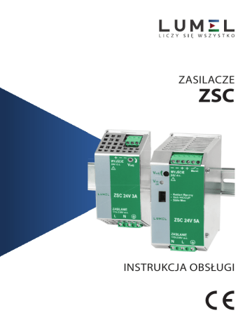 ZASILACZE ZSC INSTRUKCJA OBSŁUGI 1 2 Spis treści 1. Zastosowanie......................................................................5 2. Zestaw zasilacza.................................................................5 3. Wymagania podstawowe, bezpieczeñstwo u¯ytkowania...........5 4. widok p£yty czo³owej...........................................................6 5. Funkcje wyjścia Power Good.................................................8 6. Ochrona..............................................................................9 7. Tryby ochrony przed zwarciem oraz przeciążeniem................9 8.dane techniczne................................................................. 13 9.kody wykonañ.................................................................... 19 10. konserwacja................................................................... 19 3 4 1. ZASTOSOWANIE Zasilacze serii ZSC są przystosowane do pracy w systemach automatyki przemysłowej w rozdzielniach na szynach DIN. Dostępne są w wersji napięciowej 24 V i mocach 70 W oraz 120 W. 2. ZESTAW ZASILACZA W skład zestawu wchodzą: -- zasilacz -- instrukcja obsługi -- karta gwarancyjna 1 szt. 1 szt. 1 szt. 3. Wymagania podstawowe, bezpieczeństwo użytkowania Ze względu na bezpieczeństwo personelu powinno się przestrzegać następujących zasad: • Urządzenia mogą być instalowane, obsługiwane oraz konserwowane wyłącznie przez odpowiednio wykwalifikowany personel, posiadający niezbędną wiedzę o sprzęcie. • Zasilacz typu ZSC powinien być podłączony do sieci elektroenergetycznej zgodnie z aktualnie obowiązującymi przepisami i normami dotyczącymi instalacji elektrycznych, w szczególności dotyczących ochrony przeciwporażeniowej. • Podczas uruchamiania i obsługi sterownika, należy stosować się do zaleceń zawartych w niniejszej instrukcji obsługi. 5 4. WIDOK PŁYTY CZOŁOWEJ Rys. 1. Widok płyty czołowej zasilacza ZSC. 6 przełącznik zasilania 230 V a.c. 115 V a.c. Rys. 2. Widok przełącznika zasilania. 7 5. Funkcje wyjścia Power Good (dotyczy tylko zasilaczy ZSC 24 V/ 5 A) Wyjście wykorzystuje się w celu prewencyjnego monitorowania funkcji zasilania. Dostępny jest elektrycznie izolowany styk sygnalizacyjny. Styk sygnalizacyjny zamyka się, gdy moc wyjściowa jest prawidłowa i rozwiera się, gdy napięcie wyjściowe spada poniżej 20 V d.c. ±5%. Ta właściwość jest szczególnie użyteczna w aplikacjach redundantnych. Obciążenie styku Power Good: Maks.: DC1: 30 V d.c. 1 A; AC1: 60 V a.c. 1A Obciążenie czynne (EN 60947-4-1) Min.: 1 mA at 5 V d.c. Minimalne obciążenie dopuszczalne 8 6. Ochrona Po stronie pierwotnej: urządzenie jest wyposażone w wewnętrzny bezpiecznik; Jeżeli bezpiecznik wewnętrzny jest przepalony to najprawdopodobniej urządzenie uległo uszkodzeniu. W przypadku wystąpienia tego typu uszkodzenia, urządzenie należy poddać przeglądowi w fabryce. Po stronie wtórnej: zabezpieczone jest przed: przeciążeniem, przepięciem (typ. 35 V d.c.), oraz zwarciem. 7. Tryby ochrony przed zwarciem oraz przeciążeniem Zasilacz ZSC 24V/5A, zależnie od obciążeń aplikacji, oferuje użytkownikowi trzy tryby ochrony, które są dostępne poprzez zdjęcie plastikowego okienka i przełączenie zworki na żądane ustawienie wskazane na poniższym rysunku. 9 1) TRYB HICCUP (praca przerywana) (domyślne ustawienie fabryczne zworki) Tryb ogólnego zastosowania, stosowany dla normal1 2 nego obciążenia. W przypadku zwarcia lub przeciąże3 nia, następuje przerwa w dostawie energii. Urządzenie automatycznie próbuje przywrócić napięcie wyjściowe w cyklach co 2 sekundy, aż do rozwiązania przyczyny problemu przez obsługę techniczną. 10 2) TRYB RESTARTU RĘCZNEGO (ponowne uruchomienie ręczne przez Operatora) (domyślne ustawienie fabryczne zworki) 1 2 3 Ten tryb zabezpieczenia jest sugerowany szczególnie w zastosowaniach, w przypadku których procedury bezpieczeństwa wymagają przeprowadzenia ponownego uruchomienia wyłącznie przez upoważnioną osobę. W przypadku zwarcia lub przeciążenia zasilacz przerywa dostarczanie energii. W celu ponownego uruchomienia zasilacza, niezbędne jest wyłączenie napięcie wejściowe na mniej więcej 1 minutę. 3) TRYB STAŁEJ MOCY (domyślne ustawienie fabryczne zworki) 1 2 W przypadku zwarcia lub przeciążenia, prąd wyjściowy 3 11 utrzymuje wysoką wartość kosztem spadku napięcia. W przypadku zwarcia, prąd ten może osiągnąć trzykrotną wartość prądu znamionowego przy temperaturze 60°C. Ten tryb zabezpieczenia stosuje się w celu spełnienia wymagań związanych z obciążeniami dla silników, zaworów elektromagnetycznych, lamp, programowalnych sterowników logicznych z obwodami wejściowymi o dużej pojemności oraz innymi obciążeniami z wyraźnym przeciążeniem chwilowym. Wyjście urządzenia jest elektrycznie zabezpieczone przed przeciążeniem i zwarciem. Dla znamionowego napięcia i prądu w nominalnej temperaturze (patrz dane techniczne), urządzenie dostarcza prąd bez wyłączania.Wraz ze wzrostem przeciążenia, napięcie wyjściowe obniżane jest aż do zera. 12 8. dane TECHNICZNE 24 V 3 A 24 V 5 A Napięcie wejściowe 115 – 230 V AC 115 – 230 V AC (przełączny zakres) Prąd rozruchowy ≤ 7 A ≤ 5 ms ≤ 11 A ≤ 5 ms Dane wejściowe Częstotliwość zasilania Prąd wejściowy 47-63 Hz ±6 % 1- 0,7 A (115-230 V) Wewnętrzny bezpiecznik Zewnętrzny bezpiecznik 1,8 A – 0,9 A T4A 6 A (MCB) 10 A (MCB) Dane wyjściowe Napięcie wyjściowe 24 V DC Regulacja napięcia 22-27 V DC Prąd ciągły przy 24 V < 40oC 2 A (115 V) 3 A (230 V) 5A Prąd ciągły przy 24 V < 50oC 1,5 A (115 V) 2,5 A (230 V) 4,5 A Prąd ciągły przy 24 V < 60oC - 4A 13 Przeciążalność przy 24 V do 50oC 3,5 A poniżej 3 min. - Przeciążalność przy 24 V do 60oC - 6 A poniżej 3 min. Maksymalny prąd zwarcia 7A 12 A (Max. 2s: Tryb Hiccup Stałe: Tryb ciągły) Max. 1,5 s Max. 1 s Opóźnienie załączenia Czas