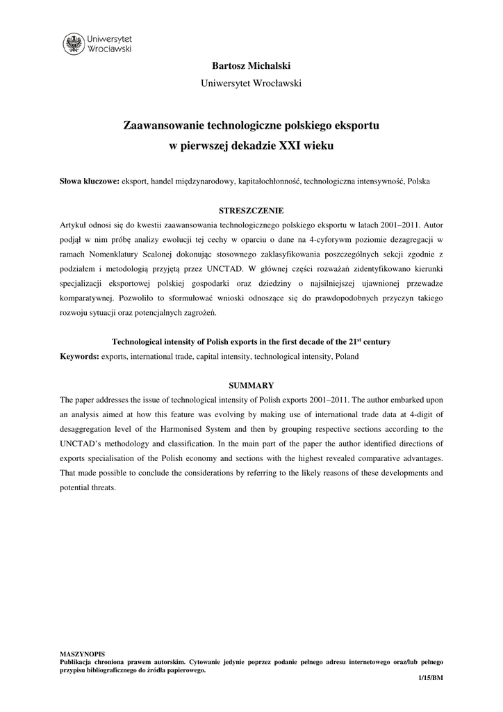 Bartosz Michalski Uniwersytet Wrocławski Zaawansowanie technologiczne polskiego eksportu w pierwszej dekadzie XXI wieku Słowa kluczowe: eksport, handel międzynarodowy, kapitałochłonność, technologiczna intensywność, Polska STRESZCZENIE Artykuł odnosi się do kwestii zaawansowania technologicznego polskiego eksportu w latach 2001–2011. Autor podjął w nim próbę analizy ewolucji tej cechy w oparciu o dane na 4-cyforywm poziomie dezagregacji w ramach Nomenklatury Scalonej dokonując stosownego zaklasyfikowania poszczególnych sekcji zgodnie z podziałem i metodologią przyjętą przez UNCTAD. W głównej części rozważań zidentyfikowano kierunki specjalizacji eksportowej polskiej gospodarki oraz dziedziny o najsilniejszej ujawnionej przewadze komparatywnej. Pozwoliło to sformułować wnioski odnoszące się do prawdopodobnych przyczyn takiego rozwoju sytuacji oraz potencjalnych zagrożeń. Technological intensity of Polish exports in the first decade of the 21st century Keywords: exports, international trade, capital intensity, technological intensity, Poland SUMMARY The paper addresses the issue of technological intensity of Polish exports 2001–2011. The author embarked upon an analysis aimed at how this feature was evolving by making use of international trade data at 4-digit of desaggregation level of the Harmonised System and then by grouping respective sections according to the UNCTAD’s methodology and classification. In the main part of the paper the author identified directions of exports specialisation of the Polish economy and sections with the highest revealed comparative advantages. That made possible to conclude the considerations by referring to the likely reasons of these developments and potential threats. MASZYNOPIS Publikacja chroniona prawem autorskim. Cytowanie jedynie poprzez podanie pełnego adresu internetowego oraz/lub pełnego przypisu bibliograficznego do źródła papierowego. 1/15/BM Wprowadzenie Pierwsza dekada XXI wieku przyniosła polskiej gospodarce szereg wyzwań mających charakter zarówno szans, jak i zagrożeń wzmacniających oraz osłabiających jej potencjał rozwojowy, a w szerszym wymiarze także konkurencyjny. Z jednej strony wynikają one z podjętej jeszcze w latach 90. XX wieku strategicznych decyzji ukierunkowanych na uzyskanie członkostwa w Unii Europejskiej (UE, ówczesnej Europejskiej Wspólnocie Gospodarczej), z drugiej zaś odczuwalnych konsekwencji ogólnoświatowego kryzysu finansowo-gospodarczego, który ujawnił potężną skalę zaniedbań, zwłaszcza w sektorze finansów publicznych jako konsekwencji od dawna postulowanych, ale zaniechanych reform. W rezultacie polska gospodarka w latach 2001–2011 rozwijała się nierównomiernie (zob. tab. 1). Tabela 1. Dynamika realna produktu krajowego brutto w latach 2001–2011 2001 2002 2003 2004 2005 2006 2007 2008 2009 201 2011 rok poprzedni =100 spożycie akumulacja brutto popyt krajowy PKB 102,3 103,0 102,7 104,3 102,7 105,7 104,6 106,1 102,0 103,5 102,1 86,6 92,8 103,3 114,7 101,4 116,1 124,3 104,0 88,5 109,3 110,3 98,7 101,0 102,8 106,2 102,5 107,3 108,7 105,6 98,9 104,6 103,8 101,2 101,4 103,9 105,3 103,6 106,2 106,7 105,1 101,8 103,9 104,0 źródło: Główny Urząd Statystyczny, Informacja o sytuacji społeczno-gospodarczej kraju. Rok 2011, Warszawa, 26 stycznia 2012, s. 6. Jedną z istotniejszych cech strukturalnych charakterystycznych dla analizowanego okresu jest ponadto wyraźnie rosnące otwarcie polskiej gospodarki na wymianę handlową z zagranicą, o czym świadczy ewolucja wskaźnika otwartości (zob. rys. 1)1. Taki stan rzeczy pozwala z kolei przypuszczać, że w strukturze polskiej wymiany także zaszły głębokie przekształcenia. Z tego powodu rozważania zostały poświęcone kwestii zaawansowania technologicznego polskiej oferty eksportowej, zidentyfikowaniu prawdopodobnych przyczyn tych zmian oraz wskazaniu obszarów, w których zmiany okazały się być najistotniejsze. 1 Suma wartości eksportu i importu podzielona przez wartość PKB w danym roku. MASZYNOPIS Publikacja chroniona prawem autorskim. Cytowanie jedynie poprzez podanie pełnego adresu internetowego oraz/lub pełnego przypisu bibliograficznego do źródła papierowego. 2/15/BM Rysunek 1. Wartość polskiego eksportu i importu oraz wskaźnik otwartości w latach 2001–2011 700,00 90,00% 500,00 60,00% otwartość [%] wartość EXP/IMP [mld PLN] 600,00 400,00 300,00 30,00% 200,00 100,00 0,00 0,00% 2001 2002 2003 2004 2005 2006 2007 2008 2009 2010 2011 eksport import otw artość źródło: opracowanie własne na podstawie danych Głównego Urzędu Statystycznego, http://www.stat.gov.pl/ gus/wskazniki_makroekon_PLK_HTML.htm (dostęp: 14.02.2013). Czynnikochłonność eksportu a zagadnienie międzynarodowej konkurencyjności gospodarki. Uwagi metodologiczne Analiza zmian technologicznego zaawansowania polskiego eksportu związana jest – jak już wspomniano wyżej – z szerszym kontekstem nie tylko wzrostu/rozwoju gospodarczego, lecz także międzynarodowej konkurencyjności polskiej gospodarki. Mimo istniejących wątpliwości, natury zarówno akademickiej (teoretycznej), jak i praktycznej, cecha ta jest definiowana jako zdolność konkurencyjna (konkurencyjność czynnikowa) oraz pozycja konkurencyjna (konkurencyjność wynikowa) 2 . Wobec tego można przyjąć, że na konkurencyjność składają się określone zdolności: • zdolność przyciągania mobilnych czynników produkcji (ang. ability to attract) stymulujących wzrost i rozwój gospodarczy, • zdolność sprzedawania (ang. ability to sell) jako potwierdzenie wysokiej jakości krajowej oferty, 2 Oprócz tego rozróżnienia można wprowadzić cały szereg kategorii pochodnych. Zob. szerzej Kompendium wiedzy o konkurencyjności, M. Gorynia (red.), PWN, Warszawa 2009. MASZYNOPIS Publikacja chroniona prawem autorskim. Cytowanie jedynie poprzez podanie pełnego adresu internetowego oraz/lub pełnego przypisu bibliograficzne
