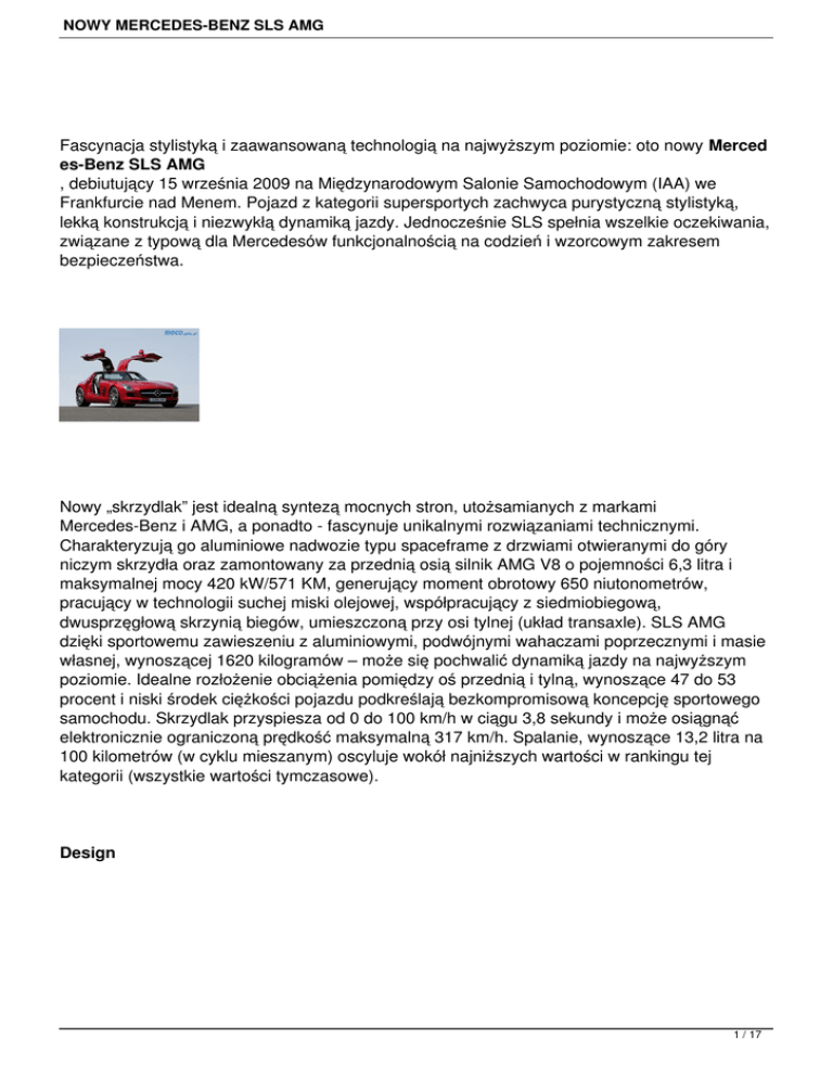 NOWY MERCEDES-BENZ SLS AMG Fascynacja stylistyką i zaawansowaną technologią na najwyższym poziomie: oto nowy Merced es-Benz SLS AMG , debiutujący 15 września 2009 na Międzynarodowym Salonie Samochodowym (IAA) we Frankfurcie nad Menem. Pojazd z kategorii supersportych zachwyca purystyczną stylistyką, lekką konstrukcją i niezwykłą dynamiką jazdy. Jednocześnie SLS spełnia wszelkie oczekiwania, związane z typową dla Mercedesów funkcjonalnością na codzień i wzorcowym zakresem bezpieczeństwa. Nowy „skrzydlak” jest idealną syntezą mocnych stron, utożsamianych z markami Mercedes-Benz i AMG, a ponadto - fascynuje unikalnymi rozwiązaniami technicznymi. Charakteryzują go aluminiowe nadwozie typu spaceframe z drzwiami otwieranymi do góry niczym skrzydła oraz zamontowany za przednią osią silnik AMG V8 o pojemności 6,3 litra i maksymalnej mocy 420 kW/571 KM, generujący moment obrotowy 650 niutonometrów, pracujący w technologii suchej miski olejowej, współpracujący z siedmiobiegową, dwusprzęgłową skrzynią biegów, umieszczoną przy osi tylnej (układ transaxle). SLS AMG dzięki sportowemu zawieszeniu z aluminiowymi, podwójnymi wahaczami poprzecznymi i masie własnej, wynoszącej 1620 kilogramów – może się pochwalić dynamiką jazdy na najwyższym poziomie. Idealne rozłożenie obciążenia pomiędzy oś przednią i tylną, wynoszące 47 do 53 procent i niski środek ciężkości pojazdu podkreślają bezkompromisową koncepcję sportowego samochodu. Skrzydlak przyspiesza od 0 do 100 km/h w ciągu 3,8 sekundy i może osiągnąć elektronicznie ograniczoną prędkość maksymalną 317 km/h. Spalanie, wynoszące 13,2 litra na 100 kilometrów (w cyklu mieszanym) oscyluje wokół najniższych wartości w rankingu tej kategorii (wszystkie wartości tymczasowe). Design 1 / 17 NOWY MERCEDES-BENZ SLS AMG Charakterystyczny design nowego Mercedes-Benz SLS AMG fascynuje namiętną sportowością, stanowiąc nową interpretację zapierającego dech w piersiach samochodu Mercedes-Benz 300 SL – jednej z najwybitniejszych ikon wzornictwa marki Mercedes-Benz. Poprzez purystyczny design SLS AMG na nowo definiuje współczesne zasady konstrukcji samochodów sportowych: pokrywa komory silnika o długości prawie dwóch metrów, płaska, przesunięta daleko do tyłu kabina „greenhouse” i krótki tył z wysuwanym spojlerem podkreślają dynamikę, tak samo jak długi rozstaw osi i szeroko rozstawione, duże koła. Krótkie zwisy ramy określają proporcje i współgrają z założeniami konstrukcyjnymi supersportowego samochodu, z centralnym silnikiem umieszczonym nisko i przesuniętym do tyłu oraz dwusprzęgłową skrzynią biegów, zamontowaną bezpośrednio przy osi tylnej (transaxle). Stylistyczny highlight stanowią bez wątpienia skrzydłowe drzwi, nadające SLS AMG niepowtarzalną charyzmę – to unikatowe rozwiązanie w tym segmencie pojazdów. Nie tylko skrzydłowe drzwi są nawiązaniem do Mercedesa 300 SL, również charakterystycznie szeroka atrapa chłodnicy z dużą gwiazdą Mercedesa i mająca kształt skrzydła poprzeczna nakładka wylotu powietrza przypominają oblicze legendarnego sportowego samochodu. Trójwymiarowy, rzeźbiony przód z pociągniętym nisko w dół, uwypuklonym pośrodku i wciągniętym po bokach przednim spojlerem zapewnia wyrazisty wizerunek. Siłę podkreśla sześć dużych wlotów powietrza i szeroko rozstawione, pionowe reflektory, których wnętrza same w sobie stanowią akcent stylistyczny: centralne, bi-ksenonowe światło mijania z metalowym elementem jest obramowane od góry przez dwa kierunkowskazy wykorzystujące diody świetlne, a od góry przez światło dzienne, również w technologii LED. Wpływy konstrukcji lotniczych 2 / 17 NOWY MERCEDES-BENZ SLS AMG Nawiązaniem do konstrukcji lotniczych jest długa pokrywa komory silnika: im dalej wzrok wędruje do przodu, tym bardziej przyspiesza jej zakrzywienie. Identyczny efekt wizualny daje kształt czterech nakładek w wersji „silver shadow”, zdobiących obie kratki wylotu ciepłego powietrza na końcu pokrywy komory silnika. Typowe dla samolotów wyprowadzenie linii nadwozia również optycznie tworzy poczucie szybszego opływu powietrza – w efekcie SLS AMG już na postoju sprawia niezwykle dynamiczne wrażenie. Nawiązania do nakładek zamontowanych na pokrywie komory silnika można odnaleźć po bokach pojazdu: znawca i tu odkryje typową cechę konstrukcyjną 300 SL. Oznaczenie „6.3” zintegrowane pomiędzy "skrzelami" wskazuje jednoznacznie, że pod maską znajduje się wolnossący silnik V8 o dużej pojemności skokowej. Boczne wyloty powietrza stylistycznie podkreślają określającą charakter linię, która wraz z wklęsłymi bokami i nadającymi napięcie płaszczyznami łączy w sobie estetykę i siłę. Niezwykle pociągająco prezentuje się kompaktowa część pasażerska, której nie można pomylić z żadną inną: pociągnięte wysoko krawędzie drzwi, płaskie szyby boczne i stroma szyba przednia sprawiają wrażenie stanowiska obserwacyjnego. Wrażenie dynamiki w czystej postaci przekazuje przechylony do przodu słupek B, z elegancką krzywizną, kończącą się przy szybie tylnej. Widok z boku: podkreślone muskuły i szerokie barki Patrząc z boku, uwagę zwraca uwypuklona linia barków SLS, która, niczym naprężony mięsień, rozciąga się na całej długości pojazdu. W znamionujących siłę, wysuniętych nadkolach znajdują się koła z charakterystycznymi obręczami ze stopu metali lekkich, 19-calowe z przodu i 20-calowe z tyłu. Trzy dostępne wersje obręczy uwidoczniają elementy wysokosprawnego układu hamulcowego AMG, wykorzystującego materiały kompozytowe. Gdy spojrzeć z góry, wychodząca od reflektorów, nieprzerwana linia prowadzi przez muskulaturę aż do części tylnej. Identyczny zabieg stylistyczny zastosowano również na pokrywie komory silnika, gdzie wzrok podąża za charakterystycznym konturem, poprzez dac
