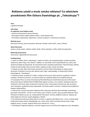 Reklama sztuki a może sztuka reklamy? Co właściwie przedstawia film Oskara Dawickiego pt. „Telezakupy”? Czas: 2 godziny lekcyjne Cele lekcji: Po zajęciach uczeń będzie umiał: - twórczo interpretować obrazy filmowe, - dostrzegać związki między językiem filmu i sztuk plastycznych, - formułować wypowiedzi, argumenty i wnioski związane z omawianym tematem. Metody pracy: elementy heurezy, praca w grupach, dyskusja, metoda „złote myśli”, praca z filmem Słowa kluczowe: artysta, sztuka, gratis, reklama, dzieło sztuki, oferta specjalna, zniżka, dzieło konceptualne Materiały pomocnicze: karta pracy, odpowiedzi do karty pracy. Przebieg lekcji: 1. Zapisz na tablicy słowo „telezakupy” i poproś uczniów, aby wyjaśnili pojęcie i podali wszystkie skojarzenia, jakie mają z tym słowem. Zadbaj o to, aby każdy uczeń wypowiedział się, nawet, jeśli skojarzenia będą się powtarzały. W razie konieczności uzupełnij wypowiedzi. Podsumowując zadanie, nawiąż do pierwszego członu tematu lekcji i zapytaj uczniów, jak go rozumieją. 2. Zapytaj uczniów, jakie informacje wyszukali na temat Oskara Dawickiego w ramach pracy domowej. Przedstaw uczniom plan dalszej części zajęć, zapowiadając, że obejrzą film Oskara Dawickiego pt. „Telezakupy”. 3. Podziel uczniów na grupy (4-5 osób) i rozdaj im karty pracy, które powinni uzupełnić w trakcie projekcji. Poinformuj uczniów, że ostatnia kolumnę uzupełnią dopiero po wspólnej dyskusji. 4. Po projekcji filmu ze strony internetowej Filmoteki Muzeum Sztuki Nowoczesnej w Warszawie (http://artmuseum.pl/filmoteka/?l=0&id=382) zapytaj uczniów o ich wrażenia. Następnie poproś o odczytanie informacji, jakie zanotowali na kartach pracy. Poprowadź rozmowę tak, aby uczniowie sami nawzajem uzupełniali swoje wypowiedzi. Na koniec poproś uczniów o ustalenie poszczególnych etapów reklamy/filmu. 5. Zaprezentuj uczniom ponownie fragment filmu dotyczący obrazów Bujnowskiego i Dawickiego (początek sceny 00:59 – 01:42) w celu analizy sceny. Poproś uczniów, aby w grupach dokonali anlizy filmowych środków wyrazu np. rodzaj planów filmowych, montaż, podkład muzyczny. Zapytaj, jak efekt dzięki tym formom został osiągnięty w filmie? 6. Na zakończenie pierwszej lekcji poproś uczniów o nagranie teleraklamy (ok. 1 min), w której będą zachęcali do kupna obrazu składającego się z samej ramy. Jeżeli uczniowie wyrażą chęć, mogą odegrać scenę „na żywo” podczas lekcji (czas również ok. 1 min.). 7. Na kolejnych zajęciach obejrzyj z uczniami nagrane przez nich filmy lub odegrane sceny. Następnie omów z uczniami wszystkie pomysły i zapytaj o towarzyszące im odczucia. Zapytaj ich, jak wykorzystanie samej ramy od obrazu umożliwiło im ukazanie „treści” samego obrazu? 8. Następnie zapisz na tablicy „złotą myśl” pochodzącą z filmu Oskara Dawickiego: „Krzesła nie służą tylko do siedzenia, ale i do myślenia.” A. Szymczyk. Zapytaj uczniów, jak interpretują słowa. 9. Następnie zainicjuj rozmowę na temat różnorodności pojęcia „sztuka” w odniesieniu do obejrzanego filmu. Nawiąż do tematu lekcji „Reklama sztuki a może sztuka reklamy?”. Możesz pomóc uczniom pytaniami, np. Do czego zachęca lub zniechęca telereklama? Jaką rolę pełni artysta w filmie Dawickiego? Jakie emocje wywołuje film? Co jest dziełem sztuki w obejrzanym filmie? 10. Podsumowując dyskusję, zapytaj uczniów, czy interpretacja filmu po przeprowadzonej analizie filmu pokrywa się z ich pierwszymi wrażeniami po jego obejrzeniu.