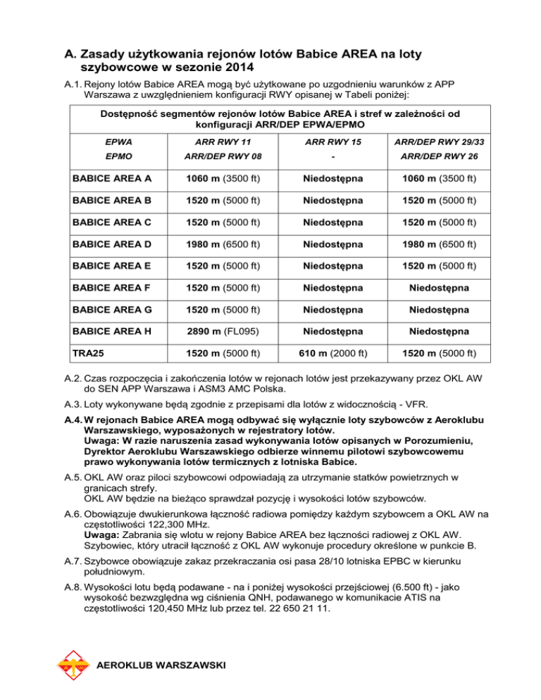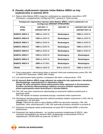 A. Zasady użytkowania rejonów lotów Babice AREA na loty szybowcowe w sezonie 2014 A.1. Rejony lotów Babice AREA mogą być użytkowane po uzgodnieniu warunków z APP Warszawa z uwzględnieniem konfiguracji RWY opisanej w Tabeli poniżej: Dostępność segmentów rejonów lotów Babice AREA i stref w zależności od konfiguracji ARR/DEP EPWA/EPMO EPWA ARR RWY 11 ARR RWY 15 ARR/DEP RWY 29/33 EPMO ARR/DEP RWY 08 - ARR/DEP RWY 26 BABICE AREA A 1060 m (3500 ft) Niedostępna 1060 m (3500 ft) BABICE AREA B 1520 m (5000 ft) Niedostępna 1520 m (5000 ft) BABICE AREA C 1520 m (5000 ft) Niedostępna 1520 m (5000 ft) BABICE AREA D 1980 m (6500 ft) Niedostępna 1980 m (6500 ft) BABICE AREA E 1520 m (5000 ft) Niedostępna 1520 m (5000 ft) BABICE AREA F 1520 m (5000 ft) Niedostępna Niedostępna BABICE AREA G 1520 m (5000 ft) Niedostępna Niedostępna BABICE AREA H 2890 m (FL095) Niedostępna Niedostępna TRA25 1520 m (5000 ft) 610 m (2000 ft) 1520 m (5000 ft) A.2. Czas rozpoczęcia i zakończenia lotów w rejonach lotów jest przekazywany przez OKL AW do SEN APP Warszawa i ASM3 AMC Polska. A.3. Loty wykonywane będą zgodnie z przepisami dla lotów z widocznością - VFR. A.4. W rejonach Babice AREA mogą odbywać się wyłącznie loty szybowców z Aeroklubu Warszawskiego, wyposażonych w rejestratory lotów. Uwaga: W razie naruszenia zasad wykonywania lotów opisanych w Porozumieniu, Dyrektor Aeroklubu Warszawskiego odbierze winnemu pilotowi szybowcowemu prawo wykonywania lotów termicznych z lotniska Babice. A.5. OKL AW oraz piloci szybowcowi odpowiadają za utrzymanie statków powietrznych w granicach strefy. OKL AW będzie na bieżąco sprawdzał pozycję i wysokości lotów szybowców. A.6. Obowiązuje dwukierunkowa łączność radiowa pomiędzy każdym szybowcem a OKL AW na częstotliwości 122,300 MHz. Uwaga: Zabrania się wlotu w rejony Babice AREA bez łączności radiowej z OKL AW. Szybowiec, który utracił łączność z OKL AW wykonuje procedury określone w punkcie B. A.7. Szybowce obowiązuje zakaz przekraczania osi pasa 28/10 lotniska EPBC w kierunku południowym. A.8. Wysokości lotu będą podawane - na i poniżej wysokości przejściowej (6.500 ft) - jako wysokość bezwzględna wg ciśnienia QNH, podawanego w komunikacie ATIS na częstotliwości 120,450 MHz lub przez tel. 22 650 21 11. AEROKLUB WARSZAWSKI Dostępność rejonów lotów oraz stref TRA 45 i TRA 25 podczas ARR RWY 11 EPWA oraz ARR/DEP RWY 08 EPMO Dostępność rejonów lotów oraz stref TRA 45 i TRA 25 podczas ARR/DEP RWY 29/33 EPWA oraz ARR/DEP RWY 26 EPMO AEROKLUB WARSZAWSKI B. Postępowanie w sytuacjach szczególnych B.1. Utrata łączności radiowej między OKL AW i szybowcem wykonującym lot w BABICE AREA B.1.1. Załoga szybowca, w przypadku utraty łączności radiowej, w ciągu 15 minut: a) b) c) opuści rejony lotów Babice AREA bez naruszenia przestrzeni kontrolowanej albo wykona lądowanie na lotnisku Babice, zgodnie z procedurą opisaną w punkcie B.3.2 i B.3.3 albo wykona lądowanie na lądowisku Chrcynno k/Nasielska. B.1.2. OKL AW niezwłocznie przekazuje informację o utracie łączności radiowej z szybowcem do SEN APP. B.2. Zmiana konfiguracji RWY na lotniskach EPWA i EPMO B.2.1. SEN APP przekazuje informację o zmianie konfiguracji RWY do AFIS Babice lub OKL AW i AMC Polska. B.2.2. Od chwili przekazania informacji przez SEN APP do OKL AW i AFIS o zmianie konfiguracji RWY statki powietrzne w ciągu 15 minut dostosują się do warunków lotu opisanych w punkcie A.1 lub a) b) opuszczą rejony lotów Babice AREA i/lub TRA 25 oraz będą wykonywać lot poza TMA; szybowce AW wykonują lądowanie na lądowisku Chrcynno k/Nasielska albo na lotnisku Babice. B.2.3. Jeżeli z jakiś powodów nie jest możliwe opuszczenie rejonów lotów lub stref w ciągu 15 minut, OKL AW informuje o tym SEN APP i po tym czasie stosuje procedurę opisaną w punkcie B.3.2 i B.3.3. B.3. Sytuacja awaryjna - użycie RWY 15 do lądowania w czasie krótszym niż 15 minut od momentu podania komunikatu B.3.1. SEN APP informuje OKL AW o konieczności natychmiastowego opuszczenia przez szybowce stref/rejonów lotów bez naruszenia przestrzeni kontrolowanej lub zastosowanie procedury opisanej w punktach B.3.2 i B.3.3. B.3.2. Szybowce w ciągu 5 min muszą znaleźć się w strefie SDC (zaznaczonej kolorem zielonym na rysunku poniżej) i lądować na lotnisku Babice zgodnie z procedurą. AEROKLUB WARSZAWSKI B.3.3. Podejście na lotnisko Babice odbywać się będzie w wydzielonych strefach dolotu SDC i SDB (punkt B.3.2) na wysokości nie większej niż: a) b) w strefie dolotu SDC - 1500 m (5000 ft) AMSL; w strefie dolotu SDB - wlot z segmentu SDC max na wysokości 1000 m (3280 ft) AMSL i dalej zniżanie tak, aby wschodni brzeg Wisły przekroczyć nie wyżej niż 750 m (2460 ft) AMSL. Dalej przelot Wisłostrady i wlot w krąg lotniskowy (ATZ) – nie wyżej niż 457 m (1500 ft) AMSL. B.4. Zmiana kierunku lądowania B.4.1. SEN APP przekazuje informację o zmianie kierunku lądowania do AFIS Babice i OKL AW. B.4.1.1. Od chwili przekazania informacji przez SEN APP do OKL AW o zmianie kierunku podejścia szybowce AW w ciągu 15 minut opuszczą rejony lotów Babice AREA lub dostosują się do odpowiedniego wariantu utrzymywania wysokości zgodnie z Tabelą w punkcie A.1. B.4.2. OKL Aeroklubu i AFIS mają obowiązek poinformowania SEN APP i ASM3 o zwolnieniu rejonów lotów i ich dezaktywacji. B.5. Inne szczególne sytuacje B.5.1. SEN APP Warszawa, w porozumieniu z OKL AW i/lub AFIS Babice, ma prawo zawiesić aktywność stref TRA 25 i TSA 45 (w przedziale wysokości kolizyjnych z TMA). Uzasadnienie podjęcia takiej decyzji SEN APP zobowiązany jest opisać w raporcie. Na wniosek jednej ze Stron Porozumienia komisja złożona z członków delegowanych przez osoby odpowiedzialne za współpracę przeprowadzi badanie raportu. AEROKLUB WARSZAWSKI C. Granice pionowe i poziome rejonów lotów, strefy TRA i ATZ Babice C.1. Granice rejony Babice AREA d