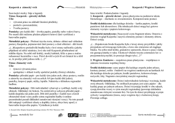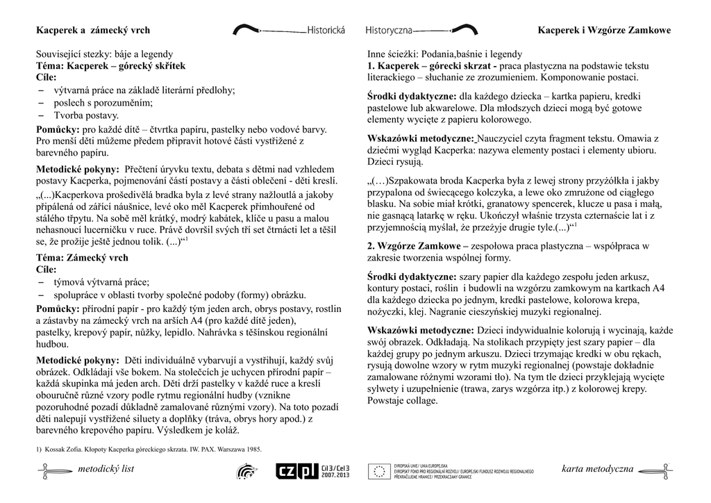 Kacperek a zámecký vrch Související stezky: báje a legendy Téma: Kacperek – górecký skřítek Cíle: – výtvarná práce na základě literární předlohy; – poslech s porozuměním; – Tvorba postavy. Pomůcky: pro každé dítě – čtvrtka papíru, pastelky nebo vodové barvy. Pro menší děti můžeme předem připravit hotové části vystřižené z barevného papíru. Metodické pokyny: Přečtení úryvku textu, debata s dětmi nad vzhledem postavy Kacperka, pojmenování částí postavy a části oblečení - děti kreslí. „(...)Kacperkova prošedivělá bradka byla z levé strany nažloutlá a jakoby připálená od zářící náušnice, levé oko měl Kacperek přimhouřené od stálého třpytu. Na sobě měl krátký, modrý kabátek, klíče u pasu a malou nehasnoucí lucerničku v ruce. Právě dovršil svých tří set čtrnácti let a těšil se, že prožije ještě jednou tolik. (...)“1 Téma: Zámecký vrch Cíle: – týmová výtvarná práce; – spolupráce v oblasti tvorby společné podoby (formy) obrázku. Pomůcky: přírodní papír - pro každý tým jeden arch, obrys postavy, rostlin a zástavby na zámecký vrch na arších A4 (pro každé dítě jeden), pastelky, krepový papír, nůžky, lepidlo. Nahrávka s těšínskou regionální hudbou. Metodické pokyny: Děti individuálně vybarvují a vystřihují, každý svůj obrázek. Odkládají vše bokem. Na stolečcích je uchycen přírodní papír – každá skupinka má jeden arch. Děti drží pastelky v každé ruce a kreslí obouručně různé vzory podle rytmu regionální hudby (vznikne pozoruhodné pozadí důkladně zamalované různými vzory). Na toto pozadí děti nalepují vystřižené siluety a doplňky (tráva, obrys hory apod.) z barevného krepového papíru. Výsledkem je koláž. Kacperek i Wzgórze Zamkowe Inne ścieżki: Podania,baśnie i legendy 1. Kacperek – górecki skrzat - praca plastyczna na podstawie tekstu literackiego – słuchanie ze zrozumieniem. Komponowanie postaci. Środki dydaktyczne: dla każdego dziecka – kartka papieru, kredki pastelowe lub akwarelowe. Dla młodszych dzieci mogą być gotowe elementy wycięte z papieru kolorowego. Wskazówki metodyczne: Nauczyciel czyta fragment tekstu. Omawia z dziećmi wygląd Kacperka: nazywa elementy postaci i elementy ubioru. Dzieci rysują. „(…)Szpakowata broda Kacperka była z lewej strony przyżółkła i jakby przypalona od świecącego kolczyka, a lewe oko zmrużone od ciągłego blasku. Na sobie miał krótki, granatowy spencerek, klucze u pasa i małą, nie gasnącą latarkę w ręku. Ukończył właśnie trzysta czternaście lat i z przyjemnością myślał, że przeżyje drugie tyle.(...)“1 2. Wzgórze Zamkowe – zespołowa praca plastyczna – współpraca w zakresie tworzenia wspólnej formy. Środki dydaktyczne: szary papier dla każdego zespołu jeden arkusz, kontury postaci, roślin i budowli na wzgórzu zamkowym na kartkach A4 dla każdego dziecka po jednym, kredki pastelowe, kolorowa krepa, nożyczki, klej. Nagranie cieszyńskiej muzyki regionalnej. Wskazówki metodyczne: Dzieci indywidualnie kolorują i wycinają, każde swój obrazek. Odkładają. Na stolikach przypięty jest szary papier – dla każdej grupy po jednym arkuszu. Dzieci trzymając kredki w obu rękach, rysują dowolne wzory w rytm muzyki regionalnej (powstaje dokładnie zamalowane różnymi wzorami tło). Na tym tle dzieci przyklejają wycięte sylwety i uzupełnienie (trawa, zarys wzgórza itp.) z kolorowej krepy. Powstaje collage. 1) Kossak Zofia. Kłopoty Kacperka góreckiego skrzata. IW. PAX. Warszawa 1985. metodický list karta metodyczna