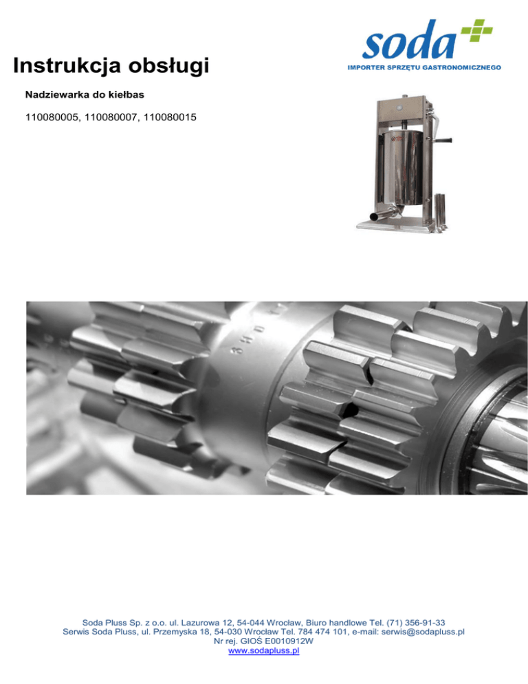 Instrukcja obsługi Nadziewarka do kiełbas 110080005, 110080007, 110080015 Soda Pluss Sp. z o.o. ul. Lazurowa 12, 54-044 Wrocław, Biuro handlowe Tel. (71) 356-91-33 Serwis Soda Pluss, ul. Przemyska 18, 54-030 Wrocław Tel. 784 474 101, e-mail: [email protected] Nr rej. GIOŚ E0010912W www.sodapluss.pl Instrukcja obsługi PRZED PIERWSZYM UŻYCIEM URZĄDZENIA NALEŻY DOKŁADNIE ZAPOZNAĆ SIĘ Z INSTRUKCJĄ OBSŁUGI. INSTUKCJĘ POWINNO SIĘ PRZECHOWYWAĆ W BEZPIECZNYM ORAZ W DOSTĘPNYM DLA KAŻDEGO UŻYTKOWNIKA MIEJSCU. WSKAZÓWKI BEZPIECZEŃSTWA Nadziewarkę do kiełbas zawsze należy ustawiać na płaskim, stabilnym podłożu. Jedynie autoryzowany serwisant lub wykwalifikowany technik powinien zajmować się naprawami, w przypadku wystąpienia usterek. URZĄDZENIE NADAJE SIĘ TYLKO DO UŻYTKU W POMIESZCZENIACH Opakowanie nie nadaje się do zabawy dla dzieci. Opakowania należy usunąć zgodnie z przepisami obowiązującymi na terenie Polski. WPROWADZENIE Prosimy poświęcić kilka chwil na zapoznanie się z niniejszą instrukcją. Prawidłowa konserwacja oraz użytkowanie urządzenia umożliwi optymalne wykorzystanie jego funkcji. ZAWARTOŚĆ OPAKOWANIA W opakowaniu znajduje się: Nadziewarka do kiełbas Korba do nadziewarki Lejki o średnicach: 13 mm, 20 mm, 30 mm, 36 mm Instrukcja obsługi Producent szczyci się jakością i serwisem zapewniając, że podczas pakowania produktu zawartość opakowania została skontrolowana pod względem jej kompletności, sprawności działania oraz braku uszkodzeń. W przypadku stwierdzenia jakichkolwiek uszkodzeń wynikających z transportu urządzenia bardzo prosimy o kontakt z naszym biurem Soda Pluss Sp. z o.o.: 071 356 91 33. DANE TECHNICZNE MODEL POJEMNOŚĆ WYDAJNOŚĆ 110080005 110080007 110080015 5 litrów 7 litrów 15 litrów ok. 7 kg ok. 11 kg ok. 17 kg WYMIARY WYS X SZER X DŁ (mm) Z LEJKIEM I KORBĄ 200 x 740 x 310 300 x 340 x 830 300 x 360 x 710 WAGA 10,50kg 15,60 kg 21,50 kg Soda Pluss Sp. z o.o. ul. Lazurowa 12, 54-044 Wrocław, Biuro handlowe Tel. (71) 356-91-33 Serwis Soda Pluss, ul. Przemyska 18, 54-030 Wrocław Tel. 784 474 101, e-mail: [email protected] Nr rej. GIOŚ E0010912W www.sodapluss.pl Instrukcja obsługi UŻYTKOWANIE Przed użyciem nadziewarki należy ją dokładnie umyć, przy pomocy ciepłej wody i środka dezynfekującego. Dokładnie wysuszyć. W celu prawidłowego złożenia urządzenia należy postępować zgodnie z zaleceniami producenta, przedstawionymi poniżej. MONTAŻ TŁOKA I ZĘBATKI Jeżeli tłok i zębatka zostały wyjęte z urządzenia należy je prawidłowo zamontować. W tym celu należy: 1. Upewnić się, że zęby w zębatce tłoka są skierowane ku dołowi. 2. Przekręcić korbę zgodnie z ruchem wskazówek zegara i wcisnąć zębatkę, tak aby znalazła się na swoim miejscu. NAPEŁNIANIE CYLINDRA Aby napełnić cylinder kiełbasiarki mięsem należy: 1. 2. 3. 4. Wykręcić tłok z urządzenia. Zdjąć cylinder z podstawy lub obrócić cylinder otworem wlotowym do góry. Zatkać wylot cylindra i wypełnić go przygotowanym mięsem. Położyć wypełniony cylinder na podstawie nadziewarki oraz umieścić tłok w otworze wlotowym. Soda Pluss Sp. z o.o. ul. Lazurowa 12, 54-044 Wrocław, Biuro handlowe Tel. (71) 356-91-33 Serwis Soda Pluss, ul. Przemyska 18, 54-030 Wrocław Tel. 784 474 101, e-mail: [email protected] Nr rej. GIOŚ E0010912W www.sodapluss.pl Instrukcja obsługi UWAGA: POWYŻSZE DZIAŁANIE ZAPEWNI, ŻE MIĘSO NIE WYDOSTANIE SIĘ POZA CYLINDER PODCZAS MOCOWANIA LEJKA I NADZIEWANIA KIEŁBAS. NADZIEWANIE KIEŁBAS 1. Przed rozpoczęciem nadziewania należy pod lejkiem umieścić naczynie odpowiednie do układania gotowych wyrobów. 2. Należy umieścić lejek w otworze wylotowym i przykręcić go nakrętką do cylindra – patrz rysunek. 3. Nasunąć osłonkę kiełbasy na lejek, pozostawiając ok. 2 cm luzu na końcu. 4. Delikatnie zakręcić korbą w celu rozpoczęcia przesuwania mięsa z cylindra nadziewarki do osłonki kiełbasy. UWAGA: ZALECA SIĘ UŻYWANIA NISKIEJ PRZEKŁADNI PODCZAS NADZIEWANIA KIEŁBAS (GÓRNE KOŁO ZĘBATE). 5. Zawiązać koniec osłonki aby zapobiec wydostaniu się mięsa. UWAGA: POWYŻSZE DZIAŁANIE MA NA CELU USUNIĘCIE POWIETRZA Z LEJKA ORAZ ZAPOBIEŻENIE POWSTAWANIA KIESZENI POWIETRZA W WYROBACH. 6. Powoli kręcić korbą w celu przemieszczenia mięsa z cylindra, poprzez lejek do osłonki. 7. Delikatnie naciągać osłonkę na lejek podczas pracy aby mieć pewność, że kiełbasa będzie dokładnie wypełniona mięsem. FORMOWANIE KIEŁBAS Podczas nadziewania kiełbas powstaje długi wałek mięsa w osłonce. Kiełbasy można formować zarówno podczas procesu nadziewania jak i po jego zakończeniu. W celu uformowania kiełbasy należy: 1. Delikatnie ścisnąć kciukiem i palcem wskazującym osłonkę wypełnioną mięsem w miejscu, w którym chcemy utworzyć zakończenie kiełbasy. 2. Uformować lukę w mięsie, uważając aby nie uszkodzić osłonki. 3. Przekręcić obie części w przeciwnych kierunkach, tak aby powstało „wiązanie” formujące kiełbasę. UWAGA: NADMIERNE NAPEŁNIENIE OSŁONKI MIĘSEM MOŻE SPOWODOWAĆ JEJ PĘKNIĘCIE PODCZAS FORMOWANIA KIEŁBAS LUB ICH GOTOWANIA. NIEDOSTATECZNE WYPEŁNIENIE OSŁONKI MIĘSEM MOŻE SPOWODOWAĆ POWSTANIE KIESZENI POWIETRZA, KTÓRE MOGĄ WYPEŁNIĆ SIĘ TŁUSZCZEM I ROZERWAĆ OSŁONKĘ PODCZAS GOTOWANIA. 4. Powtórzyć czynności z resztą produktu. MYCIE Do mycia nadziewarki nie należy używać żadnych ściernych środków czystości. Należy używać jedynie wody z łagodnym detergentem do mycia. Regularnie myć uszczelkę tłoka wodą z detergentem. Zawsze po umyciu nadziewarki należy ją dokładnie wysuszyć. Soda Pluss Sp. z o.o. ul. Lazurowa 12, 54-044 Wrocław, Biuro handlowe Tel. (71) 356-91-33 Serwis Soda Pluss, ul. Przemyska 18, 54-030 Wrocław Tel. 784 474 101, e-mail: [email protected] Nr rej. GIOŚ E0010912W www.sodapluss.pl Instrukcja obsługi W przypadku stwierdzenia usterek należy zgłosi