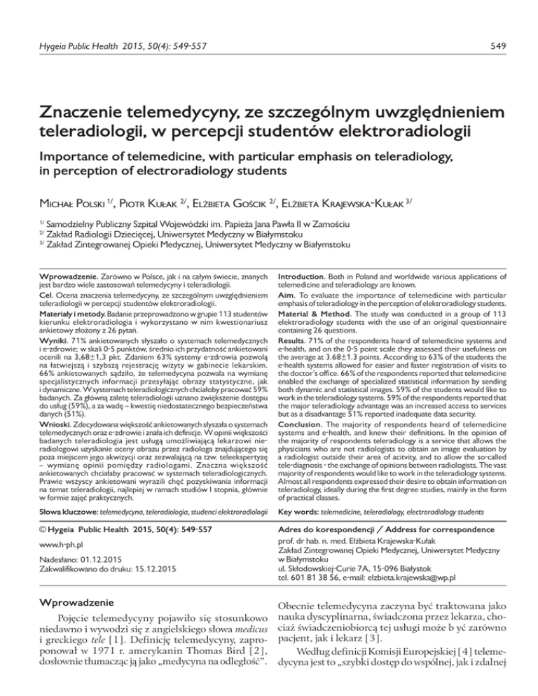 Krajewska-Kułak Hygeia Public Health E. Znaczenie 2015, 50(4): telemedycyny, 549-557 ze szczególnym uwzględnieniem teleradiologii, w percepcji ... 549 Znaczenie telemedycyny, ze szczególnym uwzględnieniem teleradiologii, w percepcji studentów elektroradiologii Importance of telemedicine, with particular emphasis on teleradiology, in perception of electroradiology students Michał Polski 1/, Piotr Kułak 2/, Elżbieta Gościk 2/, Elżbieta Krajewska-Kułak 3/ Samodzielny Publiczny Szpital Wojewódzki im. Papieża Jana Pawła II w Zamościu Zakład Radiologii Dziecięcej, Uniwersytet Medyczny w Białymstoku 3/ Zakład Zintegrowanej Opieki Medycznej, Uniwersytet Medyczny w Białymstoku 1/ 2/ Wprowadzenie. Zarówno w Polsce, jak i na całym świecie, znanych jest bardzo wiele zastosowań telemedycyny i teleradiologii. Cel. Ocena znaczenia telemedycyny, ze szczególnym uwzględnieniem teleradiologii w percepcji studentów elektroradiologii. Materiały i metody. Badanie przeprowadzono w grupie 113 studentów kierunku elektroradiologia i wykorzystano w nim kwestionariusz ankietowy złożony z 26 pytań. Wyniki. 71% ankietowanych słyszało o systemach telemedycznych i e-zdrowie; w skali 0-5 punktów, średnio ich przydatność ankietowani ocenili na 3,68±1,3 pkt. Zdaniem 63% systemy e-zdrowia pozwolą na łatwiejszą i szybszą rejestrację wizyty w gabinecie lekarskim. 66% ankietowanych sądziło, że telemedycyna pozwala na wymianę specjalistycznych informacji przesyłając obrazy statystyczne, jak i dynamiczne. W systemach teleradiologicznych chciałoby pracować 59% badanych. Za główną zaletę teleradiologii uznano zwiększenie dostępu do usług (59%), a za wadę – kwestię niedostatecznego bezpieczeństwa danych (51%). Wnioski. Zdecydowana większość ankietowanych słyszała o systemach telemedycznych oraz e-zdrowie i znała ich definicje. W opinii większości badanych teleradiologia jest usługą umożliwiającą lekarzowi nieradiologowi uzyskanie oceny obrazu przez radiologa znajdującego się poza miejscem jego akwizycji oraz zezwalającą na tzw. teleekspertyzę – wymianę opinii pomiędzy radiologami. Znaczna większość ankietowanych chciałaby pracować w systemach teleradiologicznych. Prawie wszyscy ankietowani wyrazili chęć pozyskiwania informacji na temat teleradiologii, najlepiej w ramach studiów I stopnia, głównie w formie zajęć praktycznych. Introduction. Both in Poland and worldwide various applications of telemedicine and teleradiology are known. Aim. To evaluate the importance of telemedicine with particular emphasis of teleradiology in the perception of elektroradiology students. Material & Method. The study was conducted in a group of 113 elektroradiology students with the use of an original questionnaire containing 26 questions. Results. 71% of the respondents heard of telemedicine systems and e-health, and on the 0-5 point scale they assessed their usefulness on the average at 3.68±1.3 points. According to 63% of the students the e-health systems allowed for easier and faster registration of visits to the doctor’s office. 66% of the respondents reported that telemedicine enabled the exchange of specialized statistical information by sending both dynamic and statistical images. 59% of the students would like to work in the teleradiology systems. 59% of the respondents reported that the major teleradiology advantage was an increased access to services but as a disadvantage 51% reported inadequate data security. Conclusion. The majority of respondents heard of telemedicine systems and e-health, and knew their definitions. In the opinion of the majority of respondents teleradiology is a service that allows the physicians who are not radiologists to obtain an image evaluation by a radiologist outside their area of acitvity, and to allow the so-called tele-diagnosis - the exchange of opinions between radiologists. The vast majority of respondents would like to work in the teleradiology systems. Almost all respondents expressed their desire to obtain information on teleradiology, ideally during the first degree studies, mainly in the form of practical classes. Słowa kluczowe: telemedycyna, teleradiologia, studenci elektroradiologii Key words: telemedicine, teleradiology, electroradiology students © Hygeia Public Health 2015, 50(4): 549-557 Adres do korespondencji / Address for correspondence www.h-ph.pl prof. dr hab. n. med. Elżbieta Krajewska-Kułak Zakład Zintegrowanej Opieki Medycznej, Uniwersytet Medyczny w Białymstoku ul. Skłodowskiej-Curie 7A, 15-096 Białystok tel. 601 81 38 56, e-mail: [email protected] Nadesłano: 01.12.2015 Zakwalifikowano do druku: 15.12.2015 Wprowadzenie Pojęcie telemedycyny pojawiło się stosunkowo niedawno i wywodzi się z angielskiego słowa medicus i greckiego tele [1]. Definicję telemedycyny, zaproponował w 1971 r. amerykanin Thomas Bird [2], dosłownie tłumacząc ją jako „medycyna na odległość”. Obecnie telemedycyna zaczyna być traktowana jako nauka dyscyplinarna, świadczona przez lekarza, chociaż świadczeniobiorcą tej usługi może b yć zarówno pacjent, jak i lekarz [3]. Według definicji Komisji Europejskiej [4] telemedycyna jest to „szybki dostęp do wspólnej, jak i zdalnej Hygeia Public Health 2015, 50(4): 549-557 550 wiedzy medycznej z wykorzystaniem technologii informacyjnych i telekomunikacyjnych, bez względu na to, gdzie znajduje się pacjent lub istotne informacje”. Według Szarpak [5], to „szybkie, nieograniczone narzędzie opieki zdrowotnej, któremu rozwój telekomunikacji i informatyki umożliwia dostęp do opieki zdrowotnej bez względu na bariery geograficzne i lokalizacje pacjenta”. Telemedycyna w celu wymiany informacji i danych zawartych w dokumentacjach medycznych po między różnego rodzaju instytucjami medycznymi (szpitale, kliniki, apteki, lekarze specjaliści, przychodnie itd.), wykorzystuje najnowocześniejsze technologie multimedialne, wideokomunikacje