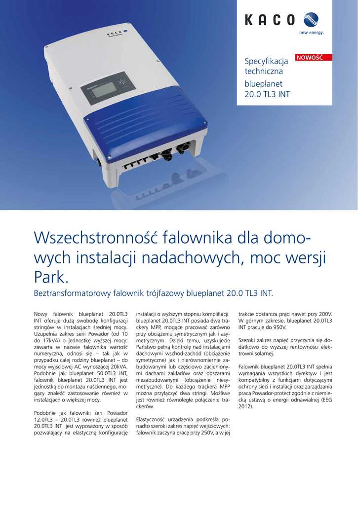 NOWY Specyfikacja NOWOŚĆ techniczna blueplanet 20.0 TL3 INT Wszechstronność falownika dla domowych instalacji nadachowych, moc wersji Park. Beztransformatorowy falownik trójfazowy blueplanet 20.0 TL3 INT. Nowy falownik blueplanet 20.0TL3 INT oferuje dużą swobodę konfiguracji stringów w instalacjach średniej mocy. Uzupełnia zakres serii Powador (od 10 do 17kVA) o jednostkę wyższej mocy: zawarta w nazwie falownika wartość numeryczna, odnosi się – tak jak w przypadku całej rodziny blueplanet – do mocy wyjściowej AC wynoszącej 20kVA. Podobnie jak blueplanet 50.0TL3 INT, falownik blueplanet 20.0TL3 INT jest jednostką do montażu naściennego, mogący znaleźć zastosowanie również w instalacjach o większej mocy. Podobnie jak falowniki serii Powador 12.0TL3 – 20.0TL3 również blueplanet 20.0TL3 INT jest wyposażony w sposób pozwalający na elastyczną konfigurację instalacji o wyższym stopniu komplikacji. blueplanet 20.0TL3 INT posiada dwa trackery MPP, mogące pracować zarówno przy obciążeniu symetrycznym jak i asymetrycznym. Dzięki temu, uzyskujecie Państwo pełną kontrolę nad instalacjami dachowymi wschód-zachód (obciążenie symetryczne) jak i nierównomiernie zabudowanymi lub częściowo zacienionymi dachami zakładów oraz obszarami niezabudowanymi (obciążenie niesymetryczne). Do każdego trackera MPP można przyłączyć dwa stringi. Możliwe jest również równoległe połączenie trackerów. Elastyczność urządzenia podkreśla ponadto szeroki zakres napięć wejściowych: falownik zaczyna pracę przy 250V, a w jej trakcie dostarcza prąd nawet przy 200V. W górnym zakresie, blueplanet 20.0TL3 INT pracuje do 950V. Szeroki zakres napięć przyczynia się dodatkowo do wyższej rentowności elektrowni solarnej. Falownik blueplanet 20.0TL3 INT spełnia wymagania wszystkich dyrektyw i jest kompatybilny z funkcjami dotyczącymi ochrony sieci i instalacji oraz zarządzania pracą Powador-protect zgodnie z niemiecką ustawą o energii odnawialnej (EEG 2012). NOWOŚĆ Maks. zalecana moc generatora fotowoltaicznego 24 000 W Zakres modułów śledzenia MPP 550 V ... 800 V Zakres roboczy 200 V / 950 V Min. napięcie DC / napięcie startowe 200 V / 250 V Napięcie stanu jałowego 1000 V Prąd wejściowy maks. 2 x 18,8 A Liczba trackerów MPP 2 moc maks./tracker 15,0 kW Liczba stringów 2x2 Parametry wyjściowe blueplanet 20.0 TL3 INT Moc znamionowa (przy napięciu 230 V) 20 000 VA@230 V Napięcie sieciowe 400 V / 230 V (3 / N / PE) Prąd znamionowy 3 x 29 A Częstotliwość znamionowa 50 Hz / 60 Hz cos fi 1 indukcyjna ... 0,3 pojemnościowa Liczba faz zasilających 3 Ogólne dane elektryczne Współczynnik sprawności do 98,4% 2 trackery MPP, obciążalne symetrycznie i asymetrycznie Współczynnik sprawności maks. 98,4 % Europejski współczynnik sprawności 98,1% Zużycie własne: Wyłączenie nocne 1,5 W Konfiguracja obwodu bez transformatora Monitorowanie sieci specyficzne dla kraju Konstrukcja mechaniczna Menu wielojęzyczne Wyświetlacz Wyświetlacz graficzny + diody LED Elementy obsługi Nawigacja 4-kierunkowa + 2 przyciski Porty standard: 2 x Ethernet, USB, RS485, Przekaźnik sygnału błędu opcjonalnie: 4-DI Przekaźnik sygnału błędu Zestyk bezpotencjałowy zwierny maks. 30 V / 1 A Złącza DC: wtyk do instalacji solarnych, AC: przepust kablowy M40 i zacisk (przekrój maks. 16 mm2 linka, 10 mm2 drut) Temperatura otoczenia -25°C … +60°C 1) Chłodzenie Wentylator regulowany zależnie od temperatury Stopień ochrony IP65 Emisja hałasu < 53 dB (A) Rozłącznik DC zintegrowany Obudowa odlew aluminiowy Wys. x szer. x głęb. 690 x 420 x 200 mm Masa 46,6 kg Wyświetlacz graficzny Rejestrator danych z serwerem Aktualizacja oprogramowania przez port USB Sterownik zużycia energii na potrzeby własne Priwatt za błędy drukarskie. Najnowsze wydanie zastępuje wszystkie poprzednie wydania. Obecnie obowiązujące wydanie można znaleźć na stronie www.kaco-newenergy.com 20.0 TL3 INT Parametry wejściowe Tekst i ilustracje odpowiadają stanowi techniki na dzień złożenia do druku. Zastrzega się prawo do dokonywania zmian o charakterze technicznym. Nie ponosimy odpowiedzialności Dane elektryczne PL 5001080-01-161004 blueplanet 20.0 TL3 INT 1) Lokalny dystrybutor www.kaco-newenergy.com Sp