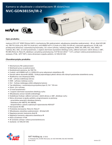 Kamera Kamera w w obudowie obudowie zz oświetlaczem oświetlaczem IR IR dzień/noc dzień/noc NVC-GDN3815H/IR-2 NVC-GDN3815H/IR-2 Opis produktu matryca CCD 1/3” SONY EXview HAD II, mechaniczny filtr podczerwieni, wbudowany oświetlacz podczerwieni - 40 szt. diod LED (40 m), 700 TVL (tryb cz-b), 650 TVL (tryb kol.), od 0.00002 lx/F=1.2 (tryb cz-b, DSS), 0 lx (IR wł.), stosunek sygnał/szum: 52 dB, tryb przełączania dzień/noc: automatyczny/manualny, 16 x zoom cyfrowy, redukcja migotania, WDR, DIS, DNR, HLC, AES, WB (5 trybów), BLC, AGC, 12 stref prywatności, 1 wyjście alarmowe wyzwalane detekcją ruchu, odbicie lustrzane i obrót obrazu o 180˚, RS-485 (Pelco-D, Pelco-P), obiektyw z przysłoną automatyczną: f=6~50 mm (43.6° ~ 5.5°), uchwyt i osłona przeciwsłoneczna w zestawie, IP 66, -10°C~50°C, menu ekranowe w języku polskim, 12 VDC/24 VAC Charakterystyka produktu Mechaniczny filtr podczerwieni Możliwość pracy w podczerwieni Rozdzielczość pozioma: do 700 TVL Czułość: od 0.00002 lx/F=1.2 (DSS) (0 lx przy włączonym oświetlaczu IR) Szeroki zakres dynamiki (WDR) - funkcja poprawiająca jakość obrazu dla różnych poziomów oświetlenia sceny Wydłużony czas ekspozycji (DSS) DIS - cyfrowa stabilizacja obrazu DNR - cyfrowa redukcja szumu HLC - funkcja redukująca efekt oślepiania kamery Typ obiektywu: z automatyczną przysłoną typu D, f=6 ~ 50 mm Zoom: 16 x cyfrowy 12 stref prywatności 1 wyjście alarmowe wyzwalane detekcją ruchu Wbudowany sensor światła widzialnego Dodatkowe funkcje: odbicie lustrzane i obrót obrazu o 180˚, detekcja ruchu Menu ekranowe w języku polskim, programowane za pomocą: - przycisków wewnątrz obudowy kamery, - klawiatury NV-KBD70, NV-KBD40, - bezpośrednio z panelu wybranych rejestratorów NOVUS® Sterowanie RS-485 Protokoły sterowania: Pelco-D, Pelco-P Wbudowany oświetlacz podczerwieni - 40 diod LED Regulacja jasności świecenia diod IR Regulacja momentu włączania oświetlacza IR Klasa szczelności: IP 66 W zestawie uchwyt i osłona przeciwsłoneczna Zasilanie: 12 VDC/24 VAC AAT Holding sp. z o.o. ul. Puławska 431, 02-801 Warszawa, tel. 022 546 0546, faks 022 546 0501 www.aat.pl strona 1/2 Kamera w obudowie z oświetlaczem IR dzień/noc NVC-GDN3815H/IR-2 Specyfikacja Model NVC-GDN3815H/IR-2 Przetwornik obrazu matryca CCD, 1/3” SONY EXview HAD II Rozdzielczość pozioma Czułość 650 TVL - tryb kolorowy, 700 TVL - tryb czarno-biały 0.1 lx/F=1.2 - tryb kolorowy (1/50 s), 0.01 lx/F=1.2 - tryb czarno-biały (1/50 s), 0.0002 lx/F=1.2 - tryb kolorowy DSS, 0.00002 lx/F=1.2 - tryb czarno-biały DSS, 0 lx (IR włączony) Stosunek sygnału do szumu > 52 dB (wyłączona ARW) Elektroniczna migawka automatyczna: 1/50 s ~ 1/120 000 s Wydłużona migawka 1/25 s ~ 10.24 s ARW (AGC) włączona/wyłączona Szeroki zakres dynamiki (WDR) Balans bieli włączony/wyłączony 5 trybów: manualny/automatyczny z zapamiętaną wartością referencyjną/dla oświetlenia zewnętrznego/dla oświetlenia wewnętrznego/automatyczny w szerokim zakresie temperatury barwowej Kompensacja jasnego tła (BLC) włączona/wyłączona Synchronizacja wewnętrzna Tryb przełączania dzień/noc automatyczny/manualny Opóźnienie załączenia filtru 3 s/5 s/7 s/10 s/15 s/20 s/30 s/40 s/60 s Typ obiektywu z automatyczną przysłoną typu D, f=6 ~ 50 mm Poziomy kąt widzenia obiektywu 43.6° ~ 5.5° Zoom 16 x cyfrowy Oświetlacz podczerwieni LED - 40 szt. Zasięg oświetlacza podczerwieni do 40 m Redukcja migotania włączona/wyłączona Wyjście sygnału wideo BNC, 1.0 Vp-p, 75 Ohm Wyjścia alarmowe 1, napięciowe - maks. 10 mA, 3 VDC Zdalne sterowanie RS-485 Protokół sterowania Pelco-D, Pelco-P Menu kamery wyświetlane na ekranie monitora (w języku polskim) Strefy prywatności 12 Dodatkowe funkcje DIS - cyfrowa stabilizacja obrazu, DNR - cyfrowa redukcja szumu, HLC - funkcja redukująca efekt oślepiania kamery, detekcja ruchu, tworzenie efektów: odbicie lustrzane i obrót obrazu o 180˚, ustawienie ostrości obrazu Obudowa aluminiowa z osłoną przeciwsłoneczną do montażu wewnętrznego/zewnętrznego, ściennego/sufitowego Klasa szczelności IP 66 Zasilanie 12 VDC/24 VAC Pobór mocy 4 W 7,4 W (IR włączony) Temperatura pracy -10°C ~ 50°C Wymiary (mm) 83 (szer) x 82 (wys) x 166 (dł) Masa 1,3 kg AAT Holding sp. z o.o. ul. Puławska 431, 02-801 Warszawa, tel. 022 546 0546, faks 022 546 0501 www.aat.pl strona 2/2