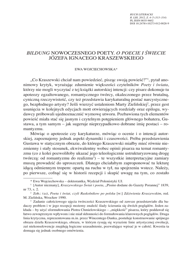 RUCH LITERACKI R. LIII, 2012, Z. 4–5 (313–314) PL ISSN 0035-9602 DOI 10.2478/v10273-012-0028-9 Bildung nowoczesnego poety. O Poecie i świecie Józefa Ignacego Kraszewskiego Ewa Wojciechowska* „Co Kraszewski chciał nam powiedzieć, pisząc swoją powieść?”1, pytał anonimowy krytyk, wyrażając zdumienie większości czytelników Poety i świata, którzy nie mogli wyczytać z tej książki autorskiej intencji: czy pisarz dokonuje tu apoteozy egzaltowanego, romantycznego twórcy, okaleczonego przez brutalną, cyniczną rzeczywistość, czy też przedstawia karykaturalną postać narcystycznego, bezpłodnego artysty? Jeśli wierzyć ustaleniom Marty Zielińskiej2, przez gest usunięcia w kolejnych edycjach mott otwierających rozdziały oraz epilogu, wydawcy próbowali ujednoznacznić wymowę utworu. Pozbawiona tych elementów powieść miała stać się jasnym i czytelnym potępieniem głównego bohatera, Gustawa, a tym samym – jak sugeruje nieprzypadkowo dobrane imię postaci – romantyzmu. Mówiąc o apoteozie czy karykaturze, mówiąc o ocenie i o intencji autorskiej, zapoznajemy jednak aspekt dynamiki i czasowości. Próba przedstawienia Gustawa w statycznym obrazie, do którego Kraszewski miałby mieć równie niezmienny i stały stosunek, ekwiwalentny wobec opinii pisarza na temat romantyzmu (co z kolei pozwoliłoby ukazać jego teleologicznie ustrukturyzowaną drogę twórczą: od romantyzmu do realizmu3) – te wszystkie interpretacyjne zamiary muszą prowadzić do uproszczeń. Dlatego chciałabym zaproponować tu lekturę idącą odmiennym tropem: opartą na ruchu w tył, na spojrzeniu wstecz. Należy, po pierwsze, cofnąć się w historii recepcji i skupić uwagę na tym, co zostało * Ewa Wojciechowska – doktorantka, Wydział Polonistyki UJ. 1 [Autor nieznany], Kraszewskiego Świat i poeta, „Pismo dodane do Gazety Porannej” 1839, nr 73, s. 2. 2 Zob.: t a ż, Poeta i świat, czyli Raskolnikow po polsku [w:] Zdziwienia Kraszewskim, red. M. Zielińska, Wrocław 1990. 3 Zadanie całościowego ujęcia twórczości Kraszewskiego od zawsze przedstawiało dla badaczy problem i w jego recepcji możemy znaleźć ślady ścierania się dwóch poglądów. Jeden zakłada – by użyć sformułowania Piotra Chmielowskiego – „miękkość” pisarza, który poddawał się łatwo zewnętrznym wpływom i nie miał skłonności do formułowania klarownych poglądów. Druga linia krytyczna, reprezentowana m.in. przez Wincentego Danka, postuluje konstruowanie spójnego obrazu dzieła Kraszewskiego, obrazu, w którym rysują się wyraziste linie artystycznej ewolucji, zaś niekonsekwencje znajdują logiczne uzasadnienie, pozwalające wpisać je w całość. Kwestia ta domaga się jednak osobnego omówienia. 434 Ewa Wojciechowska z tekstu usunięte, a następnie na chwilę odejść we wcześniejsze rejony historii literatury – ku Kochanowskiemu, który w mottach to ironicznie, to nostalgicznie komentuje à rebours przygody Gustawa. Tę operację należy także wykonać na samej materii powieściowej narracji: zanim zajmiemy się Gustawem jako romantycznym twórcą, należy spojrzeć na okres jego dzieciństwa. Wrażliwość poetycka cechuje bohatera od zawsze, od momentu narodzin, nawet zanim zostanie ona uświadomiona jako czynnik odróżniający jednostkę od innych. Przydział poetyckiego ducha ma charakter deterministyczny: nie może się pojawić w wyniku wolicjonalnego działania, nie można go sobie wypracować, nie można też samemu się go pozbawić. Jednak relacja między poetyckim zmysłem a wewnętrzną rzeczywistością poety ulega zmianom, i to w obrębie tej relacji dokonuje się kluczowy przełom w procesie samopoznania twórcy. Gustawa poznajemy wśród kwiatów, gdy jako jedyne z bawiących się na łące dzieci potrafi dostrzec piękno przyrody oraz jej metafizyczny wymiar. W tej otwierającej scenie ujawnia się podstawowa zasada kompozycyjna, rządzącą opisem poety, którą jest kontrast. Gustaw już w pierwszym przedstawieniu ukazany jest przez zderzenie jego wrażliwości z wrażliwością otaczających go ludzi, zaś fundamentalna różnica zasadza się na sposobie postrzegania rzeczywistości: poeta odmawia traktowania jej w ujęciu jedynie pragmatycznym. Podczas gdy Marynia plecie z kwiatów wianki dla swoich lalek, a Franuś szusuje na drewnianym koniu z takąż szablą po łące, depcząc rośliny w ferworze zabawy, Gustaw zastanawia się nad pięknem przyrody, a jej kontemplacja odsyła go do pytań o metafizyczny ład świata. Marynia i Franuś próbują zawłaszczać przestrzeń natury i odmawiają jej prawa do autonomii, traktując ją jedynie w paradygmacie użyteczności4. Ciotka Gustawa, reprezentująca świat dorosłych, sankcjonuje perspektywę pragmatyczną, mówiąc: Kwiatek, moje dziecię, nie kocha, dlatego że nie ma duszy, ani myśli, kwiatek jest dla człowieka pokarmem, ozdobą, lekarstwem [5]. Na tym etapie biografii, w dzieciństwie przeżywanym w zaciszu małego dworku szlacheckiego, w bliskim kontakcie z naturą, Gustaw wyczuwa swoją odrębność, ale nie stanowi ona dla niego jeszcze żadnego problemu, nie wpływa na postrzeganie przez niego własnej tożsamości, która pozostaje spójna i niezachwiana. Jak wszyscy poeci Kraszewskiego – odwołajmy się tu do wykładni Ewy Owczarz – Gustaw w okresie młodości nie ma ciała, jedynie duszę5, co wiąże się „Kwiatki nie żyją – powiada Marynia, uzasadniając swoje stanowisko – one są jak moja lalka, Gustawie” (J. I. K r a s z e w s k i, Poeta i świat, Poznań 1839, s. 2). W dalszej części tekstu cytaty lokalizuję bezpośrednio w tekście za tym wydaniem, podając w nawiasie kwadratowym numer strony. 5 E. O w c z a r z, Część pierwsza [w:] t e j ż e, Nieosiągalna całość. Szkice o powieści polskiej XIX wieku. Józef Ignacy Kraszewski – Ludwik Sztyrmer – Henryk Sienkiewicz, Toruń 2009, s. 25. 4 „Bildung” nowoczesnego poety. „O Poecie i 