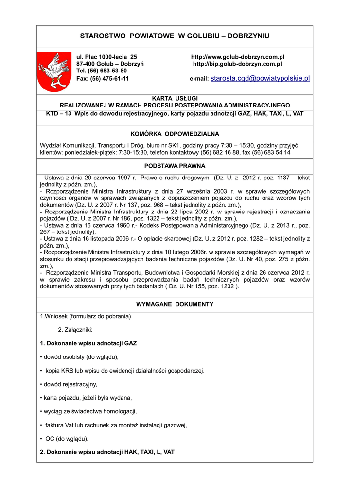 STAROSTWO POWIATOWE W GOLUBIU – DOBRZYNIU ul. Plac 1000-lecia 25 87-400 Golub – Dobrzyń Tel. (56) 683-53-80 Fax: (56) 475-61-11 http://www.golub-dobrzyn.com.pl http://bip.golub-dobrzyn.com.pl e-mail: [email protected] KARTA USŁUGI REALIZOWANEJ W RAMACH PROCESU POSTĘPOWANIA ADMINISTRACYJNEGO KTD – 13 Wpis do dowodu rejestracyjnego, karty pojazdu adnotacji GAZ, HAK, TAXI, L, VAT KOMÓRKA ODPOWIEDZIALNA Wydział Komunikacji, Transportu i Dróg, biuro nr SK1, godziny pracy 7:30 – 15:30, godziny przyjęć klientów: poniedziałek-piątek: 7:30-15:30, telefon kontaktowy (56) 682 16 88, fax (56) 683 54 14 PODSTAWA PRAWNA - Ustawa z dnia 20 czerwca 1997 r.- Prawo o ruchu drogowym (Dz. U. z 2012 r. poz. 1137 – tekst jednolity z późn. zm.), - Rozporządzenie Ministra Infrastruktury z dnia 27 września 2003 r. w sprawie szczegółowych czynności organów w sprawach związanych z dopuszczeniem pojazdu do ruchu oraz wzorów tych dokumentów (Dz. U. z 2007 r. Nr 137, poz. 968 – tekst jednolity z późn. zm.), - Rozporządzenie Ministra Infrastruktury z dnia 22 lipca 2002 r. w sprawie rejestracji i oznaczania pojazdów ( Dz. U. z 2007 r. Nr 186, poz. 1322 – tekst jednolity z późn. zm.), - Ustawa z dnia 16 czerwca 1960 r.- Kodeks Postępowania Administarcyjnego (Dz. U. z 2013 r., poz. 267 – tekst jednolity), - Ustawa z dnia 16 listopada 2006 r.- O opłacie skarbowej (Dz. U. z 2012 r. poz. 1282 – tekst jednolity z późn. zm.), - Rozporządzenie Ministra Infrastruktury z dnia 10 lutego 2006r. w sprawie szczegółowych wymagań w stosunku do stacji przeprowadzających badania techniczne pojazdów (Dz. U. Nr 40, poz. 275 z późn. zm.), - Rozporządzenie Ministra Transportu, Budownictwa i Gospodarki Morskiej z dnia 26 czerwca 2012 r. w sprawie zakresu i sposobu przeprowadzania badań technicznych pojazdów oraz wzorów dokumentów stosowanych przy tych badaniach ( Dz. U. Nr 155, poz. 1232 ). WYMAGANE DOKUMENTY 1.Wniosek (formularz do pobrania) 2. Załączniki: 1. Dokonanie wpisu adnotacji GAZ • dowód osobisty (do wglądu), • kopia KRS lub wpisu do ewidencji działalności gospodarczej, • dowód rejestracyjny, • karta pojazdu, jeżeli była wydana, • wyciąg ze świadectwa homologacji, • faktura Vat lub rachunek za montaż instalacji gazowej, • OC (do wglądu). 2. Dokonanie wpisu adnotacji HAK, TAXI, L, VAT • dowód osobisty (do wglądu), • kopia KRS lub wpisu do ewidencji działalności gospodarczej, • dowód rejestracyjny, • karta pojazdu, jeżeli była wydana, • zaświadczenie z badania technicznego (dotyczy adnotacji HAK), • zaświadczenie z przeprowadzonego badania technicznego pojazdu potwierdzające spełnienie przez pojazd dodatkowych warunków przewidzianych dla pojazdu „L”, • zaświadczenie z przeprowadzonego badania technicznego pojazdu potwierdzające spełnienie przez pojazd warunków wskazanych w art. 86 ust. 4 pkt 1-4 (dotyczy adnotacji VAT), • OC (do wglądu). SPOSÓB ZAŁATWIENIA SPRAWY Dokonanie odpowiedniej adnotacji w dowodzie rejestracyjnym oraz karcie pojazdu, jeśli była wydana. OPŁATY Opłata skarbowa: • 17 zł za pełnomocnictwo, jeżeli między mocodawcą a pełnomocnikiem nie zostaje zachowane pokrewieństwo w linii pierwszej (zstępni, wstępni, małżonkowie, rodzeństwo) (Dz. U. z 2006r. Nr 225, poz. 1635 – tekst jednolity z późn. zm.) Sposób oraz miejsce uiszczenia opłaty skarbowej: - kasa Urzędu Miasta, budynek główny – II piętro w godzinach od 8.00 do 14.00 - konto bankowe, numer konta bankowego UM. Golub-Dobrzyń 35 9551 0002 0100 2219 2000 0001 • Nie podlega opłacie administracyjnej. SPOSÓB DOSTARCZENIA DOKUMENTÓW • Osobiście w Wydziale Komunikacji, Transportu i Dróg, biuro nr SK 2, w godzinach 7:30 – 15:30, bądź przez pełnomocnika. • Za pomocą elektronicznej skrzynki podawczej na platformie ePuap, dołączając zamieszczone formularze do załatwienia sprawy, do formularza ogólnego (osoby posiadające podpis elektroniczny lub profil zaufany na platformie E-puap). MIEJSCE ZŁOŻENIA DOKUMENTÓW • Wydział Komunikacji, Transportu i Dróg, biuro nr 2. • Za pomocą elektronicznej skrzynki podawczej na platformie ePuap, dołączając zamieszczone formularze do załatwienia sprawy, do formularza ogólnego (osoby posiadające podpis elektroniczny lub profil zaufany na platformie E-puap). TERMIN ZAŁATWIENIA SPRAWY Zgodnie z art. 35 KPA bez zbędnej zwłoki, art. 35 § 3 nie później niż w ciągu 30 dniu, a w sprawach szczególnie skomplikowanych- nie później niż w ciągu 2 miesięcy od dnia wszczęcia postępowania. TRYB ODWOŁAWCZY Odwołanie nie przysługuje. FORMULARZ DO POBRANIA Wniosek Druk pełnomocnictwa REJESTR ZMIAN Zmianie uległ : 1. numer konta bankowego Urzędu Miasta z: 10 1020 5024 0000 1002 0010 1105 na: 35 9551 0002 0100 2219 2000 0001. 2. numer telefonu z (56) 683 54 14 na (56) 682 16 88. 3. 01.03.2013 r. - dokonano aktualizacji aktów prawnych, zmieniono miejsce przyjmowania klientów z biura nr SK2 na SK1.