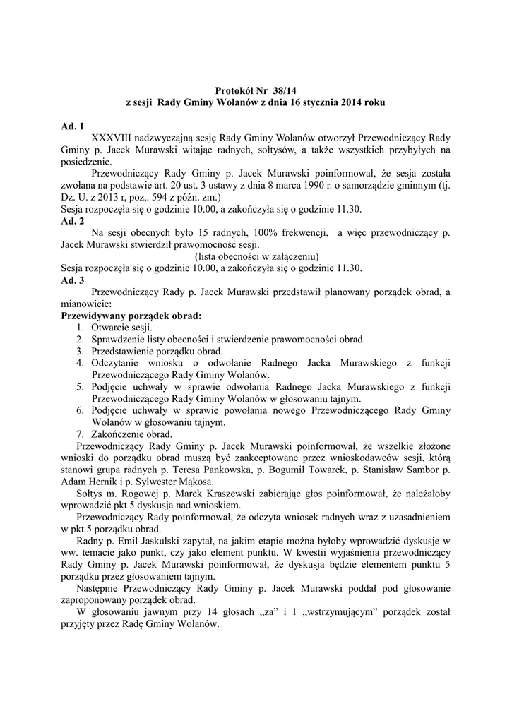 Protokół Nr 38/14 z sesji Rady Gminy Wolanów z dnia 16 stycznia 2014 roku Ad. 1 XXXVIII nadzwyczajną sesję Rady Gminy Wolanów otworzył Przewodniczący Rady Gminy p. Jacek Murawski witając radnych, sołtysów, a także wszystkich przybyłych na posiedzenie. Przewodniczący Rady Gminy p. Jacek Murawski poinformował, że sesja została zwołana na podstawie art. 20 ust. 3 ustawy z dnia 8 marca 1990 r. o samorządzie gminnym (tj. Dz. U. z 2013 r, poz,. 594 z późn. zm.) Sesja rozpoczęła się o godzinie 10.00, a zakończyła się o godzinie 11.30. Ad. 2 Na sesji obecnych było 15 radnych, 100% frekwencji, a więc przewodniczący p. Jacek Murawski stwierdził prawomocność sesji. (lista obecności w załączeniu) Sesja rozpoczęła się o godzinie 10.00, a zakończyła się o godzinie 11.30. Ad. 3 Przewodniczący Rady p. Jacek Murawski przedstawił planowany porządek obrad, a mianowicie: Przewidywany porządek obrad: 1. Otwarcie sesji. 2. Sprawdzenie listy obecności i stwierdzenie prawomocności obrad. 3. Przedstawienie porządku obrad. 4. Odczytanie wniosku o odwołanie Radnego Jacka Murawskiego z funkcji Przewodniczącego Rady Gminy Wolanów. 5. Podjęcie uchwały w sprawie odwołania Radnego Jacka Murawskiego z funkcji Przewodniczącego Rady Gminy Wolanów w głosowaniu tajnym. 6. Podjęcie uchwały w sprawie powołania nowego Przewodniczącego Rady Gminy Wolanów w głosowaniu tajnym. 7. Zakończenie obrad. Przewodniczący Rady Gminy p. Jacek Murawski poinformował, że wszelkie złożone wnioski do porządku obrad muszą być zaakceptowane przez wnioskodawców sesji, którą stanowi grupa radnych p. Teresa Pankowska, p. Bogumił Towarek, p. Stanisław Sambor p. Adam Hernik i p. Sylwester Mąkosa. Sołtys m. Rogowej p. Marek Kraszewski zabierając głos poinformował, że należałoby wprowadzić pkt 5 dyskusja nad wnioskiem. Przewodniczący Rady poinformował, że odczyta wniosek radnych wraz z uzasadnieniem w pkt 5 porządku obrad. Radny p. Emil Jaskulski zapytał, na jakim etapie można byłoby wprowadzić dyskusje w ww. temacie jako punkt, czy jako element punktu. W kwestii wyjaśnienia przewodniczący Rady Gminy p. Jacek Murawski poinformował, że dyskusja będzie elementem punktu 5 porządku przez głosowaniem tajnym. Następnie Przewodniczący Rady Gminy p. Jacek Murawski poddał pod głosowanie zaproponowany porządek obrad. W głosowaniu jawnym przy 14 głosach „za” i 1 „wstrzymującym” porządek został przyjęty przez Radę Gminy Wolanów. Ad. 4 Przewodniczący Rady Gminy p. Jacek Murawski odczytał wniosek o odwołanie Radnego Jacka Murawskiego z funkcji Przewodniczącego Rady Gminy Wolanów. (wniosek w załączeniu) Przewodniczący Rady Gminy p. Jacek Murawski odniósł się do uzasadnienia wniosku informując, że objął mandat radnego z myślą, że będzie współpracować, a nie rozsiewać zamieszanie. Jeżeli ma własne zdanie nie wyraża go na forum publicznym, żeby nie zajmować czasu, jeżeli ma uwagi bądź wnioski do Wójta również składa je bezpośrednio do niego, a nie na forum popisując się przed radnymi. Przewodniczący Rady Gminy p. Jacek Murawski odniósł się do zarzutu odnośnie niedotrzymywania terminów związanych z odpowiedziami na wnioski, zapytania i interpelacje informując, że nie zna takiego przypadku, aby nie została udzielona odpowiedź nieterminowo na jakiekolwiek pismo, które wpłynęło do Rady Gminy. Następnie p. Jacek Murawski odniósł się do pism wpływających do Rady, parafowanych przez Wójta informując, że Rada Gminy nie ma osobnego biura, jest biuro rady gminy, które jest wydzielone w strukturze urzędu, to nie jest biuro, które działa osiem godzin dziennie i tylko na potrzeby Rady Gminy. Przy tak małej Gminie jest możliwość stworzenia dodatkowego biura, ale to są dodatkowe koszty – dodał. Kontynuując swą wypowiedź poinformował, że korespondencja wpływająca do Rady Gminy jest wpisywana w ten sam dziennik, co korespondencja wpływająca do Urzędu Gminy Wolanów. W ciągu ostatnich trzech lat tak się działo z pismami, najpierw były rejestrowane w kancelarii ogólnej, a potem trafiały do przewodniczącego Rady. Kończąc swą wypowiedź przewodniczący Rady Gminy powiedział, że szanuje wniosek radnych, ponieważ mają takie prawo, aby wniosek w ww. temacie złożyć, aczkolwiek osobiście nie widzi przewodniczący żadnych przesłanek do odwołania. Natomiast zaapelował do radnych, aby podjęli decyzję zgodnie z własnym sumieniem niezależnie od wypowiedzi przewodniczącego, czy też wniosku złożonego przez grupę radnych. Przewodniczący Rady Gminy p. Jacek Murawski zapytał, czy ktoś z obecnych chciałby zabrać głos. Radna p. Teresa Pankowska zabierając głos powiedziała, że w porządku obrad nie było uwzględnionej dyskusji. W odpowiedzi przewodniczący Rady poinformował, że osobiście przewodniczy obradom i może udzielić głosu każdemu kto zechce go zabrać. Nadmienił, że na początku kadencji to radna p. Teresa Pankowska stawiała zarzuty, że czasem przewodniczący nie pozwalał się wypowiadać sołtysom. Radna p. Teresa Pankowska poprosiła o przejście do kolejnego punktu porządku obrad. Następnie Sekretarz Gminy p. Małgorzata Szczepaniak zabierając głos odniosła się do uzasadnienia radnych, które znalazło się we wniosku o odwołanie przewodniczącego, szczególnie w kwestii organizacyjnej UG, czyli dekretowania pism. Poinformowała, że zgodnie z art. 33 ustawy o samorządzie gminnym wójt wykonuje zadania przy pomocy urzędu, określa organizację i zasady funkcjonowania urzędu i wykonuje uprawnienia zwierzchnika służbowego w stosunku do pracowników. Obsługę administracyjną i techniczną Rady Gminy zapewnia pracownik Urzędu Gminy podległy służbowo Wójtowi, jako kierownikowi jednostki. W strukturze Urzędu Gminy Wolanów funkcjonuje jedna kancelaria obsługująca cały Urząd. Nie wyodrębniono oddzielnej kancelarii do przyjmo