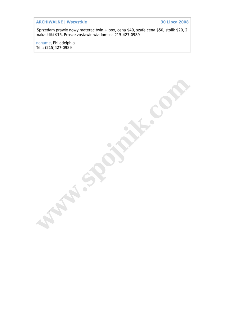 ARCHIWALNE | Wszystkie 30 Lipca 2008 Sprzedam prawie nowy materac twin + box, cena $40, szafe cena $50, stolik $20, 2 nakastliki $15. Prosze zostawic wiadomosc 215-427-0989 w w w .s po jn ik .c o m noname, Philadelphia Tel.: (215)427-0989