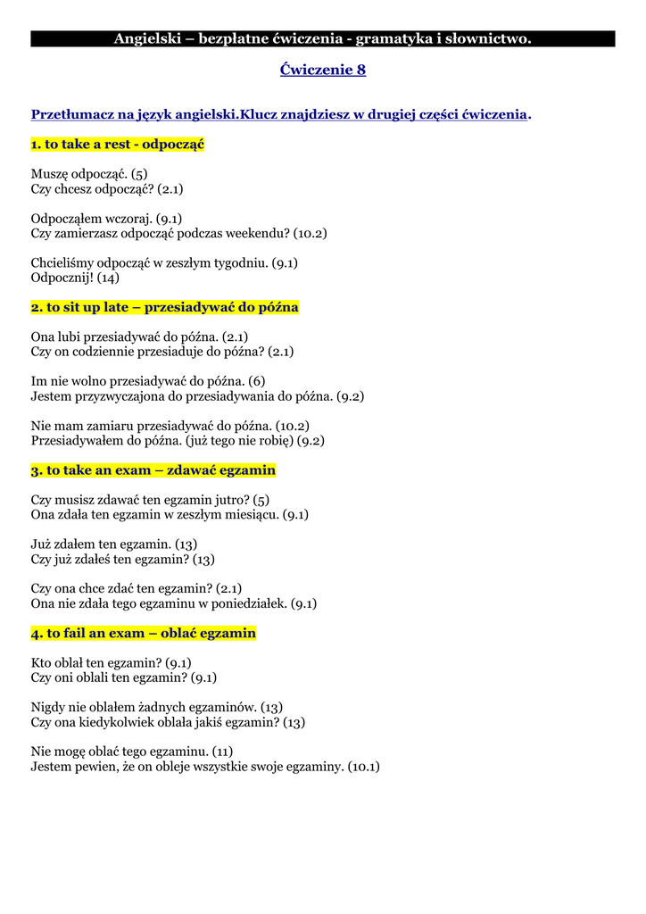 Angielski – bezpłatne ćwiczenia - gramatyka i słownictwo. Ćwiczenie 8 Przetłumacz na język angielski.Klucz znajdziesz w drugiej części ćwiczenia. 1. to take a rest - odpocząć Muszę odpocząć. (5) Czy chcesz odpocząć? (2.1) Odpocząłem wczoraj. (9.1) Czy zamierzasz odpocząć podczas weekendu? (10.2) Chcieliśmy odpocząć w zeszłym tygodniu. (9.1) Odpocznij! (14) 2. to sit up late – przesiadywać do późna Ona lubi przesiadywać do późna. (2.1) Czy on codziennie przesiaduje do późna? (2.1) Im nie wolno przesiadywać do późna. (6) Jestem przyzwyczajona do przesiadywania do późna. (9.2) Nie mam zamiaru przesiadywać do późna. (10.2) Przesiadywałem do późna. (już tego nie robię) (9.2) 3. to take an exam – zdawać egzamin Czy musisz zdawać ten egzamin jutro? (5) Ona zdała ten egzamin w zeszłym miesiącu. (9.1) Już zdałem ten egzamin. (13) Czy już zdałeś ten egzamin? (13) Czy ona chce zdać ten egzamin? (2.1) Ona nie zdała tego egzaminu w poniedziałek. (9.1) 4. to fail an exam – oblać egzamin Kto oblał ten egzamin? (9.1) Czy oni oblali ten egzamin? (9.1) Nigdy nie oblałem żadnych egzaminów. (13) Czy ona kiedykolwiek oblała jakiś egzamin? (13) Nie mogę oblać tego egzaminu. (11) Jestem pewien, że on obleje wszystkie swoje egzaminy. (10.1) 5. to come back - wracać Ona nigdy nie wraca na czas. (2.1) Muszę wrócić do domu do 6. (5) Ona wróciła do domu dwa dni temu. (9.1) Czy ona wróciła do domu dwa dni temu? (9.1) Chciałbym wrócić do domu za pięć dni. (8) Kto chciałby wrócić do domu w przyszłym tygodniu? (8) 6. to get a job – dostać pracę Czy on dostał pracę w zeszłym tygodniu? (9.1) On dostał tą pracę w zeszłym tygodniu. (9.1) On właśnie dostał tą pracę. (13) Kiedy on dostał tą pracę? (9.1) Dlaczego on nie może dostać żadnej pracy? (11) Musisz dostać pracę! (5) 7. to do odd jobs – pracować dorywczo Czy pracujesz dorywczo? (2.1) On pracował dorywczo kilka lat temu. (9.1) Czy on pracował dorywczo kilka miesięcy temu? (9.1) Kiedy on pracował dorywczo? (9.1) On nie pracował dorywczo zeszłego lata. (9.1) Ona nie pracuje teraz dorywczo. (2.2) 8. to be married – być mężatką/żonatym On jest żonaty. (1) Czy on jest żonaty? (1) Byłam mężatką dziesięć lat temu. (1) Kiedy on był żonaty? (1) Ona nigdy nie była mężatką. (1) Dlaczego nie chcesz być żonatym? (1) 9. to fall ill - zachorować Nie zamierzam znowu zachorować. (10.2) Zachorowałem zeszłej zimy. (9.1) Czy zachorowałeś dwa dni temu? (9.1) On wczoraj nie zachorował. (9.1) Czy kiedykolwiek zachorowałeś? (13) Nie możemy w tym tygodniu zachorować. (11) 10. to be out of order – nie działać/być zapsutym Moje radio nie działa, muszę je naprawić. (1) Jego samochód w zeszłym tygodniu był zepsuty. (1) Dlaczego te maszyna jest zepsuta? (1) Te maszyny w zeszłym tygodniu były zepsute. (1) Kiedy nie działał twój komputer? (1) To nie powinno być zepsute. (1) (4) KLUCZ DO ĆWICZENIA 1. to take a rest - odpocząć I must have a rest. - Muszę odpocząć. Do you want to take a rest? - Czy chcesz odpocząć? I took a rest yesterday. - Odpocząłem wczoraj. Are you going to take a rest at the weekend? - Czy zamierzasz odpocząć podczas weekendu? We wanted to take a rest last week. - Chcieliśmy odpocząć w zeszłym tygodniu. Take a rest! - Odpocznij! 2. to sit up late – przesiadywać do późna She likes to sit up late. - Ona lubi przesiadywać do późna. Does he sit up late every day? - Czy on codziennie przesiaduje do późna? They mustn't sit up late. - Im nie wolno przesiadywać do późna. I'm used to sitting up late. - Jestem przyzwyczajona do przesiadywania do późna. I'm not going to sit up late. - Nie mam zamiaru przesiadywać do późna. I used to sit up late. - Przesiadywałem do późna. (już tego nie robię) 3. to take an exam – zdawać egzamin Do you have to take this exam tomorrow? - Czy musisz zdawać ten egzamin jutro? She took this exam last month. - Ona zdała ten egzamin w zeszłym miesiącu. I've already taken this exam. - Już zdałem ten egzamin. Have you taken this exam yet? - Czy już zdałeś ten egzamin? Does she want to take this exam? - Czy ona chce zdać ten egzamin? She didn't take this exam on Monday. - Ona nie zdała tego egzaminu w poniedziałek. 4. to fail an exam – oblać egzamin Who failed this exam? - Kto oblał ten egzamin? Did they fail this exam? - Czy oni oblali ten egzamin? I've never failed any exams. - Nigdy nie oblałem żadnych egzaminów. Has she ever failed any exam? - Czy ona kiedykolwiek oblała jakiś egzamin? I can't fail this exam. – Nie mogę oblać tego egzaminu. I'm sure he will fail all his exams. - Jestem pewien, że on obleje wszystkie swoje egzaminy. 5. to come back - wracać She never comes back on time. - Ona nigdy nie wraca na czas. I must come back home till 6. - Muszę wrócić do domu do 6. She came back home two days ago. - Ona wróciła do domu dwa dni temu. Did she come back home two days ago? - Czy ona wróciła do domu dwa dni temu? I'd like to come back home in five days. - Chciałbym wrócić do domu za pięć dni. Who would like to come back home next week? - Kto chciałby wrócić do domu w przyszłym tygodniu? 6. to get a job – dostać pracę Did he get a job last week? - Czy on dostał pracę w zeszłym tygodniu? He got this job last week. - On dostał tę pracę w zeszłym tygodniu. He's just got this job. - On właśnie dostał tą pracę. When did he get this job? - Kiedy on dostał tę pracę? Why can't he get any job? - Dlaczego on nie może dostać żadnej pracy? You must get a job! - Musisz dostać pracę! 7. to do odd jobs – pracować dorywczo Do you do odd jobs? - Czy pracujesz dorywczo? He did odd jobs a few years ago. - On pracował dorywczo kilka lat temu. Did he do odd jobs a few months ago? - Czy on pracował dorywczo kilka miesięcy temu? When did he do odd jobs? - Kiedy on pracował dorywczo? He didn't do o