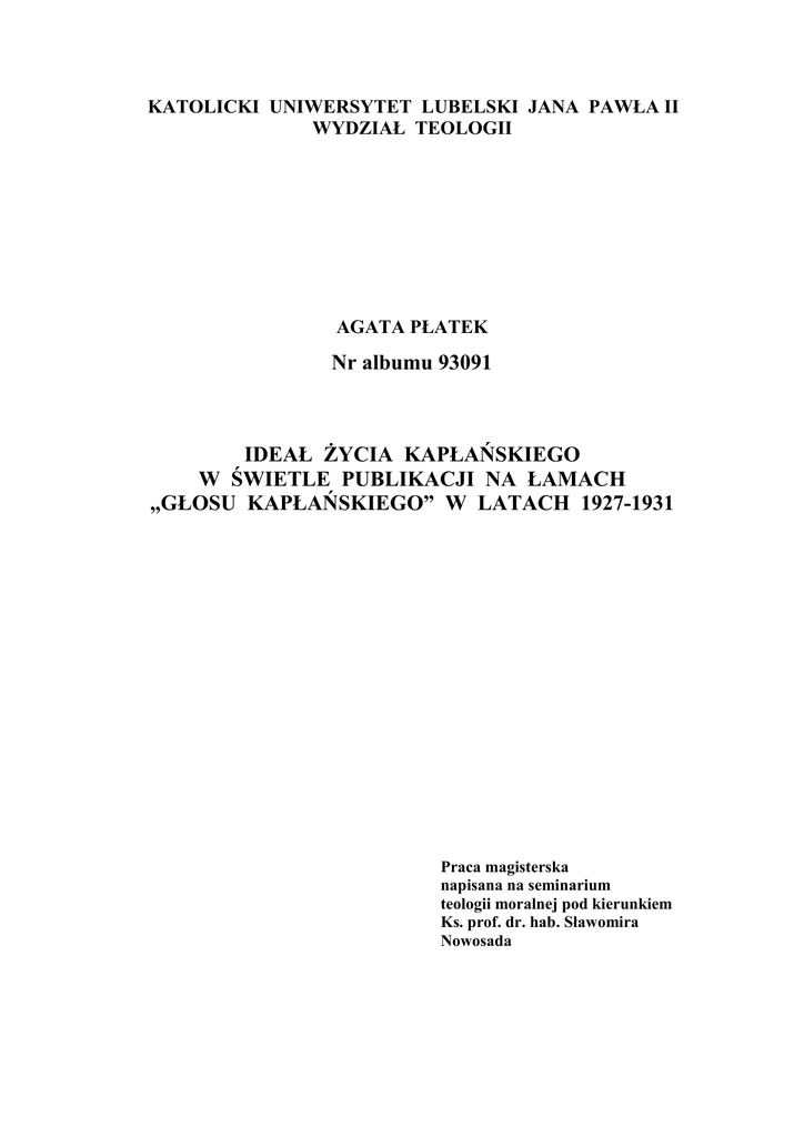 KATOLICKI UNIWERSYTET LUBELSKI JANA PAWŁA II WYDZIAŁ TEOLOGII AGATA PŁATEK Nr albumu 93091 IDEAŁ ŻYCIA KAPŁAŃSKIEGO W ŚWIETLE PUBLIKACJI NA ŁAMACH „GŁOSU KAPŁAŃSKIEGO” W LATACH 1927-1931 Praca magisterska napisana na seminarium teologii moralnej pod kierunkiem Ks. prof. dr. hab. Sławomira Nowosada LUBLIN 2007 SPIS TREŚCI Wykaz skrótów ..................................................................................................................................... 3 Bibliografia Wstęp ..................................................................................................................................... 4 ...................................................................................................................................................... 8 Rozdział I. Błogosławiony ksiądz Ignacy Kłopotowski na tle epoki 1. Ogólna sytuacja Kościoła katolickiego w Polsce .......................... 12 ................................................ 12 2. Rys biograficzny błogosławionego księdza Ignacego Kłopotowskiego......... ..... 16 3. Działalność charytatywno-duszpasterska ................................................................. 19 4. Działalność redakcyjno-duszpasterska .................................................................... 23 Rozdział II. Życie duchowe kapłana w świetle „Głosu Kapłańskiego”...................... 27 1. Duchowość eucharystyczna .......................................................................................... 27 2. Modlitwa źródłem duchowości kapłańskiej ........................................................... 31 3. Radykalizm ewangeliczny drogą do świętości kapłańskiej ............................ 35 Rozdział III. Wymiar apostolski kapłaństwa ......................................................................... 1. Kapłan – głosiciel Słowa i szafarz sakramentów 44 2. Kapłan pasterzem według serca Bożego 49 3. Święty Jan Vianney jako wzór kapłana 53 Zakończenie Aneks 44 ................................................ ................................................................. .................................................................... .......................................................................................................................................... 59 ...................................................................................................................................................... 61 WYKAZ SKRÓTÓW BG - „Boży Gazeciarz” [Biuletyn Prac nad Beatyfikacją] DeV - Jan Paweł II. Encyklika Dominum et Vivificantem GK - „Głos Kapłański” HD - „Homo Dei” PDV - Jan Paweł II. Adhortacja Pastores dabo vobis PK - „Polak-Katolik” RH - Jan Paweł II. Encyklika Redemptor hominis RT - „Roczniki Teologiczne” VS - Jan Paweł II. Encyklika Veritatis splendor BIBLIOGRAFIA I. ŹRÓDŁA 1. ŹRÓDŁA PODSTAWOWE „Głos Kapłański”1:1927 nr 1 – 5 :1931nr 8 2. ŹRÓDŁA POMOCNICZE A. INNE PUBLIKACJE BŁ. KS. KŁOPOTOWSKIEGO Bądźmy do szpiku kości Polakami i katolikami. „Posiew” 1: 1906 nr 7 s. 99-102. Przytułek świętego Antoniego. Lublin 1906. Pomóżcie nam przyjaciele. „Posiew” 8: 1913 nr 8 s. 214-216. Nawiedzenia Najświętszego Sakramentu. Warszawa 1930. Pójdź i ty do spowiedzi. Warszawa 1930. B. DOKUMENTY KOŚCIOŁA Benedykt XV: Encyklika o głoszeniu Słowa Bożego (Rzym 16 VI 1917). GK 2:1928 nr 5 s. 129-135. Jan Paweł II: Encyklika Redemptor hominis. Watykan 1979. Jan Paweł II: Encyklika Dominum et Vivificantem. Watykan 1986. Jan Paweł II: Encyklika Veritatis splendor. Watykan 1993. Jan Paweł II: Adhortacja Pastores dabo vobis. Watykan 1992. Listy Ojca Świętego Jana Pawła II do wszystkich kapłanów Kościoła na Wielki Czwartek (1979-1997). Kraków 1998. II. OPRACOWANIA Bielecka K.: ABC życia chrześcijańskiego według księdza Ignacego Kłopotowskiego. Warszawa 2005. Cordo E. D.: Ojcowie Kościoła mistrzami formacji kapłańskiej. Tłum. K. Charensa. Lublin 2005. Chomiuk Z. A.: Błogosławiony ksiądz Ignacy Kłopotowski w służbie ubogim i potrzebującym. Warszawa 2005. Chomiuk Z. A.: Całym życiem dziękować. Błogosławiony ksiądz Ignacy Kłopotowski 1866 – 1931. Warszawa 2005. Karolak T.: Ksiądz Ignacy Kłopotowski. Warszawa 1992. Malej W.: Ksiądz Ignacy Kłopotowski założyciel Zgromadzenia SS Loretanek 1866 – 1931. Warszawa 1958. Nowosad S.: Między Wieczernikiem a Kalwarią. Jana Pawła II wielkoczwartkowe listy do kapłanów. „Ethos” 10: 1997 nr 2-3 s. 69-79. Olszewski D.: Ksiądz Ignacy Kłopotowski. Życie i apostolat. Warszawa 1996. Stopniak F. : Franciszek Jaczewski biskup lubelski. Warszawa 1981. Styk J.: Ksiądz Ignacy Kłopotowski 1866 - 1931. Społecznik, publicysta i wydawca. Warszawa 1987. Verlinde J. M.: Duchowość kapłańska w nauczaniu Jana Pawła II. Warszawa 2004. III. LITERATURA POMOCNICZA Chmielewski M.: Vademecum duchowości katolickiej 101 pytań o życie duchowe. Lublin 2004. Czaja A.: Credo in Spiritum Vivificantem. Pneumatologiczna interpretacja Kościoła jako komunii w posoborowej teologii niemieckiej. Lublin 2003. Dębski K.: Bohaterstwo unitów podlaskich (1875 – 1905). Czerwińsk 1989. Drączkowski F.: Piękno prawdziwe. Konferencje radiowe. Pelplin 1998. Dybowski M.: Kapłaństwo. Warszawa 2003. Glombik K.: Sens pokuty zadawanej podczas spowiedzi. HD 73: 2003 nr 4 s. 11-27. Gogola J.: Kierownictwo duchowe. Kraków 1997. Grudniok F.: Być kapłanem. Refleksje ascetyczno-duszpasterskie. Kraków 1978. Tenże: Kochać kapłaństwo. Rozważania ascetyczno-duszpasterskie na tle przykładu i wypowiedzi Jana Pawła II. Kraków 1984. Kobieta w oczach Sługi Bożego Księdza Ignacego Kłopotowskiego. BG nr 4 s. 2-3. Krzyż w życiu księdza Ignacego. BG nr 6 s. 2-3. Kejsiewicz M.: Rady dla młodych księży. Kraków 1999. Kluz W.: Ziarnko gorczycy. O. Honorat Koźmiński OFM Cap 1829 – 1919. Wars