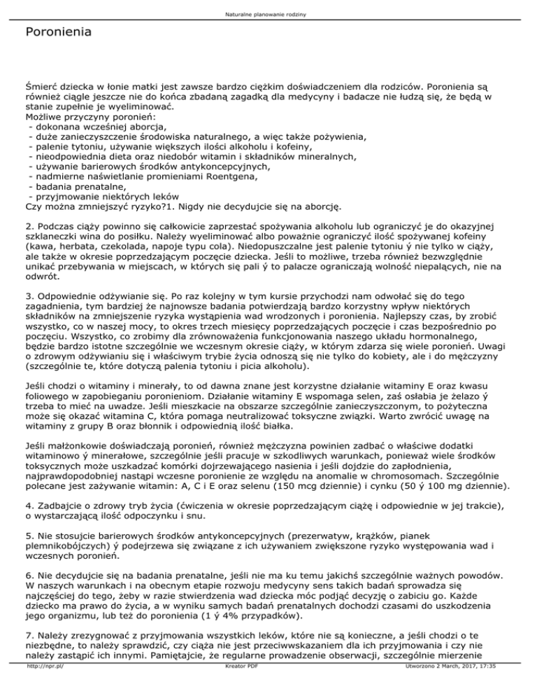 Naturalne planowanie rodziny Poronienia Śmierć dziecka w łonie matki jest zawsze bardzo ciężkim doświadczeniem dla rodziców. Poronienia są również ciągle jeszcze nie do końca zbadaną zagadką dla medycyny i badacze nie łudzą się, że będą w stanie zupełnie je wyeliminować. Możliwe przyczyny poronień: - dokonana wcześniej aborcja, - duże zanieczyszczenie środowiska naturalnego, a więc także pożywienia, - palenie tytoniu, używanie większych ilości alkoholu i kofeiny, - nieodpowiednia dieta oraz niedobór witamin i składników mineralnych, - używanie barierowych środków antykoncepcyjnych, - nadmierne naświetlanie promieniami Roentgena, - badania prenatalne, - przyjmowanie niektórych leków Czy można zmniejszyć ryzyko?1. Nigdy nie decydujcie się na aborcję. 2. Podczas ciąży powinno się całkowicie zaprzestać spożywania alkoholu lub ograniczyć je do okazyjnej szklaneczki wina do posiłku. Należy wyeliminować albo poważnie ograniczyć ilość spożywanej kofeiny (kawa, herbata, czekolada, napoje typu cola). Niedopuszczalne jest palenie tytoniu ý nie tylko w ciąży, ale także w okresie poprzedzającym poczęcie dziecka. Jeśli to możliwe, trzeba również bezwzględnie unikać przebywania w miejscach, w których się pali ý to palacze ograniczają wolność niepalących, nie na odwrót. 3. Odpowiednie odżywianie się. Po raz kolejny w tym kursie przychodzi nam odwołać się do tego zagadnienia, tym bardziej że najnowsze badania potwierdzają bardzo korzystny wpływ niektórych składników na zmniejszenie ryzyka wystąpienia wad wrodzonych i poronienia. Najlepszy czas, by zrobić wszystko, co w naszej mocy, to okres trzech miesięcy poprzedzających poczęcie i czas bezpośrednio po poczęciu. Wszystko, co zrobimy dla zrównoważenia funkcjonowania naszego układu hormonalnego, będzie bardzo istotne szczególnie we wczesnym okresie ciąży, w którym zdarza się wiele poronień. Uwagi o zdrowym odżywianiu się i właściwym trybie życia odnoszą się nie tylko do kobiety, ale i do mężczyzny (szczególnie te, które dotyczą palenia tytoniu i picia alkoholu). Jeśli chodzi o witaminy i minerały, to od dawna znane jest korzystne działanie witaminy E oraz kwasu foliowego w zapobieganiu poronieniom. Działanie witaminy E wspomaga selen, zaś osłabia je żelazo ý trzeba to mieć na uwadze. Jeśli mieszkacie na obszarze szczególnie zanieczyszczonym, to pożyteczna może się okazać witamina C, która pomaga neutralizować toksyczne związki. Warto zwrócić uwagę na witaminy z grupy B oraz błonnik i odpowiednią ilość białka. Jeśli małżonkowie doświadczają poronień, również mężczyzna powinien zadbać o właściwe dodatki witaminowo ý minerałowe, szczególnie jeśli pracuje w szkodliwych warunkach, ponieważ wiele środków toksycznych może uszkadzać komórki dojrzewającego nasienia i jeśli dojdzie do zapłodnienia, najprawdopodobniej nastąpi wczesne poronienie ze względu na anomalie w chromosomach. Szczególnie polecane jest zażywanie witamin: A, C i E oraz selenu (150 mcg dziennie) i cynku (50 ý 100 mg dziennie). 4. Zadbajcie o zdrowy tryb życia (ćwiczenia w okresie poprzedzającym ciążę i odpowiednie w jej trakcie), o wystarczającą ilość odpoczynku i snu. 5. Nie stosujcie barierowych środków antykoncepcyjnych (prezerwatyw, krążków, pianek plemnikobójczych) ý podejrzewa się związane z ich używaniem zwiększone ryzyko występowania wad i wczesnych poronień. 6. Nie decydujcie się na badania prenatalne, jeśli nie ma ku temu jakichś szczególnie ważnych powodów. W naszych warunkach i na obecnym etapie rozwoju medycyny sens takich badań sprowadza się najczęściej do tego, żeby w razie stwierdzenia wad dziecka móc podjąć decyzję o zabiciu go. Każde dziecko ma prawo do życia, a w wyniku samych badań prenatalnych dochodzi czasami do uszkodzenia jego organizmu, lub też do poronienia (1 ý 4% przypadków). 7. Należy zrezygnować z przyjmowania wszystkich leków, które nie są konieczne, a jeśli chodzi o te niezbędne, to należy sprawdzić, czy ciąża nie jest przeciwwskazaniem dla ich przyjmowania i czy nie należy zastąpić ich innymi. Pamiętajcie, że regularne prowadzenie obserwacji, szczególnie mierzenie http://npr.pl/ Kreator PDF Utworzono 2 March, 2017, 17:35 Naturalne planowanie rodziny temperatury, pozwoli Wam bardzo wcześnie rozpoznać, że pojawiło się nowe życie. Jeśli temperatura utrzymuje się na wyższym poziomie przez 21 dni, to możecie być prawie pewni, że zostaliście rodzicami i że właśnie zaczyna bić serce Waszego dziecka. Powrót płodności po poronieniu. Proszę przeczytać krótki fragment z podręcznika (str. 175). Czas po poronieniu jest prawie zawsze czasem płodności. To znaczy, że przed kolejną miesiączką najczęściej dochodzi do owulacji. Zacznijcie więc od razu mierzyć temperaturę. W niektórych przypadkach będzie się ona jeszcze przez jakiś czas utrzymywać na wyższym poziomie ý jak w czasie ciąży ý po czym opadnie do zwykłego przedowulacyjnego poziomu niższego. Jeśli chcecie odłożyć poczęcie kolejnego dziecka, powstrzymajcie się od współżycia do początku fazy III, wyznaczonego według zwykłych reguł objawowo ý termicznych. http://npr.pl/ Kreator PDF Utworzono 2 March, 2017, 17:35
