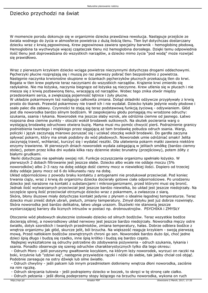 Naturalne planowanie rodziny Dziecko przychodzi na świat W momencie porodu dokonuje się w organizmie dziecka prawdziwa rewolucja. Następuje przejście ze świata wodnego do życia w atmosferze powietrza z dużą ilością tlenu. Tlen był dotychczas dostarczany dziecku wraz z krwią pępowinową. Krew pępowinowa zawiera specjalny barwnik - hemoglobinę płodową. Hemoglobina ta wychwytuje więcej cząsteczek tlenu niż hemoglobina dorosłego. Dzięki temu odpowiednia ilość tlenu jest doprowadzana do wszystkich narządów, a dziecko mimo życia "pod wodą" może rozwijać się prawidłowo. Wraz z pierwszym krzykiem dziecko wciąga powietrze nieczynnymi dotychczas drogami oddechowymi. Pęcherzyki płucne rozprężają się i muszą po raz pierwszy pobrać tlen bezpośrednio z powietrza. Następnie naczynka krwionośne skupione w ściankach pęcherzyków płucnych przekazują tlen do krwi. Bogata w tlen krew popłynie teraz naczyniami do wszystkich narządów. Krążenie krwi zmieniło się radykalnie. Nie ma łożyska, naczynia biegnące od łożyska są nieczynne. Krew utlenia się w płucach i nie miesza się z krwią pozbawioną tlenu, wracającą od narządów. Wobec tego znika otwór między przedsionkami serca, a zwiększają pojemność tętnice i żyły płucne. W układzie pokarmowym też następuje całkowita zmiana. Dotąd składniki odżywcze przypływały z krwią prosto do tkanek. Przewód pokarmowy nie trawił ich i nie wydalał. Dziecko łykało jedynie wody płodowe i ssało palec dla zabawy. Czynności te stają się teraz podstawową funkcją życiową - odżywianiem. Głód jest dla noworodka bardzo silnym bodźcem. W zaspokojeniu głodu pomagają mu wrodzone odruchy: szukania, ssania i łykania. Noworodek ma jeszcze słaby wzrok, ale odróżnia ciemne od jasnego. Łatwo rozpozna dwa ciemne punkty - otoczki wokół brodawek sutkowych. Na skutek pocierania warg o wystającą brodawkę odruchowo otwiera buzię. Mama musi mu pomóc chwycić pierś. Podrażnienie granicy podniebienia twardego i miękkiego przez sięgającą aż tam brodawkę pobudza odruch ssania. Wargi, policzki i język zaczynają miarowo poruszać się i uciskać otoczkę wokół brodawki. Do gardła zaczyna spływać pokarm, który ma smak podobny do wód płodowych. Noworodek umie odróżniać smaki! Jelita zaczynają trawić, wchłaniać, kurczyć się i wydalać resztki. Dla ułatwienia pokarm matki zawiera niektóre enzymy trawienne. W pierwszych dniach noworodek wydala zalegającą w jelitach smółkę (bardzo ciemny stolec), potem przez kilka dni wydala kilka razy dziennie stolec brunatny (przejściowy), potem żółty z białymi grudkami. Nerki dotychczas nie spełniały swojej roli. Funkcje oczyszczania organizmu spełniało łożysko. W pierwszych 2 dobach filtrowanie jest jeszcze słabe. Dziecko albo wcale nie oddaje moczu (5% noworodków) albo 2-3 razy na dobę oddaje dość ciemny mocz w niewielkiej ilości. Dopiero od trzeciej doby oddaje jasny mocz od 6 do kilkunastu razy na dobę. Układ odpornościowy z powodu braku kontaktu z antygenami nie produkował przeciwciał. Pod koniec trwania ciąży, wraz z krwią do organizmu dziecka docierały gotowe ciała odpornościowe. Po urodzeniu dziecko jest narażone na kontakt z substancjami i mikroorganizmami, przed którymi musi się bronić. Jednak ilość wytwarzanych przeciwciał jest jeszcze bardzo niewielka, bo układ jest jeszcze niedojrzały. Na szczęście sporą ilość przeciwciał otrzymuje dziecko wraz z pokarmem, a zwłaszcza z siarą. Skóra, błony śluzowe miały dotychczas kontakt jedynie z płynem o idealnie łagodnej temperaturze. Teraz dziecko musi znieść dotyk ubrań, pieluch, zmiany temperatury. Zmysł dotyku jest już dobrze rozwinięty. Skóra noworodka jest bardzo delikatna, łatwo ulega urazom. Śluzówki nie stanowią jeszcze wystarczającej bariery dla licznych intruzów w postaci np. drobnoustrojów. PSYCHIKA i ZMYSŁY Otoczenie wód płodowych skutecznie izolowało dziecko od silnych bodźców. Teraz wszystkie bodźce docierają silniej, a noworodkowy układ nerwowy jest jeszcze bardzo niedojrzały. Noworodka męczy ostre światło, dotyk szorstkich i twardych przedmiotów, zmiana temperatury, hałas. Dobrze odbiera bodźce z wnętrza organizmu jak głód, skurcze jelit, ból brzucha. Na większość reaguje krzykiem - swoją pierwszą mową. Przed natłokiem bodźców zewnętrznych chroni go sen. Noworodek bardzo dużo śpi, choć jedne dzieci śpią długo i budzą się rzadko, inne śpią krótko i budzą się bardzo często. Najlepiej wykształcone są odruchy potrzebne do zdobywania pożywienia - odruch szukania, łykania i ssania. Ponadto obserwuje się szereg odruchów charakterystycznych tylko dla tego okresu: - Odruch Moro - jeśli poruszymy gwałtownie kocykiem, na którym leży noworodek, wyrzuci on raczki na boki, krzyknie lub "zdziwi się", następnie przywiedzie rączki i nóżki do siebie, tak jakby chciał coś objąć. Podobnie zareaguje na ostry dźwięk lub silne światło. - Odruch chwytny - jeśli palcem lub innym przedmiotem dotkniemy wnętrza dłoni noworodka, zaciśnie na nim rączkę. - Odruch skręcania tułowia - jeśli podrapiemy dziecko w boczek, to skręci w tę stronę całe ciałko. - Odruch pełzania - jeśli dłonią podeprzemy stopy leżącego na brzuchu noworodka, wykona on ruch http://npr.pl/ Kreator PDF Utworzono 2 March, 2017, 17:35 Naturalne planowanie rodziny skokowy do przodu. - Odruch automatycznego chodzenia - jeśli przytrzymując dziecko pod paszki dotkniemy jego stopami podłoża, będzie na przemian podnosić nóżki jak przy chodzeniu. Wszystkie układy młodego organizmu dziecka są jeszcze bardzo niedojrzałe. Dlatego noworodek wymaga troskliwej opieki i wielkiej dbałości. W tym czasie całym światem biologicznym i psychicznym jest dla dziecka matka. Mleko mamy, ciepło jej ciała, jej głos od dawna znany, miarowe, też dobrze znane bicie jej serca - to ws
