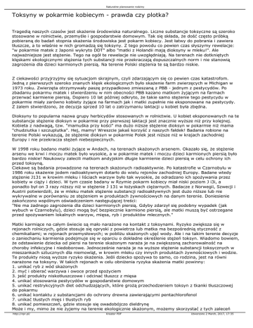Naturalne planowanie rodziny Toksyny w pokarmie kobiecym - prawda czy plotka? Tragedią naszych czasów jest skażenie środowiska naturalnego. Liczne substancje toksyczne są szeroko stosowane w rolnictwie, przemyśle i gospodarstwie domowym. Tak się składa, że dość często próbką pobieraną do badań stopnia skażenia środowiska jest pokarm kobiecy. Jest łatwy do pobrania i zawiera tłuszcze, a to właśnie w nich gromadzą się toksyny. Z tego powodu co pewien czas słyszymy rewelacje: "w pokarmie matek z Japonii wykryto DDT" albo "matki z Holandii mają dioksyny w mleku!". Ale najważniejsze jest stężenie. Tego na ogół te rewelacje nie uwzględniają. Na terenach nie dotkniętych klęskami ekologicznymi stężenia tych substancji nie przekraczają dopuszczalnych norm i nie stanowią zagrożenia dla dzieci karmionych piersią. Na terenie Polski stężenia te są bardzo niskie. Z ciekawości przyjrzyjmy się sytuacjom skrajnym, czyli zdarzającym się co pewien czas katastrofom. Jedną z pierwszych szeroko znanych klęsk ekologicznych było skażenie farm zwierzęcych w Michigan w 1973 roku. Zwierzęta otrzymywały paszę przypadkowo zmieszaną z PBB - jednym z pestycydów. Po zbadaniu pokarmu matek i stwierdzeniu w nim obecności PBB kazano matkom żyjącym na farmach przerwać karmienie piersią. Dopiero 10 lat później odkryto, że takie samo stężenie tego pestycydu w pokarmie miały zarówno kobiety żyjące na farmach jak i matki zupełnie nie eksponowane na pestycydy. Z żalem stwierdzono, że decyzja sprzed 10 lat o zatrzymaniu laktacji u kobiet była zbędna. Dioksyny to popularna nazwa grupy herbicydów stosowanych w rolnictwie. U kobiet eksponowanych na te substancje stężenie dioksyn w pokarmie przy pierwszej laktacji jest znacznie wyższe niż przy kolejnej. Kobieta z nadwagą, tzw. "mamuśka przy kości" ma dużo niższe stężenie dioksyn w pokarmie niż mama "chudziutka i szczuplutka". Hej, mamy! Wreszcie jakaś korzyść z naszych fałdek! Badania robione na terenie Polski wykazują, że stężenie dioksyn w pokarmie Polek jest niższe niż w krajach zachodniej Europy i nie przekracza stężeń niebezpiecznych. W 1998 roku badano matki żyjące w Andach, na terenach skażonych arsenem. Okazało się, że stężenie arsenu we krwi i moczu matek było wysokie, a w pokarmie matek i moczu dzieci karmionych piersią było bardzo niskie! Naukowcy zalecili matkom andyjskim długie karmienie dzieci piersią w celu ochrony ich przed toksyną. Ciekawe są badania prowadzone na terenach skażonych radioaktywnie. Po katastrofie w Czarnobylu w 1986 roku skażenie jodem radioaktywnym dotarło do wielu rejonów zachodniej Europy. Badane wtedy stężenie J131 w krowim mleku i liściach warzyw było tak wysokie, że odradzano ich spożywania przez kobiety w ciąży i dzieci. W tym czasie badany w Rzymie pokarm kobiecy miał niski poziom J i3i, a ponadto był on 3 razy niższy niż w stężenie J 131 w łożyskach ciężarnych. Badacze z Norwegii, Szwecji i Austrii potwierdzili, że w mleku matek stężenie substancji radioaktywnych jest dużo niższe lub nie wykrywalne w porównaniu ze stężeniem w produktach żywnościowych na danym terenie. Doniesienie zakończono wspólnym oświadczeniem następującej treści: "Nie ma żadnego zagrożenia dla dzieci karmionych piersią. Gdyby zdarzył się podobny wypadek (jak wybuch w Czarnobylu), dzieci mogą być bezpiecznie karmione piersią, ale matki muszą być ostrzegane przed spożywaniem lokalnych warzyw, mięsa, ryb i produktów mlecznych." Matki karmiące na całym świecie są mało narażone na kontakt z toksynami. Ryzyko zwiększa się w rejonach rolniczych, gdzie stosuje się opryski z powietrza lub matka ma bezpośrednią styczność z chemikaliami; w rejonach przemysłowych; w pobliżu skażonych ujęć wody. Ale i na takim terenie decyzje o zaniechaniu karmienia podejmuje się w oparciu o dokładne określenie stężeń toksyn. Wiadomo bowiem, że odstawienie dziecka od piersi na terenie skażonym naraża je na zwiększoną zachorowalność na choroby infekcyjne i niedoborowe. Jednocześnie naraża je na wyższe stężenie substancji toksycznych w mieszankach sztucznych dla niemowląt, w krowim mleku czy innych produktach żywnościowych i wodzie. Te produkty niosą wyższe ryzyko skażenia. Jeśli dziecko spożywa to samo, co rodzina, jest na równi narażone na toksyny. W takich rejonach w celu obniżenia ryzyka skażenia matki powinny: 1. unikać ryb z wód skażonych 2. myć i obierać warzywa i owoce przed spożyciem 3. jeść produkty niskotłuszczowe i odcinać tłuszcz z mięsa 4. unikać stosowania pestycydów w gospodarstwie domowym 5. unikać restrykcyjnych diet odchudzających, które grożą przechodzeniem toksyn z tkanki tłuszczowej do pokarmu 6. unikać kontaktu z substancjami do ochrony drewna zawierającymi pentachlorofenol 7. unikać tłustych mięs i tłustych ryb 8. unikać pomieszczeń, gdzie stosuje się owadobójczo dieldrynę Może i my, mimo że nie żyjemy na terenie ekologicznie skażonym, możemy skorzystać z tych zaleceń http://npr.pl/ Kreator PDF Utworzono 2 March, 2017, 17:35 Naturalne planowanie rodziny naukowców i trochę ograniczyć swoje lęki. Zarówno mama jak i dziecko żyją w pewnym środowisku naturalnym. Od tego nie da się uciec. Trudno, aby dziecko w pierwszych latach życia karmić sterylnymi papkami z roślin hodowanych w laboratorium. Natura wymyśliła dla ludzkiego potomstwa idealne pożywienie, które jednocześnie wyrównuje niedobory immunologiczne niemowlaka, pozwala dojrzewać poszczególnym układom i chroni go przed wieloma chorobami. Poza tym wielu sytuacji nie przewidzimy. Np. w 1989 roku odkryto w Australii, że lanolina szeroko zalecana matkom przez służbę zdrowia do smarowania brodawek, była skażona pestycydami! Czy mama karmi piersią, czy nie karmi dziecko wdycha powietrze, ma kontakt z wodą, jest smarowane kosmetykami, czasem przebywa w tow