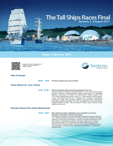 Piątek, 2 Sierpnia, 2013 Zeskanuj kod teraz i zyskaj dostęp do programu, mapki oraz oficjalnej aplikacji mobilnej! Wały Chrobrego 08:00 - 10:00 Powitanie żaglowców przez orkiestry Scena Główna (Ul. Jana z Kolna) 21:00 - 23:00 Koncert Orkiestry Filharmonii Szczecińskiej & Voo Voo. Koncert Orkiestry Filharmonii Szczecińskiej & Voo Voo W pierwszej części koncertu zabrzmią najpopularniejsze tematy zaczerpnięte ze światowej literatury muzycznej. W drugiej do filharmoników dołączy zespół VOO VOO, który zaprezentuje utwory z płyty „21” w opracowaniu symfonicznym, w tym „Flota Zjednoczonych Sił” i „Nabroiło się”. Orkiestra szczecińskiej Filharmonii zagra pod dyrekcją Michała Dworzyńskiego. Koncertowi towarzyszyć będą wizualizacje VJ PuHa, przygotowane z wykorzystaniem fotografii Radka Kurzaja, dokumentujących kolejne etapy budowy nowej siedziby Filharmonii. Dziecięca Wyspa (Plac Adama Mickiewicza) 16:00 - 19:00 Blok atrakcji dla dzieci składający się ze spektakli, koncertów, pokazów, warsztatów i zabawy ruchowych. W programie prowadzonym przez Agencję Artystyczną Kompania Marzeń m.in.: Piracka Akademia (program interaktywny oparty o fabułę wypełniony zabawami i konkursami dla widzów), występy zespołów dziecięcych z DK Klub Skolwin, interaktywny program o tematyce żeglarskiej dla dzieci, prezentacje krótkich form teatralnych dla dzieci realizowanych przez aktorów Teatru Współczesnego, Bajki Pana Brzechwy kompilacja wierszy Jana Brzechwy i piosenek z filmu Akademia pana Kleksa - w wykonaniu Jakuba Gwita. Zeskanuj kod teraz i zyskaj dostęp do programu, mapki oraz oficjalnej aplikacji mobilnej! Jarmark pod Żaglami (Wały Chrobrego, Jana z Kolna, Łasztownia) 16:00 - 01:00 Stoiska handlowe i gastronomiczne Łasztownia Island 15:00 - 20:00 Koncert: „Szczecin z całego serca polecam_Ambasador” Część I Prezentacja muzycznych Ambasadorów Szczecina (Baltic Neopolis Quartet i Michał Grobelny, Listopad, Skambomambo, Chorzy, Big Fat Mama, Damian Ukeje). Wesołe Miasteczko (ul. Jana z Kolna i Łasztownia) 16:00 - 01:00. Otwarte Sobota, 3 Sierpnia, 2013 Zeskanuj kod teraz i zyskaj dostęp do programu, mapki oraz oficjalnej aplikacji mobilnej! Wały Chrobrego 8:00 - 14:00 Powitanie żaglowców przez orkiestry 10:00 - 20:00 Zwiedzanie jednostek (Pokłady klasy A i B) od 16:00 Uroczystość otwarcia finału regat The Tall Ships Races 2013 od 24:00 Pokaz Fajerwerków Scena Główna (Ul. Jana z Kolna) 20:00 - 24:00 Gala Eska Music Awards Transmitowana przez TVP1 Wystąpią najbardziej popularni artyści polskiej sceny muzycznej: Ewelina Lisowska, Feel, Lemon, Sylwia Grzeszczak, Ewa Farna, Margaret, Honorata Skarbek i Dawid Podsiadło, laureaci dorocznych nagród EMA oraz gościnnie gwiazda światowej sceny pop Nelly Furtado. Wstęp bezpłatny Dziecięca Wyspa (Plac Adama Mickiewicza) 12:00 - 19:00 Blok atrakcji dla dzieci Spektakle, koncerty, pokazy, warsztaty i zabawy ruchowe. W programie prowadzonym przez Agencję Onomatopeja m.in.: działania interaktywne „Podróżujemy przez największe porty świata”, OPERANEK realizowany przez Operę na Zamku, warsztaty tańca, występy zespołów dziecięcych z DK Klub Skolwin, set konkursowy w języku angielskim o tematyce żeglarskiej, spektakl interaktywny pt. Bezpieczne miasto na wesoło, czyli przygody Bąbelka na drodze do przedszkola w wykonaniu Jakuba Gwita, „Magiczny las” - interaktywna bajka dla dzieci z elementami tańca i Zeskanuj kod teraz i zyskaj dostęp do programu, mapki oraz oficjalnej aplikacji mobilnej! ekologią w tle, koncert zespołu ARFIK, spektakl muzyczny w wykonaniu zespołu Zejman & Garkumpel, set konkursowy w języku angielskim o tematyce żeglarskiej. 16:00 - 19:00 Artystyczne Wyspy - strefa animacji i warsztatów dla dzieci. Wyspa Piratów (obóz piratów, zabawy pirackie), Wyspa Nauki i Techniki (wystawy i warsztaty realizowane przez Muzeum Techniki, Fundację EUREKA im. prof. Jerzego Stelmacha, Wydział Biologii Uniwersytetu Szczecińskiego oraz Centrum Edukacji Środowiskowej Wydziału Biologii Uniwersytetu Szczecińskiego w Małkocinie), Wyspa Małego Twórcy (warsztaty twórcze realizowane przez MOK Szczecin Dąbie oraz DK Klub Skolwin), Wyspa Muzyki i Teatru (warsztaty muzyczne i teatralne prowadzone przez muzyków Filharmonii Szczecińskiej, aktorów Teatru Lalek Pleciuga oraz Teatru Współczesnego), Wyspa Cyrkowców (warsztaty cyrkowe: nauka chodzenia po linie, żonglowanie itp.), Wyspa Gier (gry ogrodowe, wielkoformatowa, przestrzenna gra planszowa o Szczecinie, gry na konsoli). Wstęp bezpłatny Jarmark pod Żaglami (Wały Chrobrego, Jana z Kolna, Łasztownia)) 10:00 - 2:00 Stoiska handlowe i gastronomiczne 10:00 - 20:00 Zwiedzanie jednostek - Pokłady klasy A i B 10:00 - 21:00 Zawody sportowe dla załóg i publiczności Różne dyscypliny: piłka plażowa, piłka nożna, gry i zabawy zręcznościowe. 10:00 - 22:00 Wyspy tematyczne Prezentacja tematyczna Regionów Polski, Strefa EKO, Strefa Ryby, Wioska Wikingów (Pokazy rzemiosła, sztuk walki i życia osady Wikingów), Strefa Techniki, Strefa Sportu, Skate Park. 13:00 - 19:00 Scena folkowa: Prezentacja popularnych wykonawców z gatunku folk-rockowego MCH Trio (Praga – Czechy) Sąsiedzi (Katowice) / Stary Szmugler (Szczecin) / Stonehenge (Jastrzębie Zdrój) / Lesja folk (Szczecin) / Emerald (Szczecin) / Dair (Szczecin) / Bubliczki (Brusy - Kaszuby) / Megitza (Kraków). Wstęp bezpłatny. Łasztownia Wesołe Miasteczko (ul. Jana z Kolna i Łasztownia) 10:00 - 02:00 Otwarte Niedziela, 4 Sierpnia, 2013 Zeskanuj kod teraz i zyskaj dostęp do programu, mapki oraz oficjalnej aplikacji mobilnej! Park Żeromskiego 11:00 Pokazy musztry orkiestrowej (okolice ul. Plantowej). 13:00 Nabożeństwo Ekumeniczne 10:00 - 20:00 Zwiedzanie jednostek (Pokłady klasy A i B). 16:00 - 17:30 Parada załóg i orkiestr. Marsz ulicami miasta z Wałów Chrobrego do Teatru Letniego. Po dotarciu na miejsce odbędzie się Teat